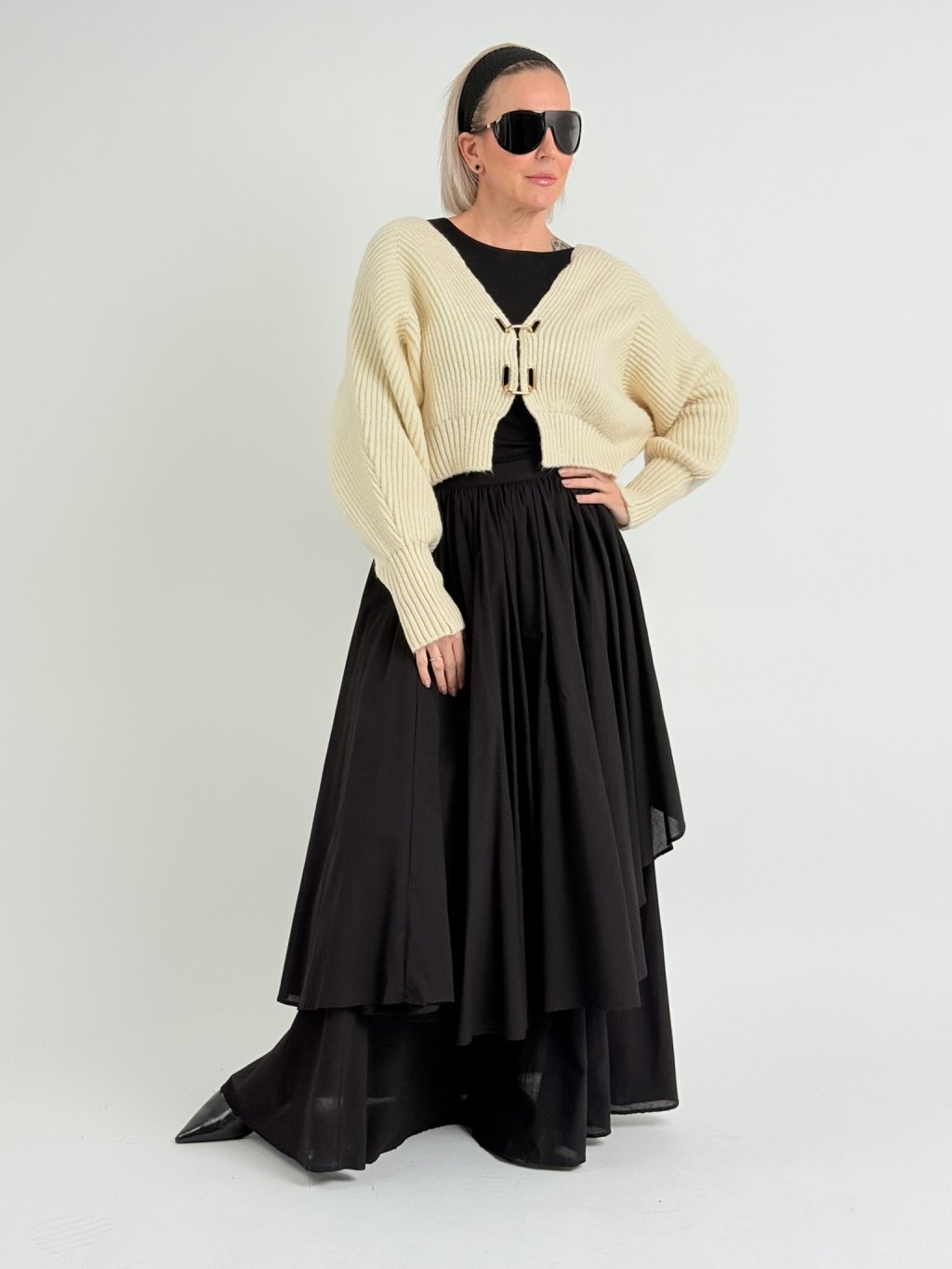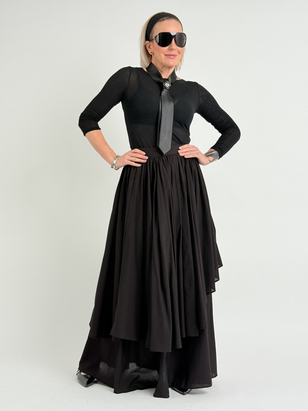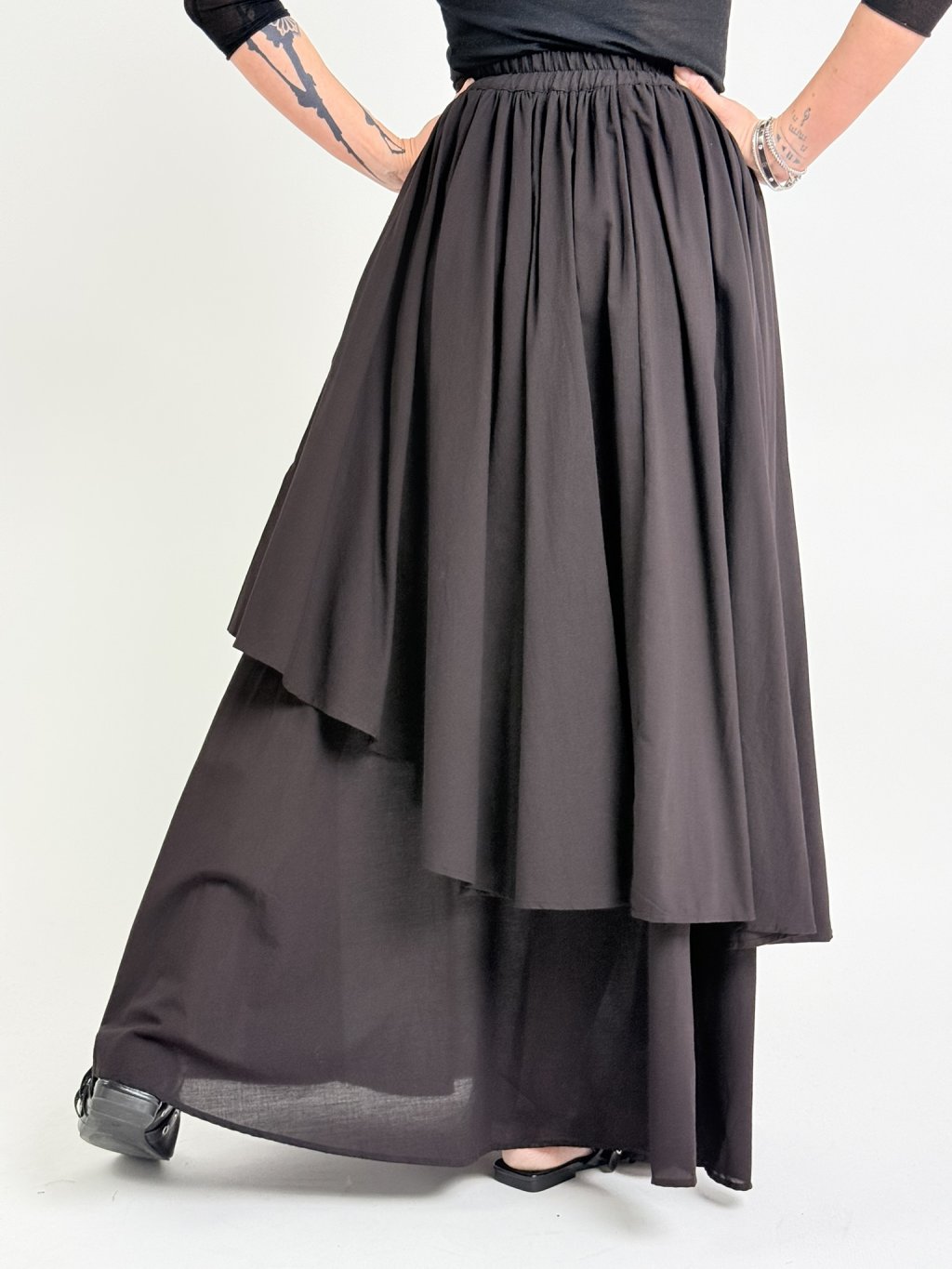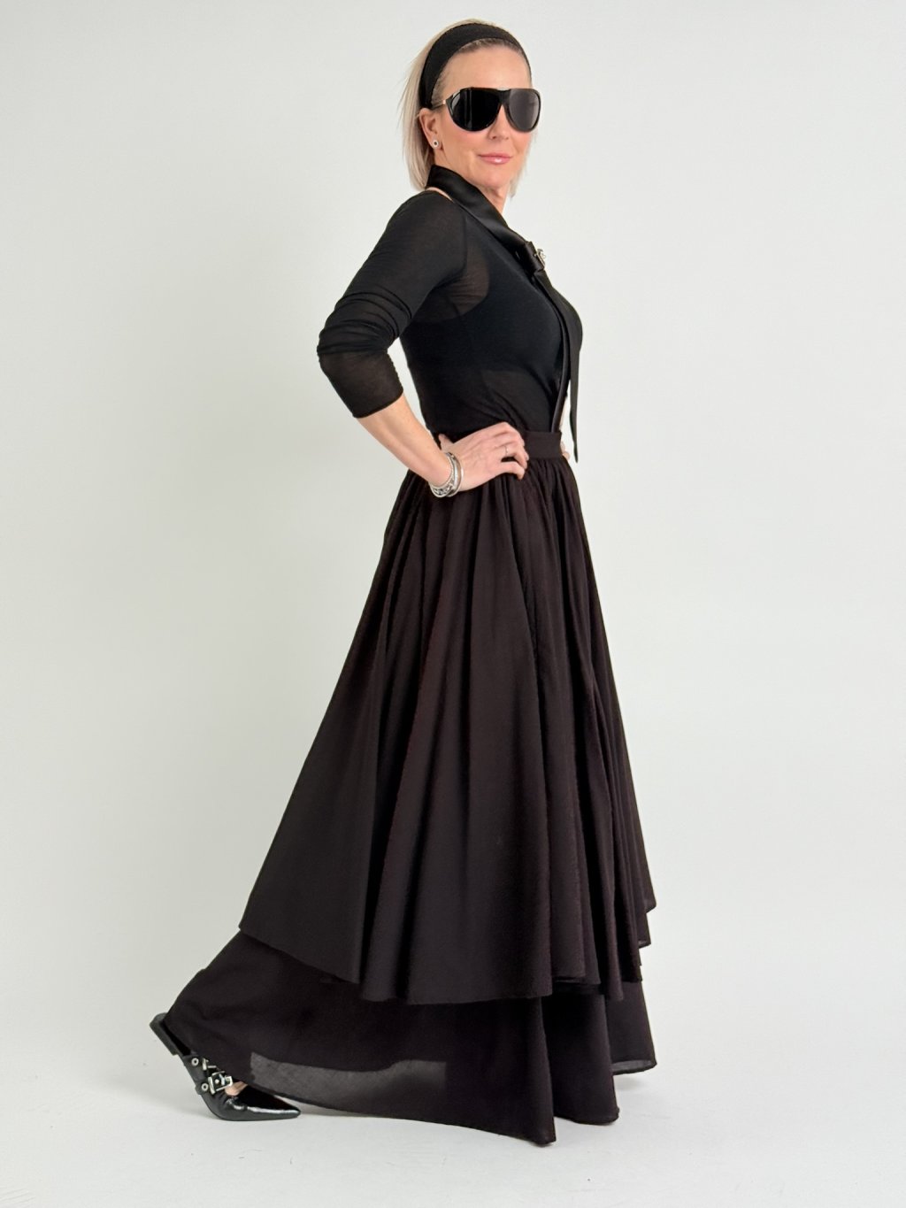 Dlouhá,  kolová, lehká, dvojitá sukně se spodní sukní delší, vrchní kratší, v zadní části pasu do gumy, se zipem.