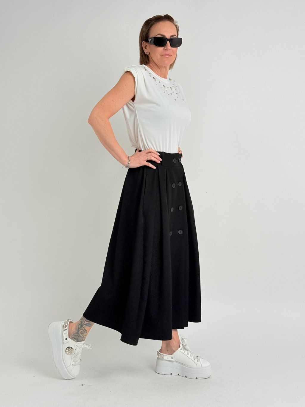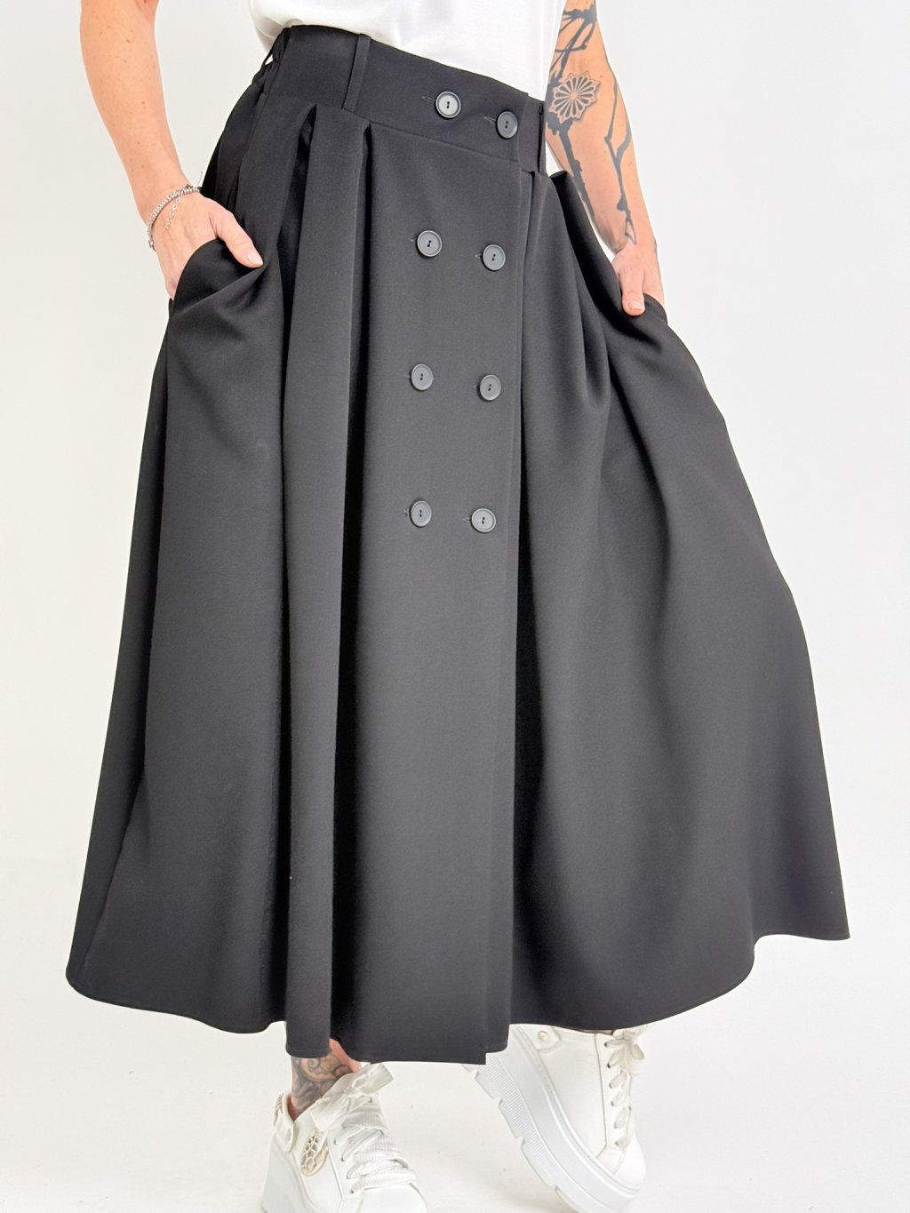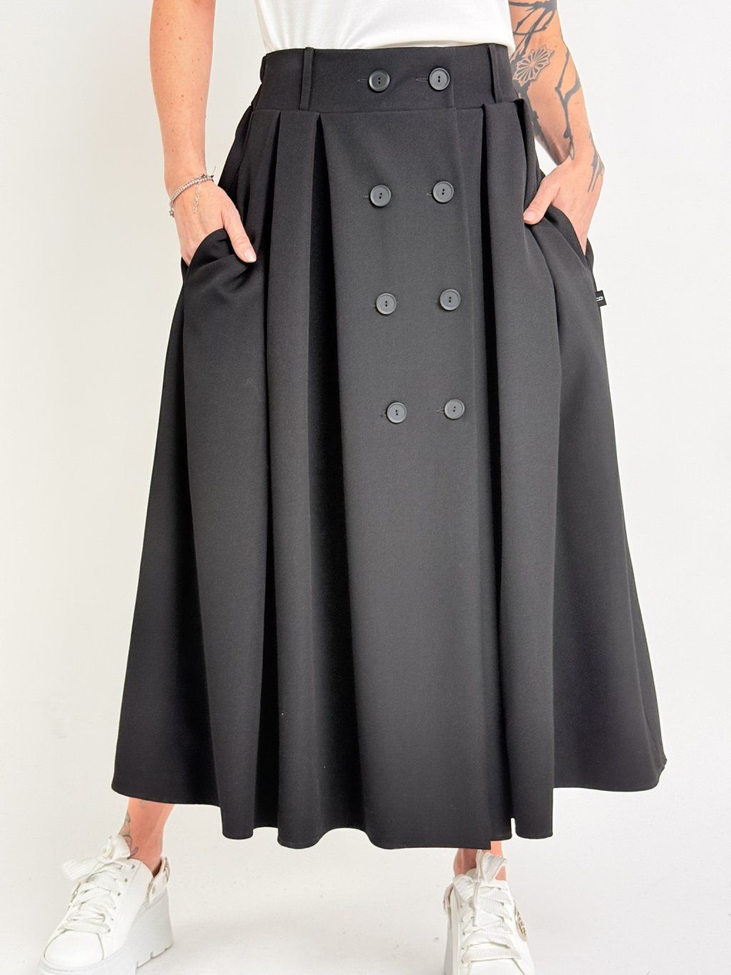 Úžasná sukně v pase do sámků, v zadní části pasu do gumy, vpředu propínací dvěma řadami knoflíků.