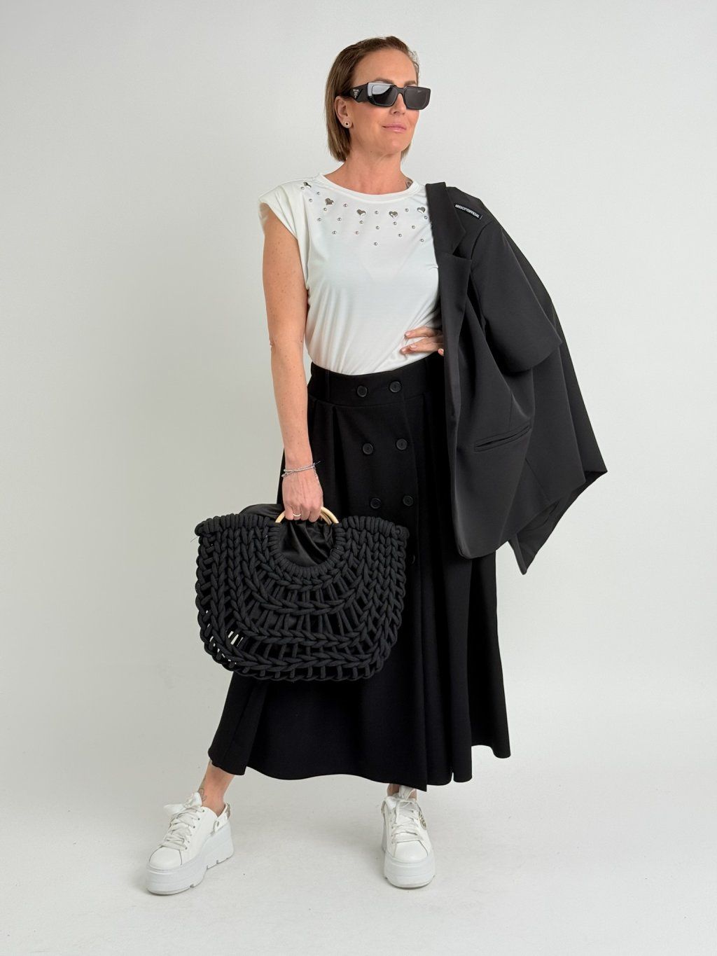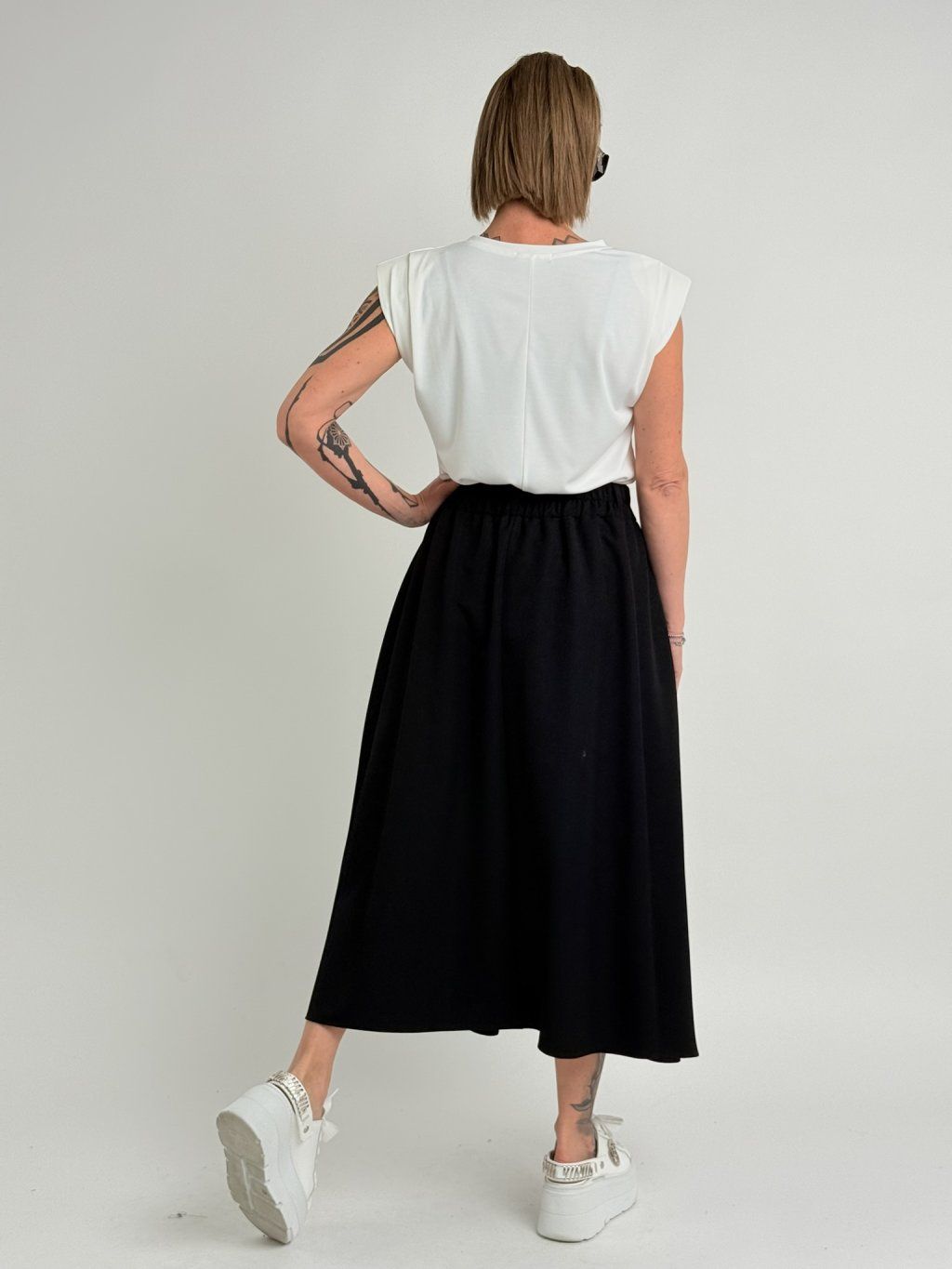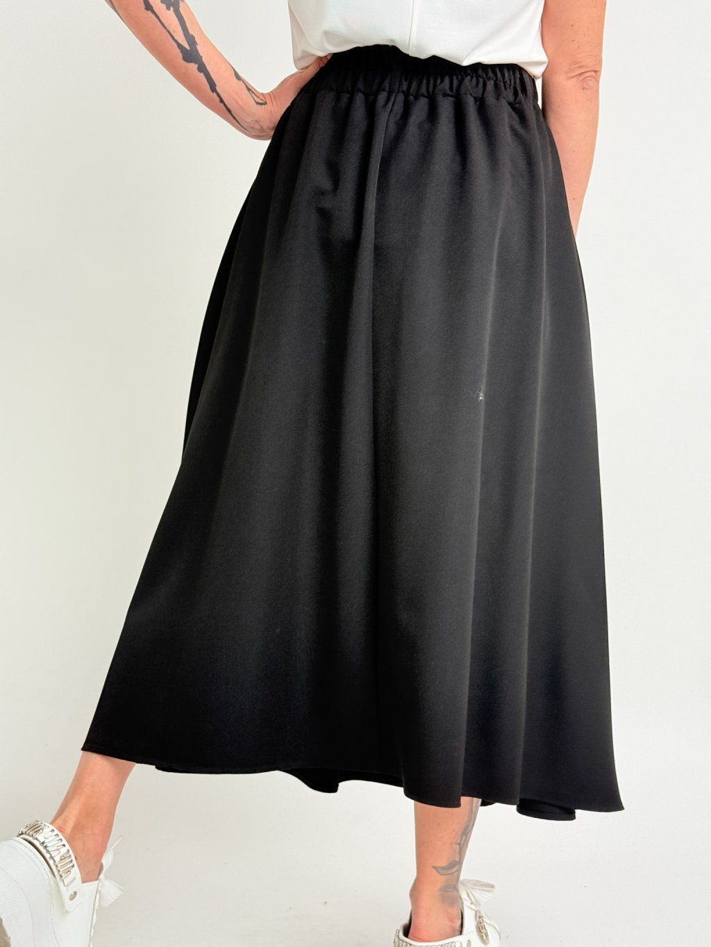Úžasná sukně v pase do sámků, v zadní části pasu do gumy, vpředu propínací dvěma řadami knoflíků.