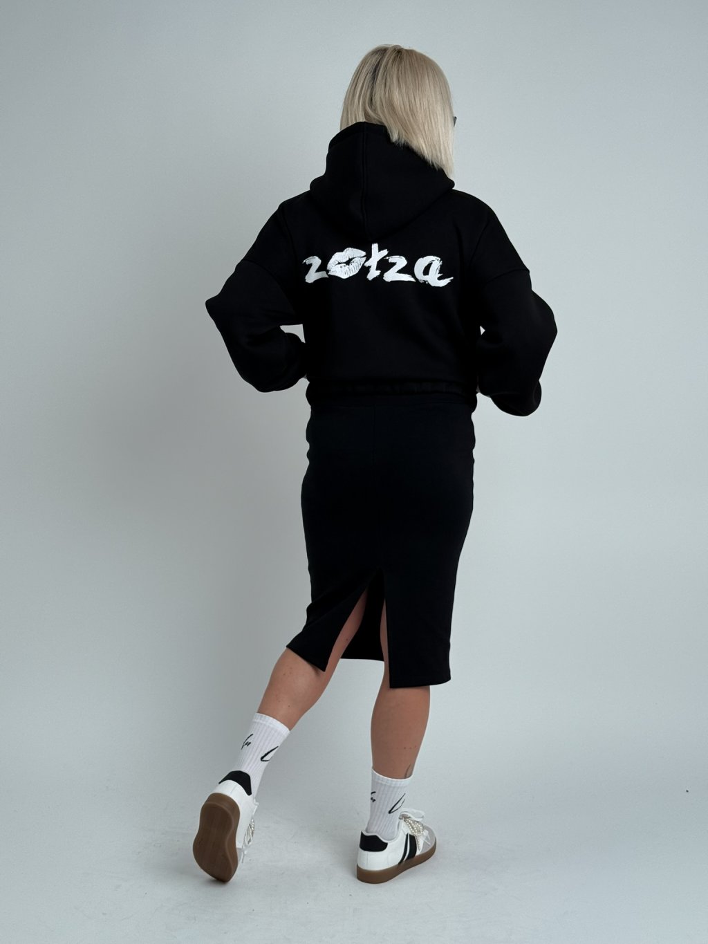 Skvěle padnoucí, rovná, pružná,vroubkovaná sukně se širokým nápletem v pase a rozparkem na zadním dílu.