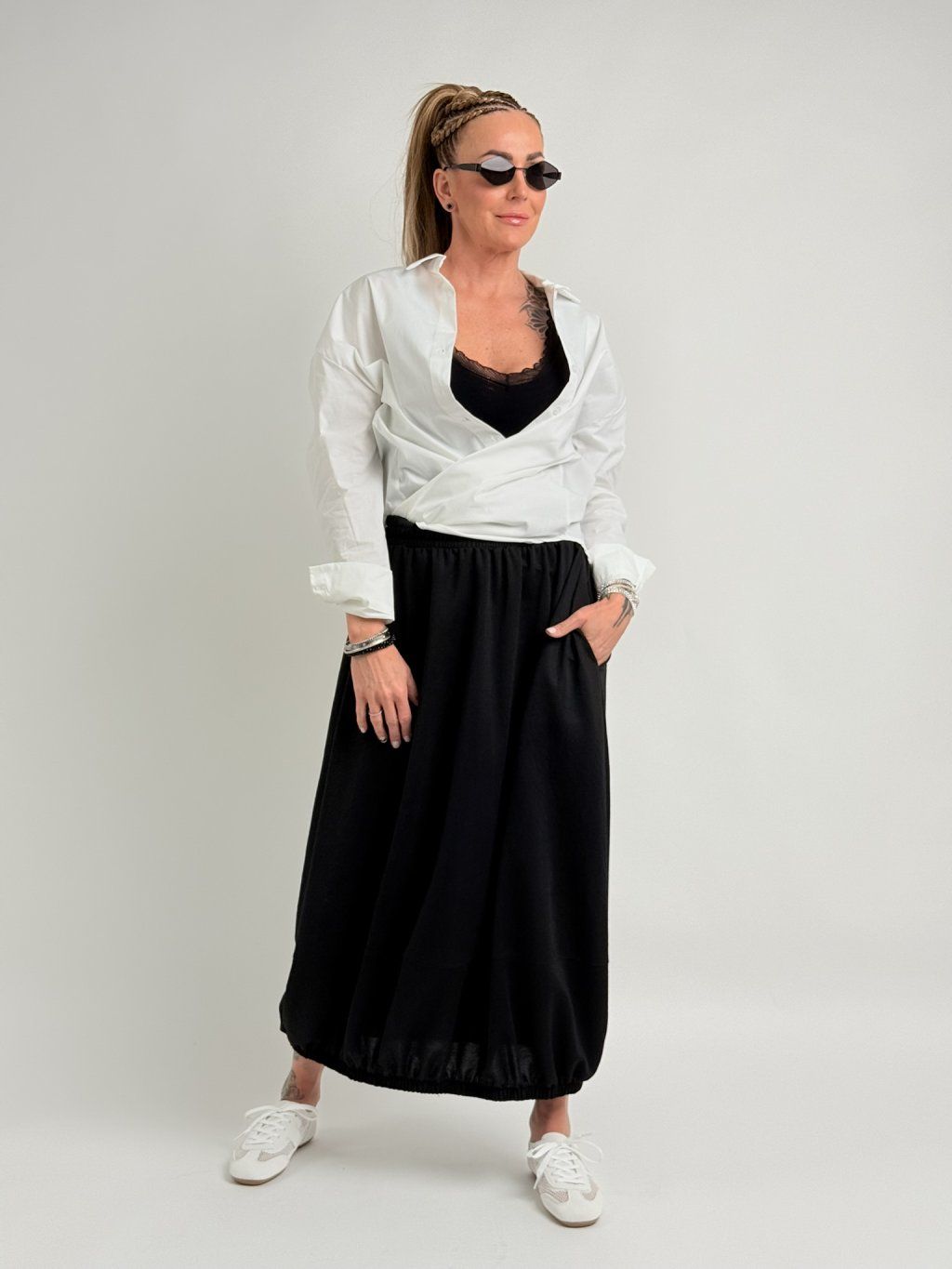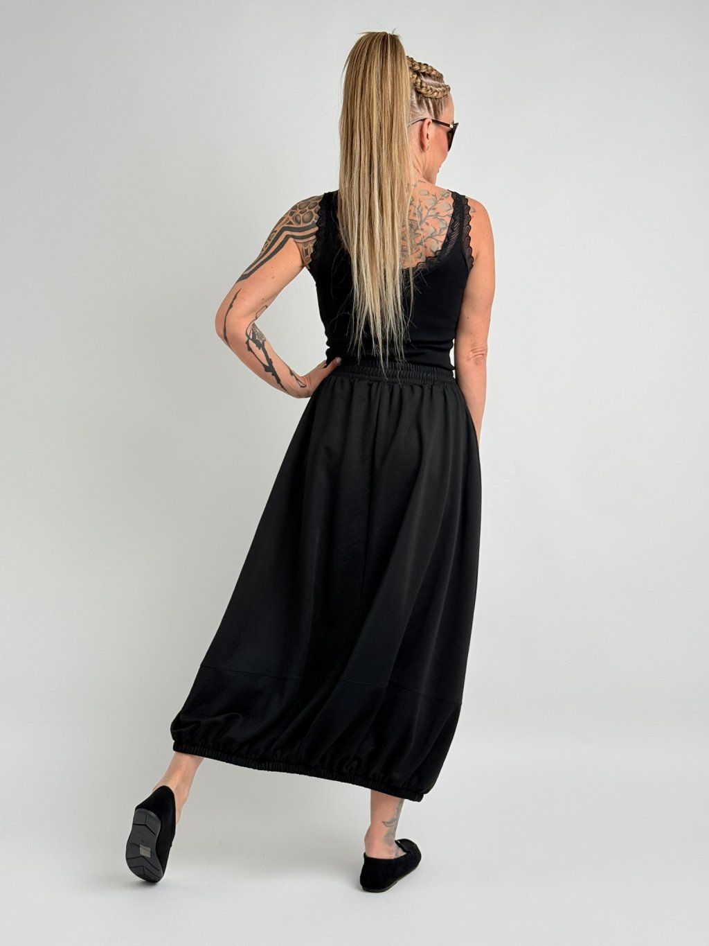 Sukně v balónovém střihu, s postranními kapsami, s pasem i dolním krajem do gumy.