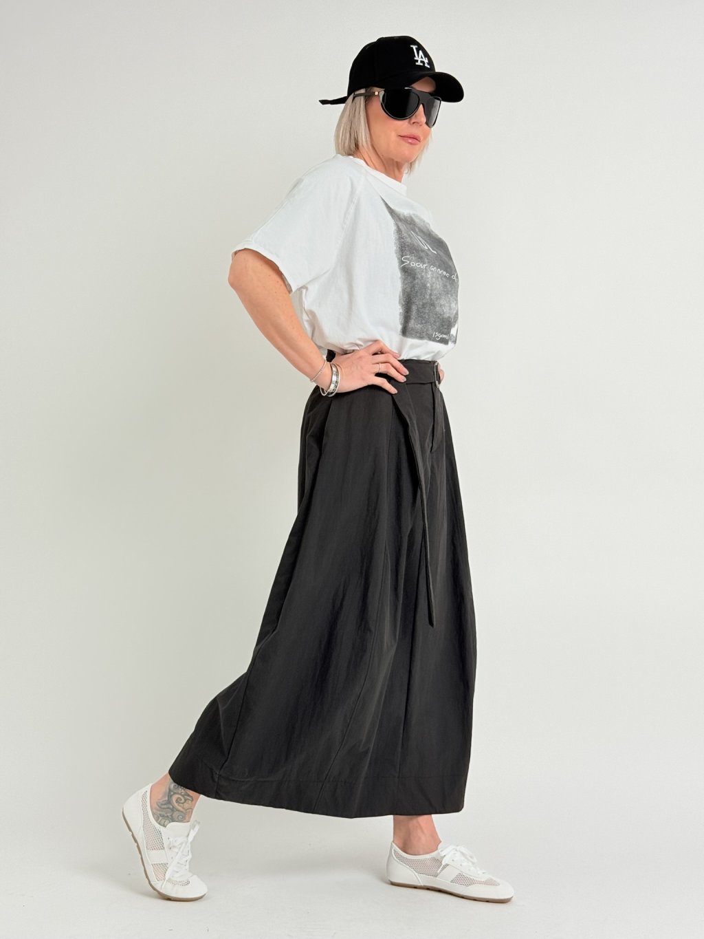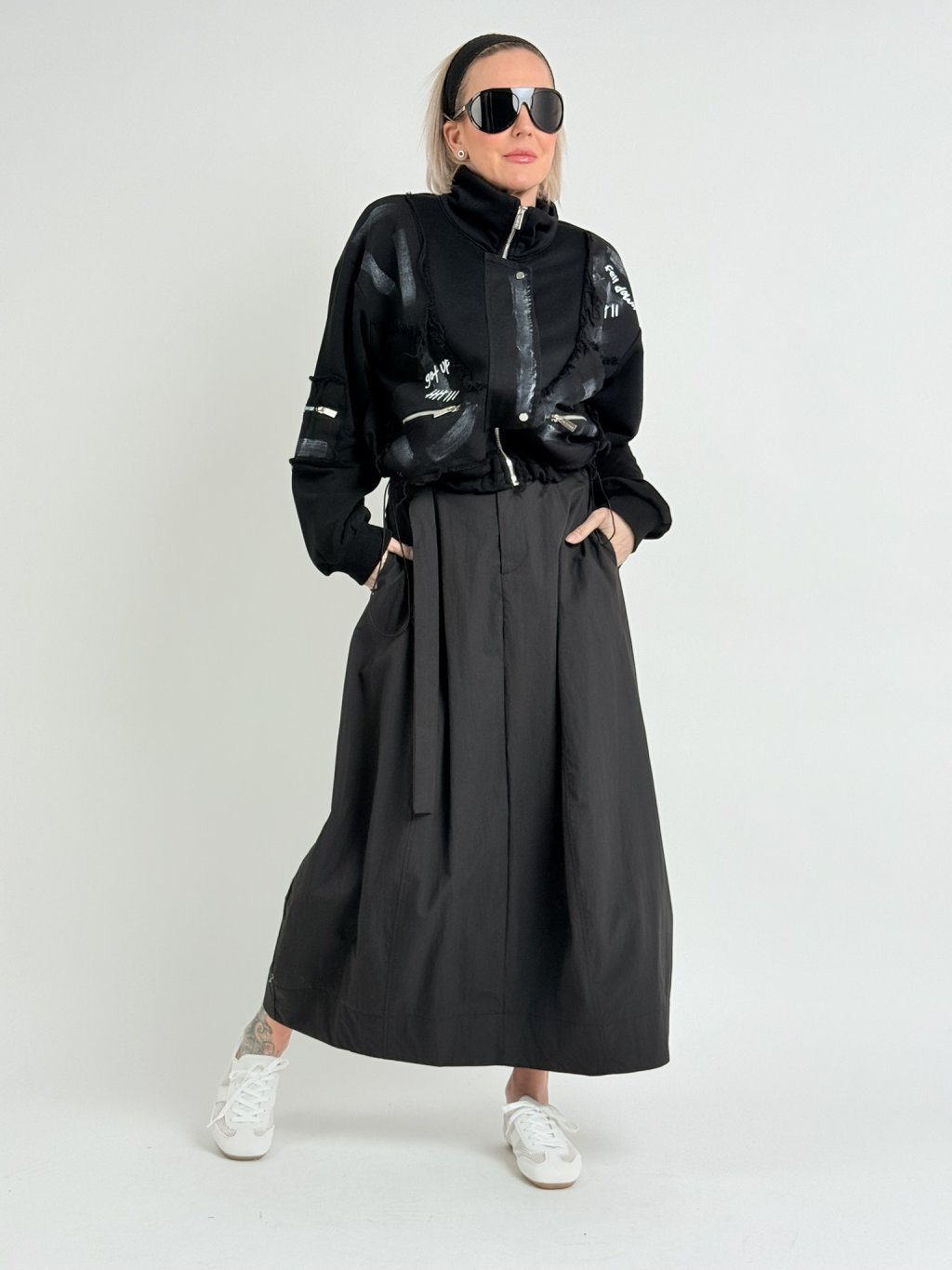 Luxusní, balonová sukně, v zadní části pasu s gumou a páskem se sponou. vpředu jsou všité kapsy a poklopec se zipem.