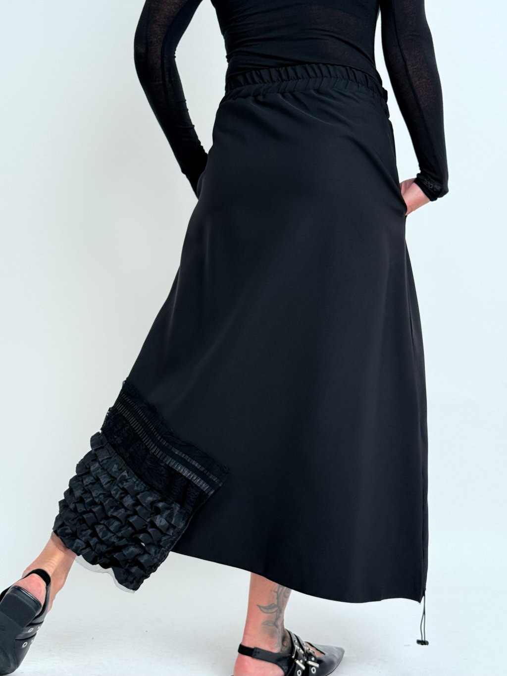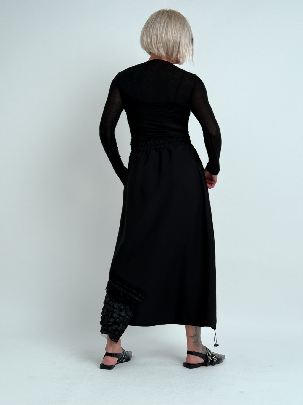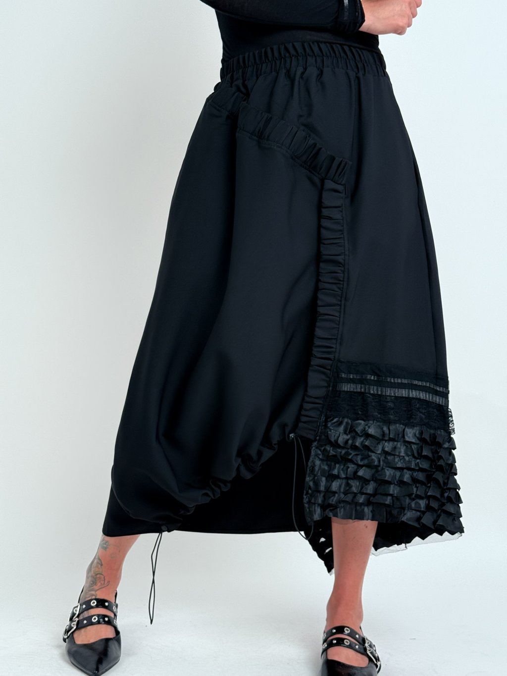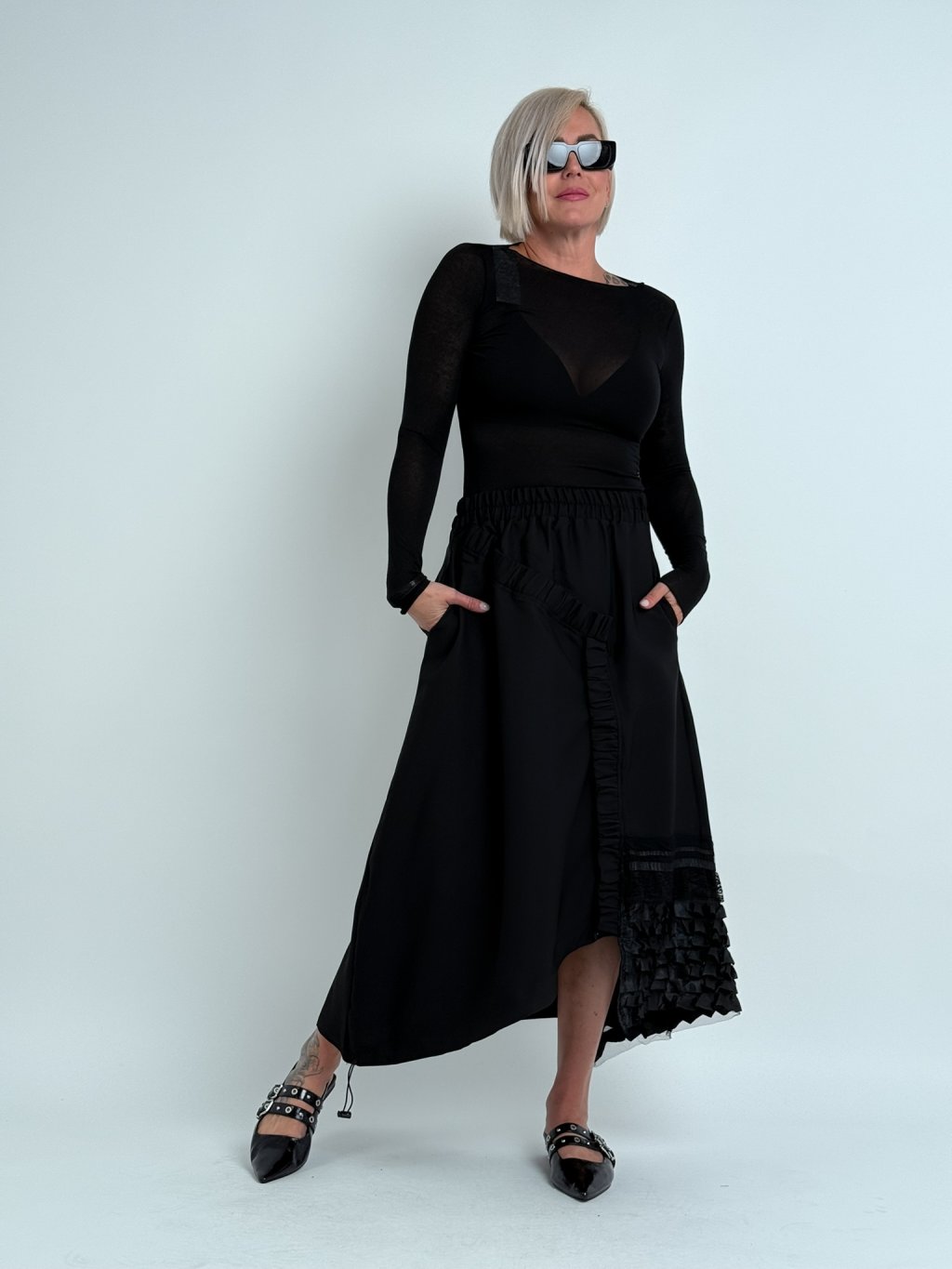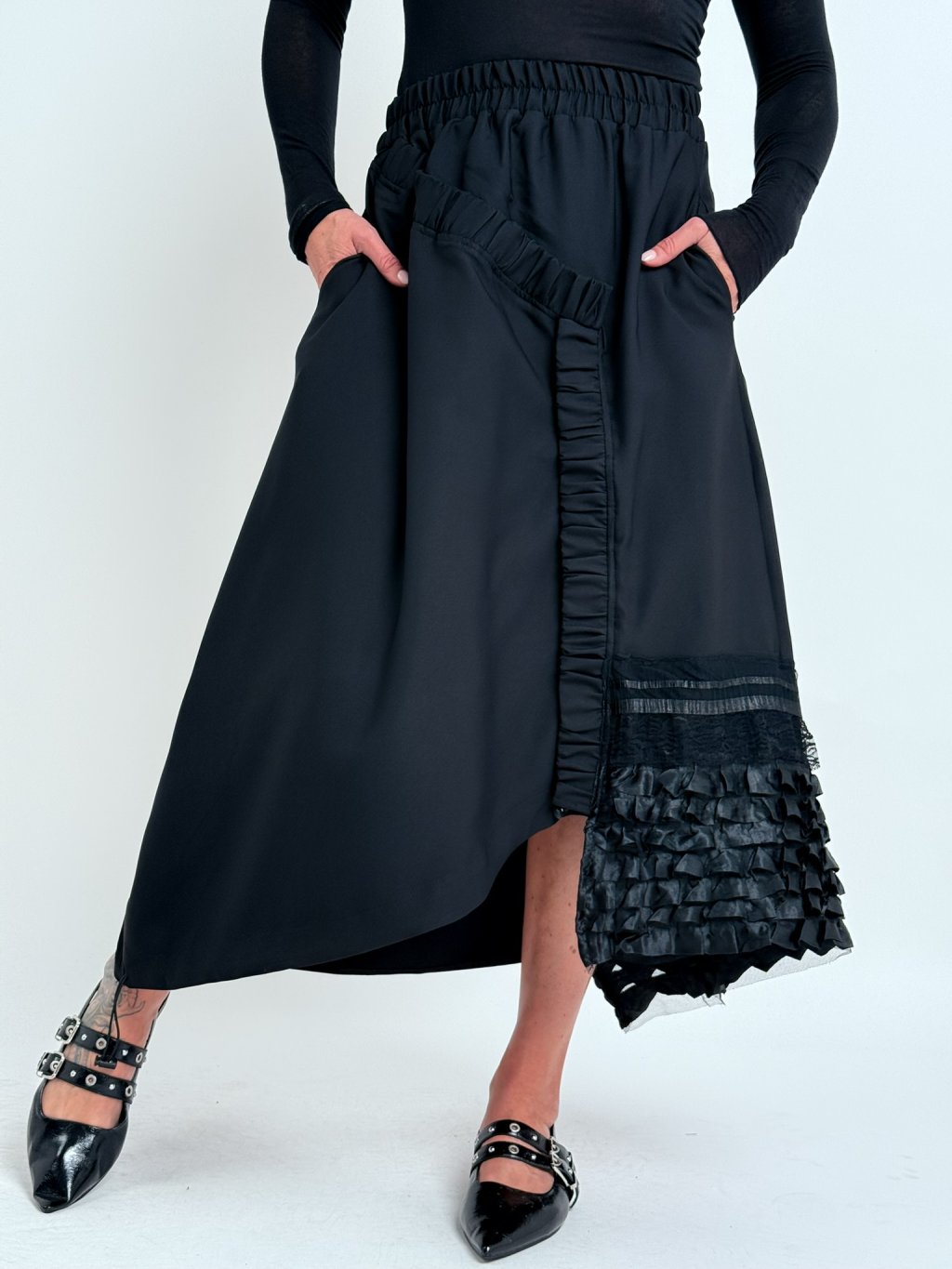 Dokonalá, asymetrická sukně v kombinaci několika vzorů látek, v pase do gumy, s postranními kapsami a možností regulace šířky předního dílu.