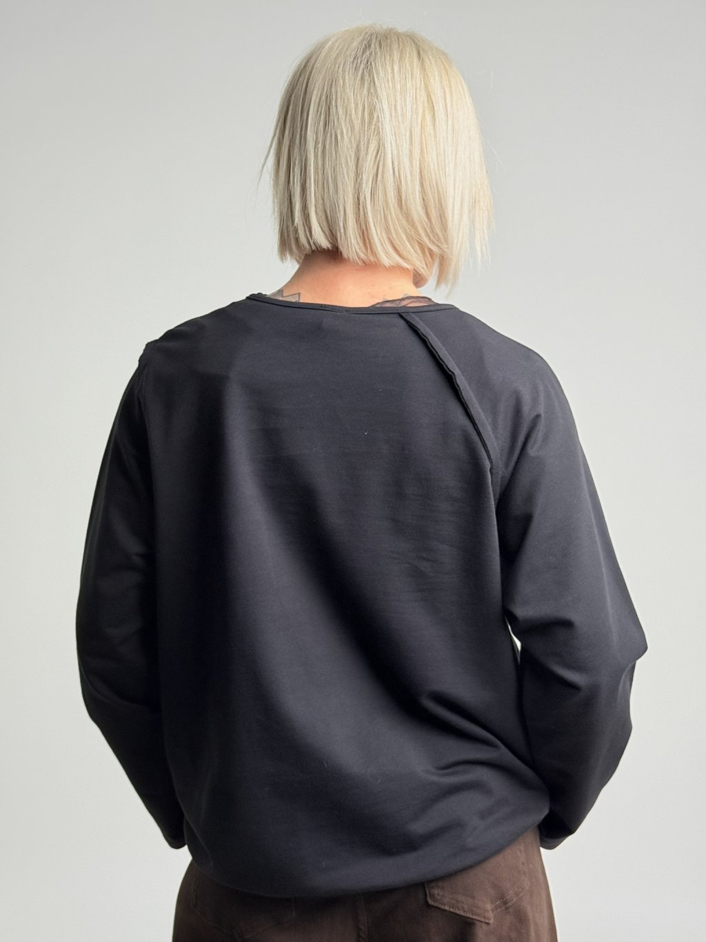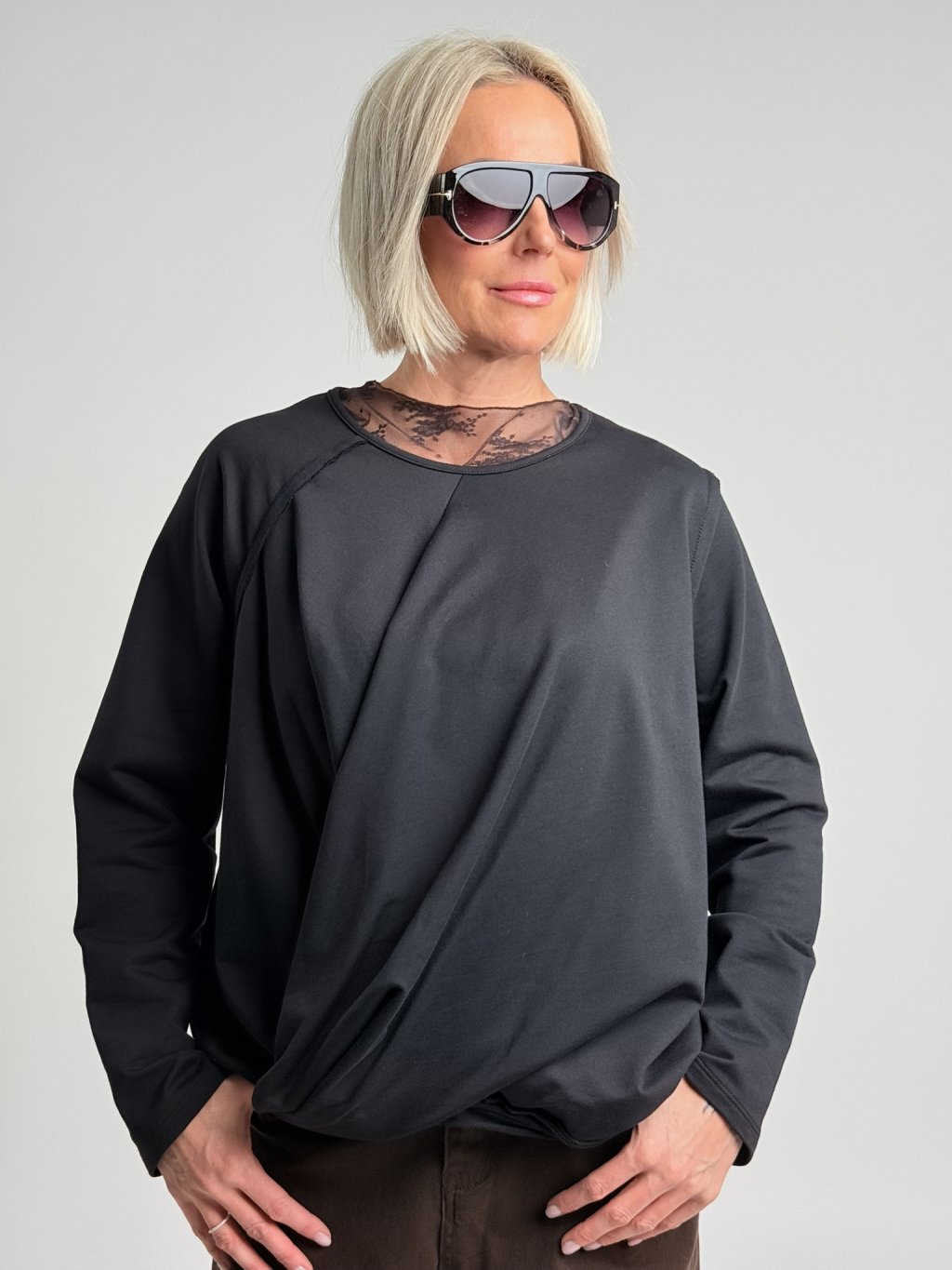 Zajímavě řešená tunika s přeloženým předním dílem a dlouhým, raglánovým, ohrnutým rukávem.