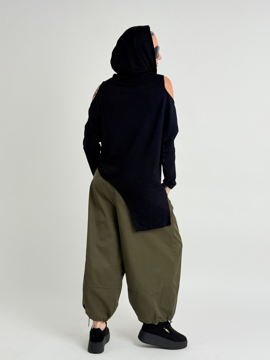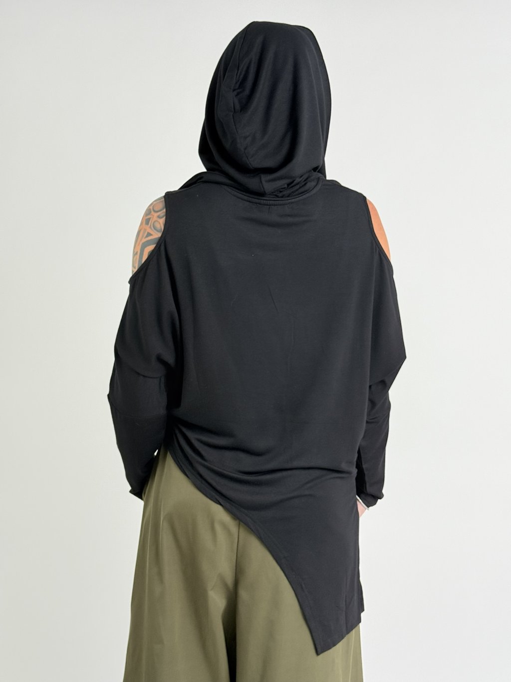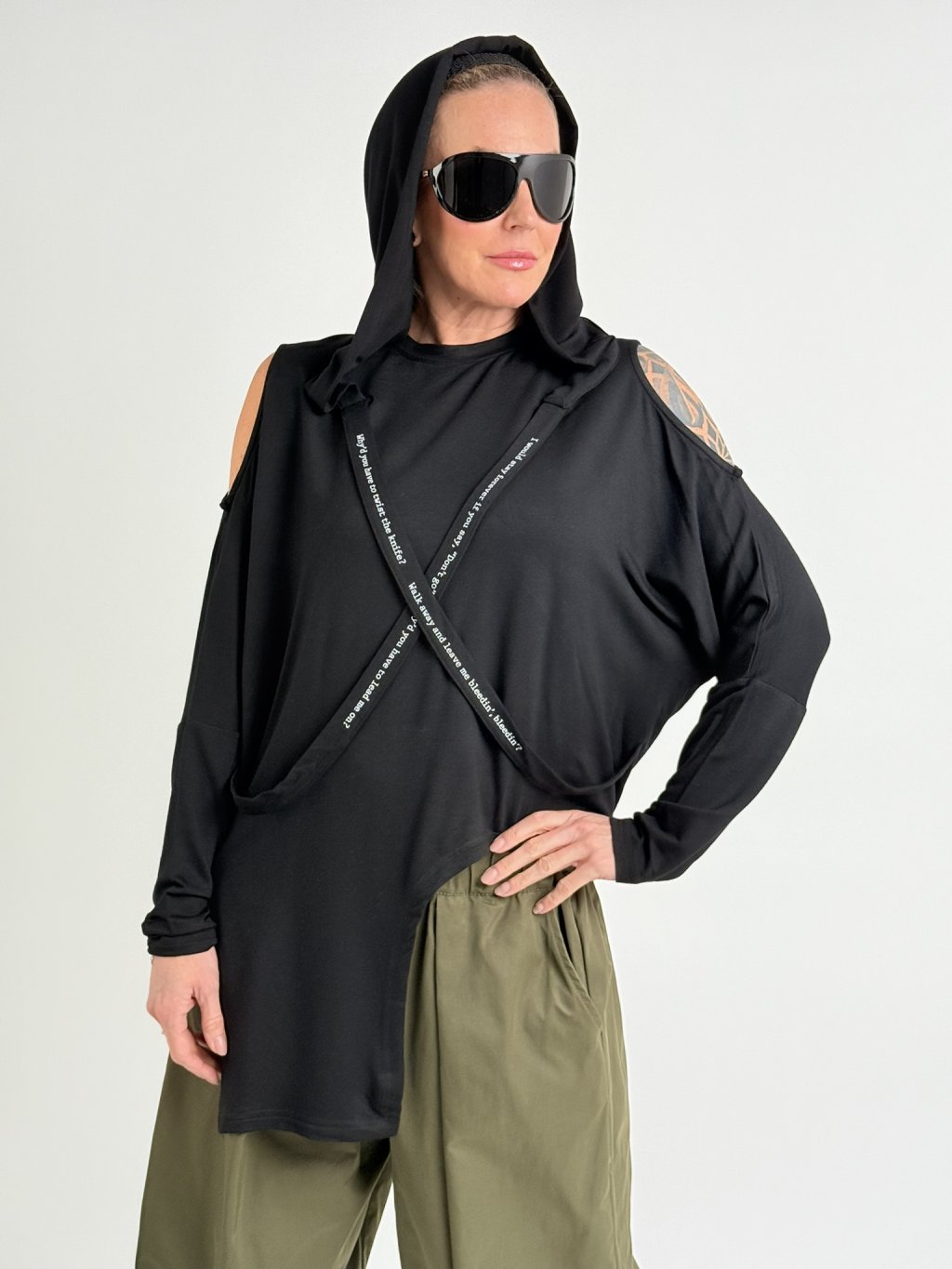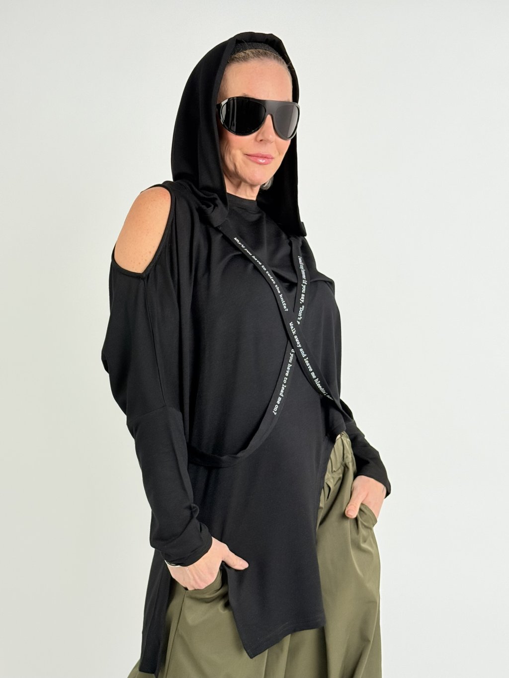 Slabší, volnější mikinové triko s průstřihy na ramenou, s ozdobnými pásky s potiskem a velkou kapucí. MĚŘTE, OBLEČENÍ TÉTO ZNAČKY ODPOVÍDÁ VĚTŠÍM VELIKOSTEM, NEŽ JE UVEDENO!!!!