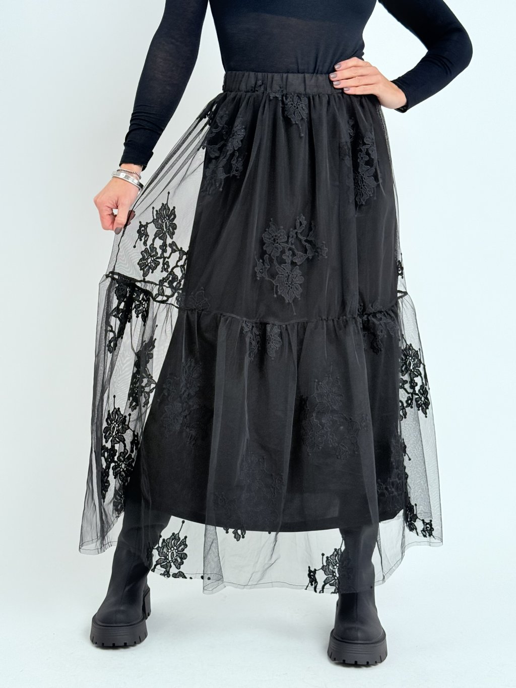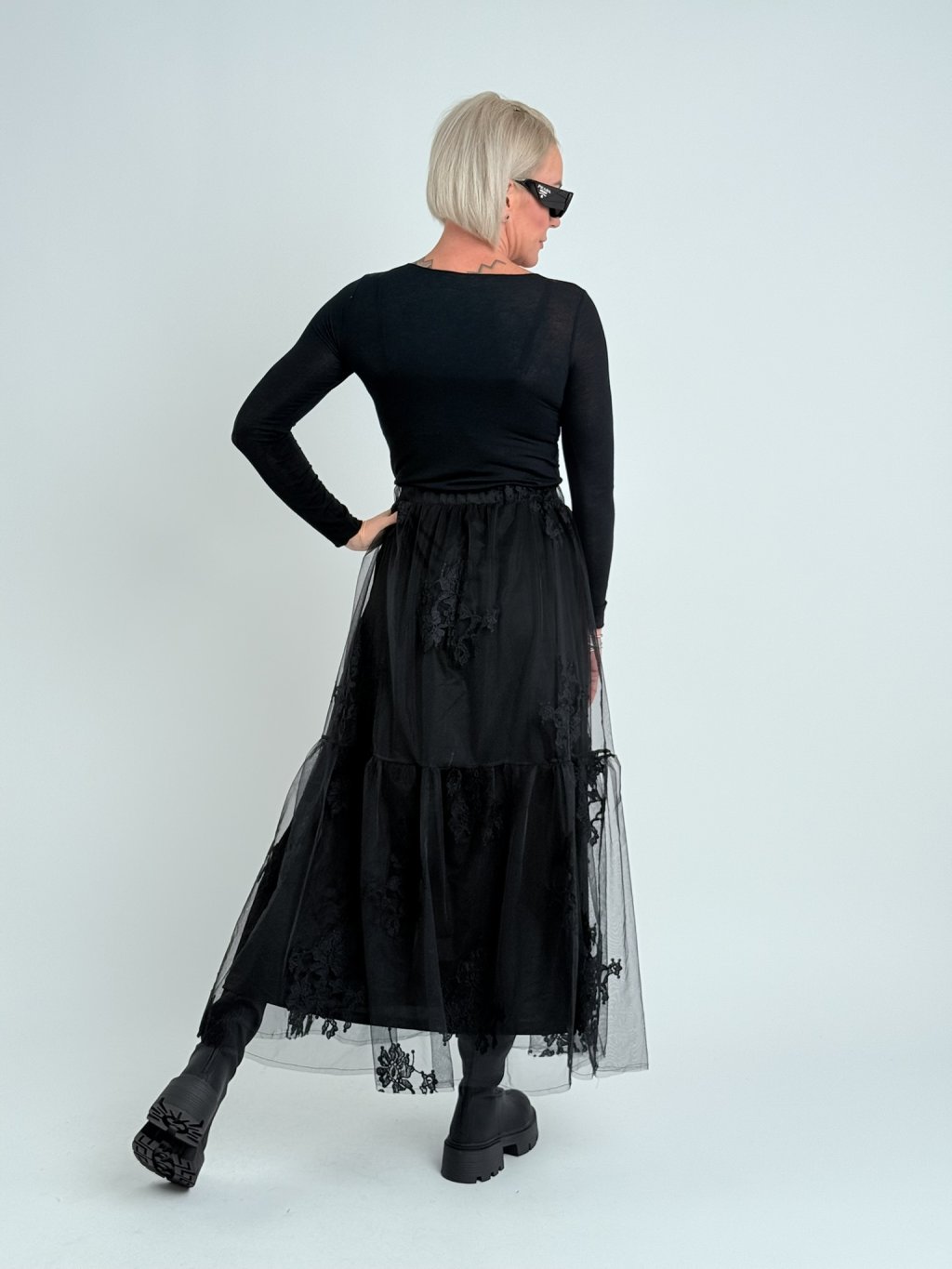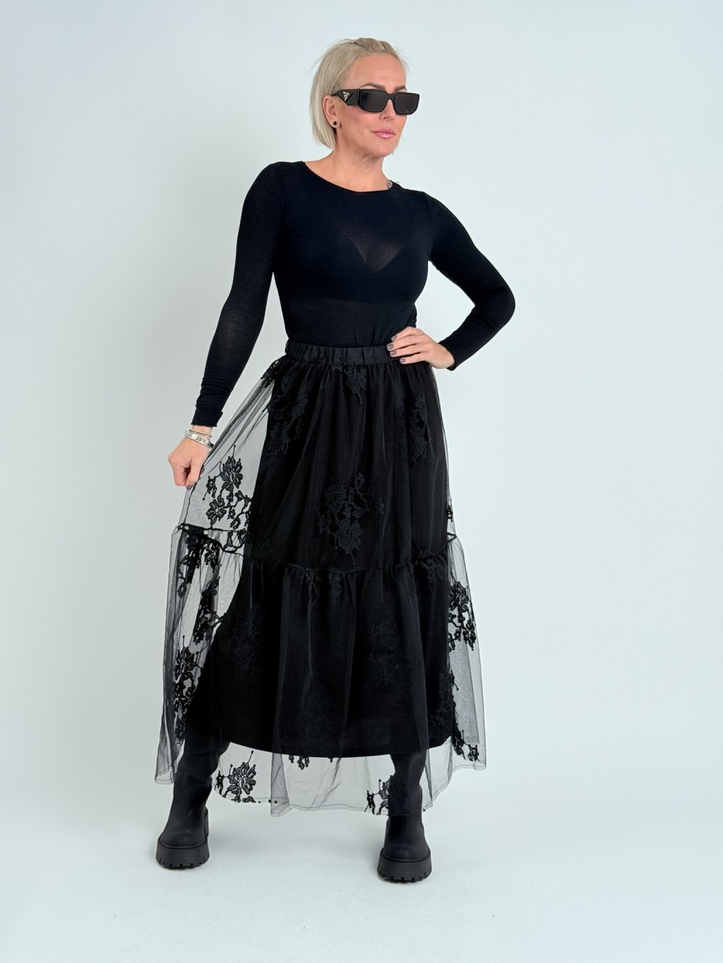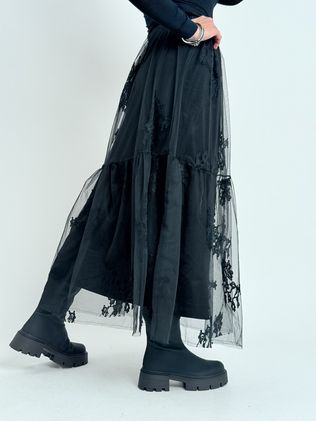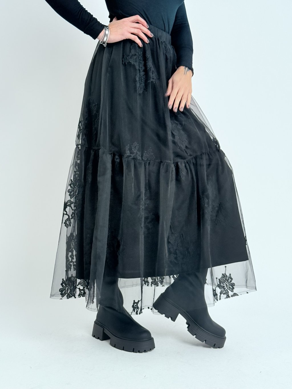 Luxusní, dlouhá, tylová sukně s plastickým vzorem, v pase do gumy.