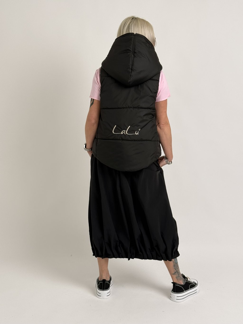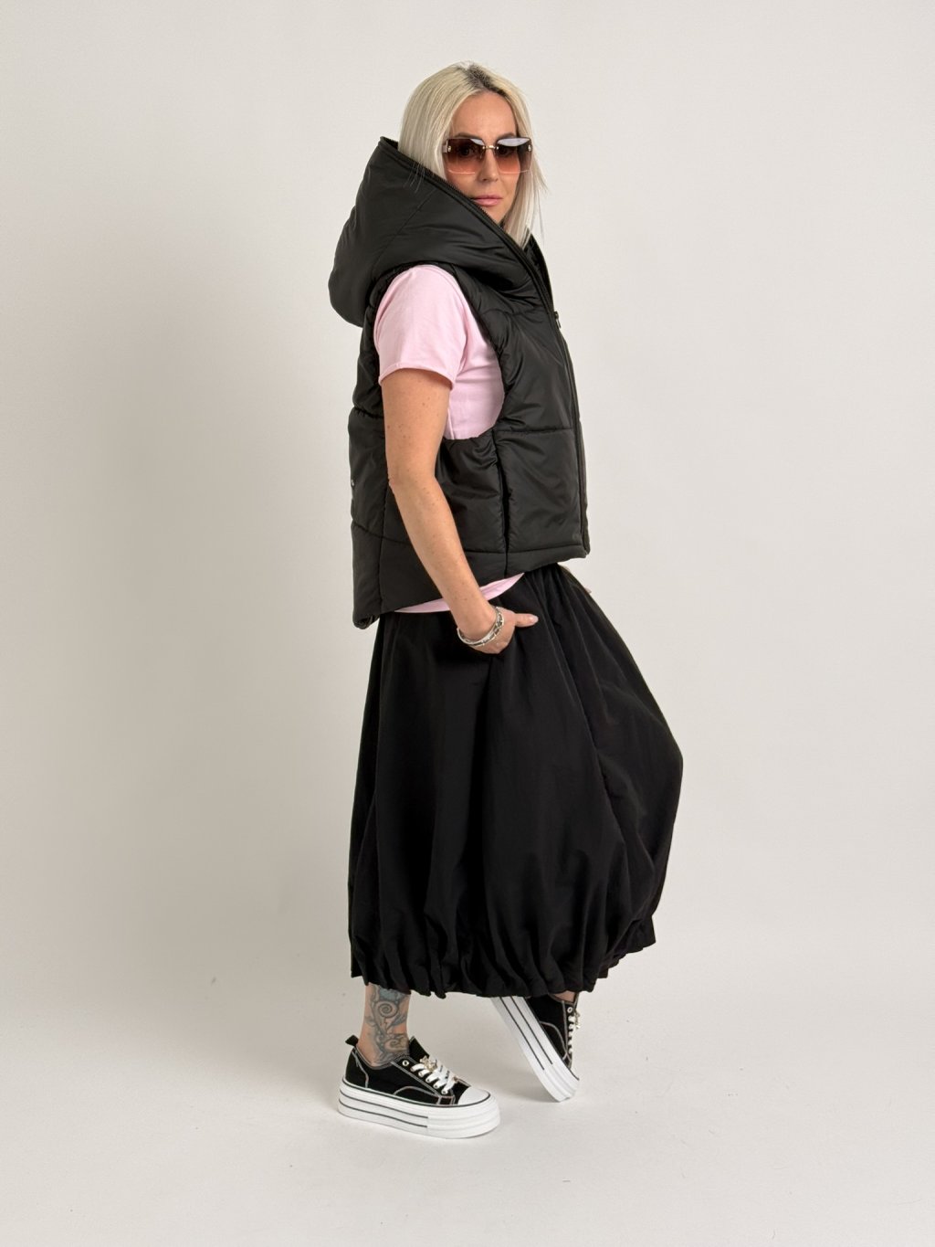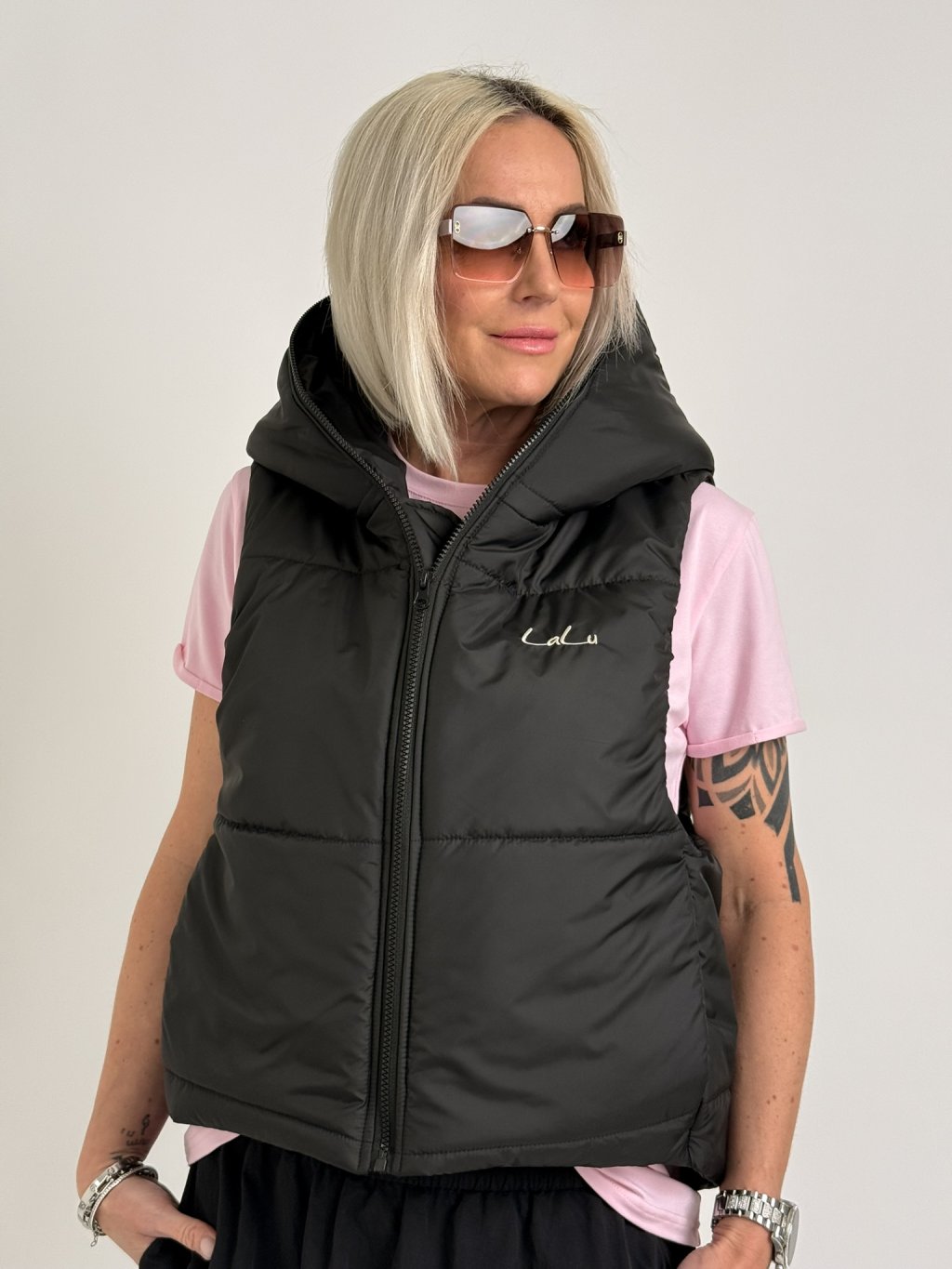 Dokonalá, prošívaná vesta se zapínáním na zip, který prochází celou kapucí, kratším předním a delším zadním dílem a hlubokými průramky. Vhodná i na vrstvení.
