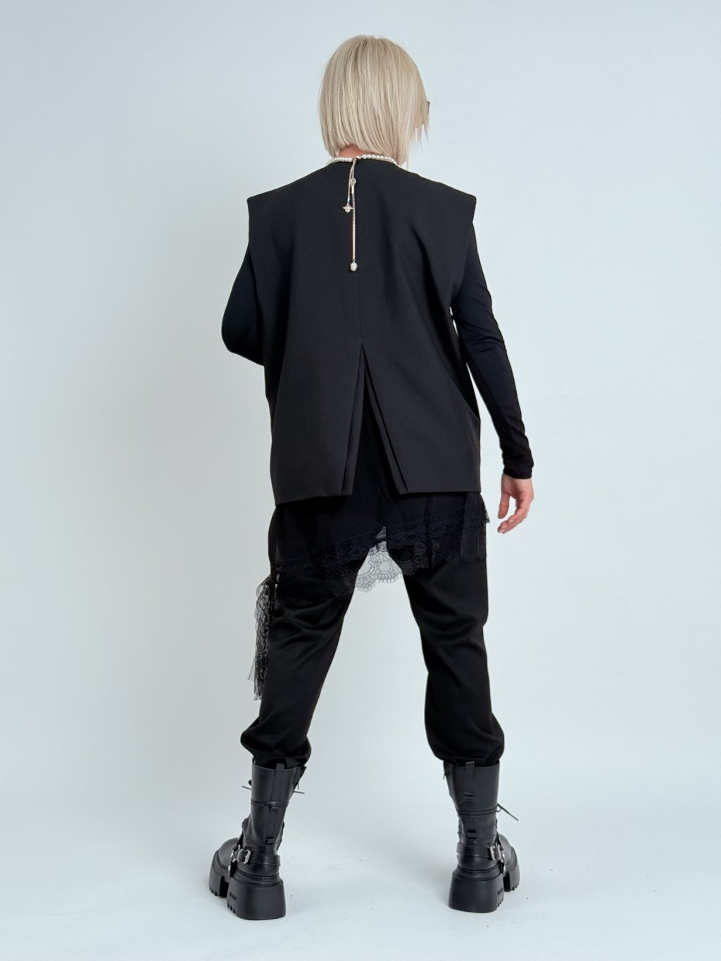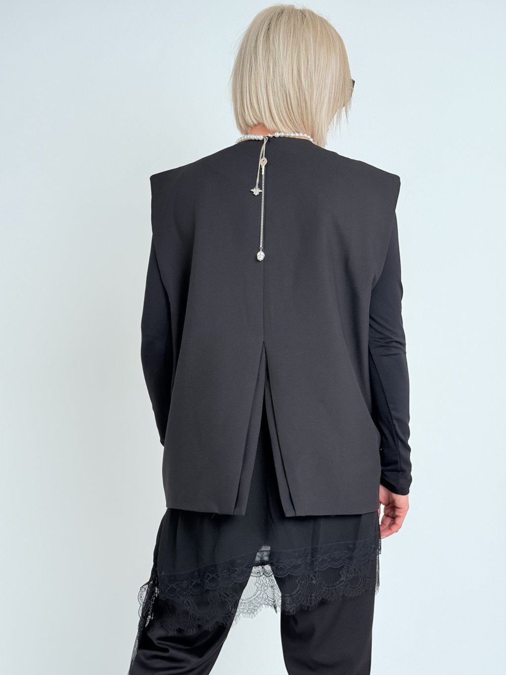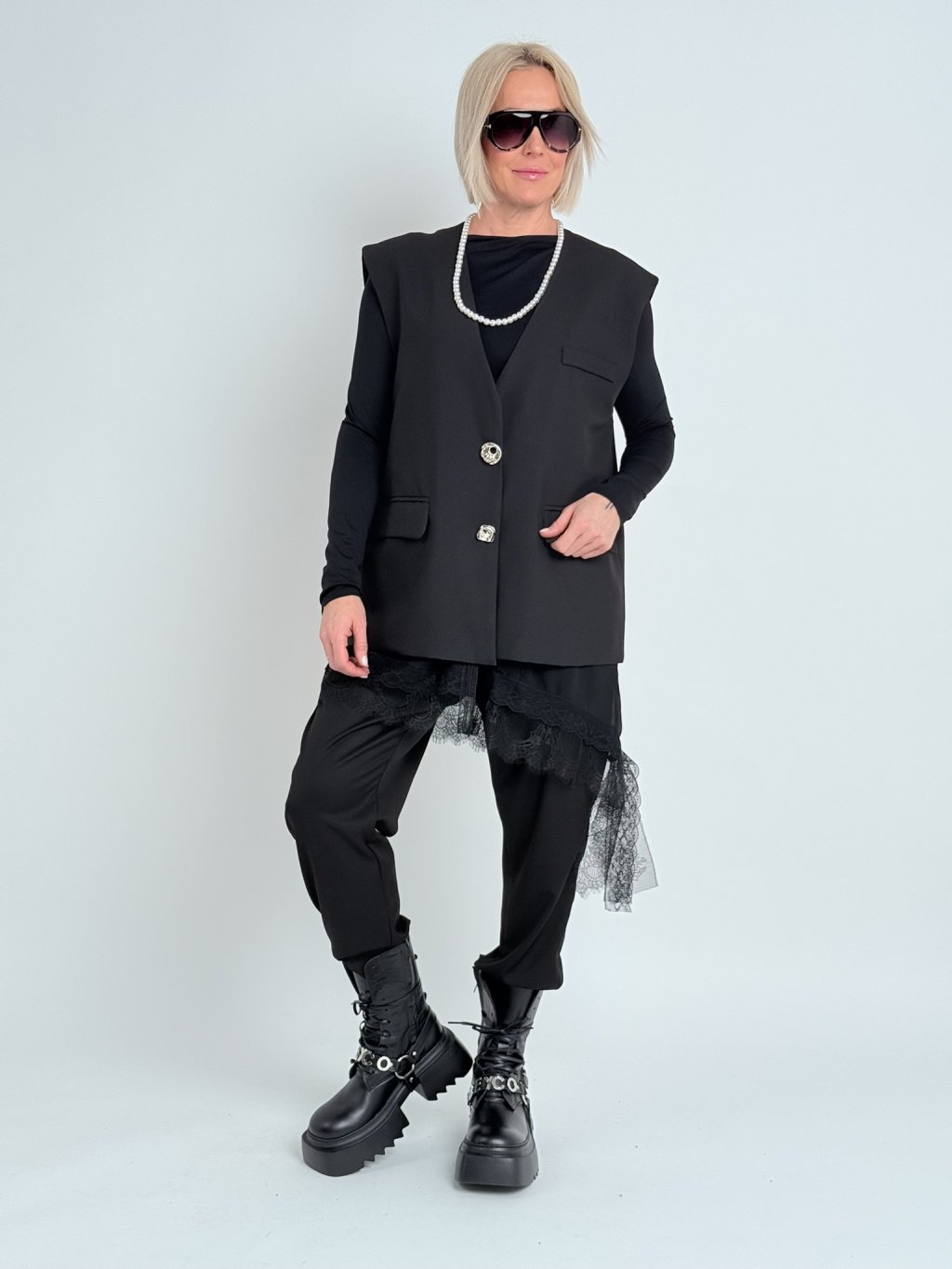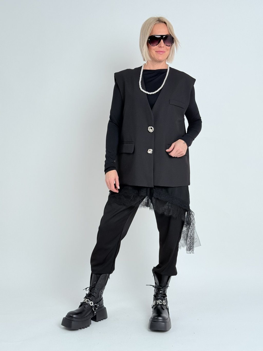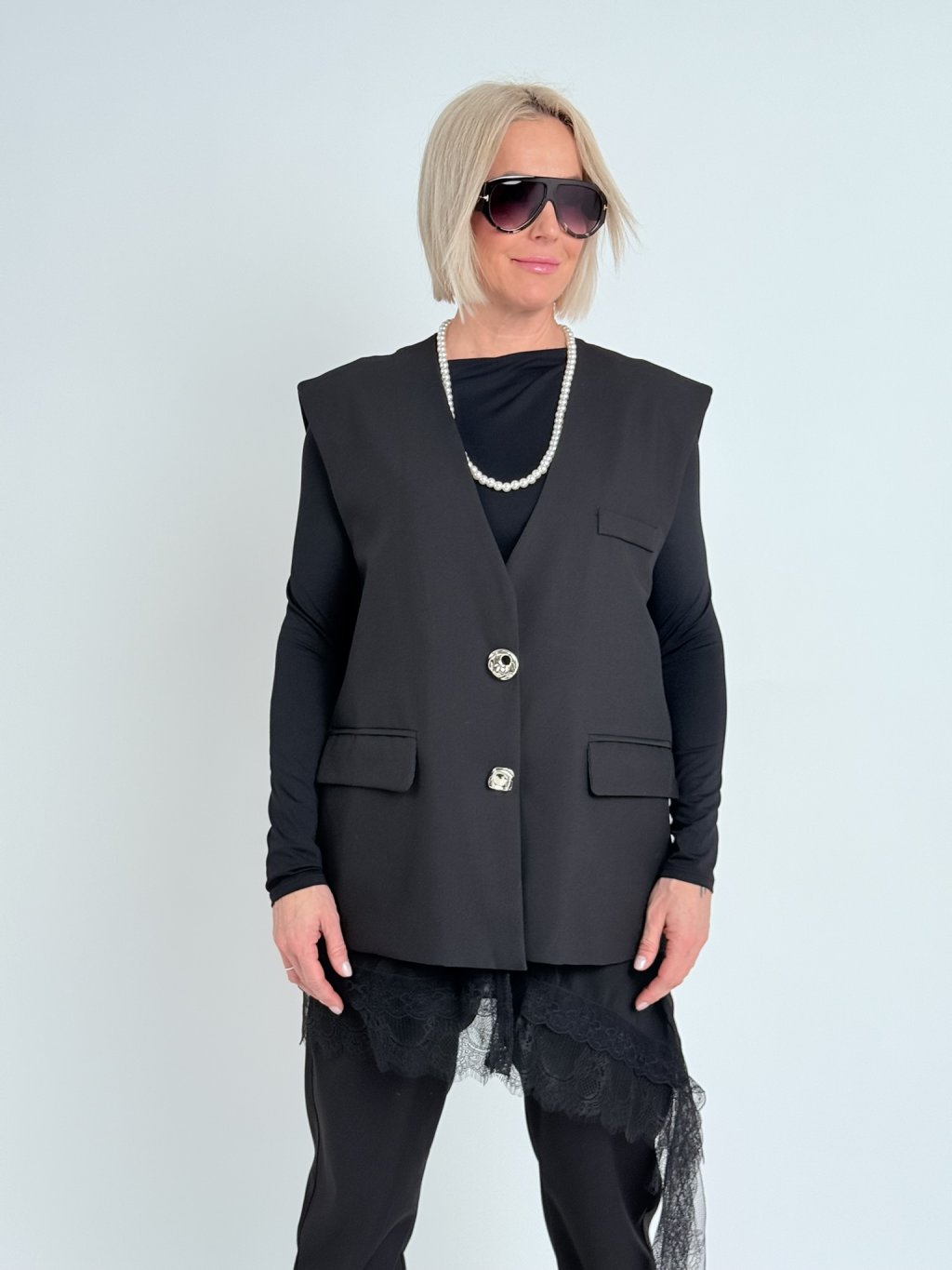 Luxusní, oversize vesta s podšívkou a vykukující saténovou spodničkou s krajkou, se zapínáním vesty na velké, stříbrné knoflíky., Součástí je i perlový náhrdelník, který lze nosit i jako pásek.