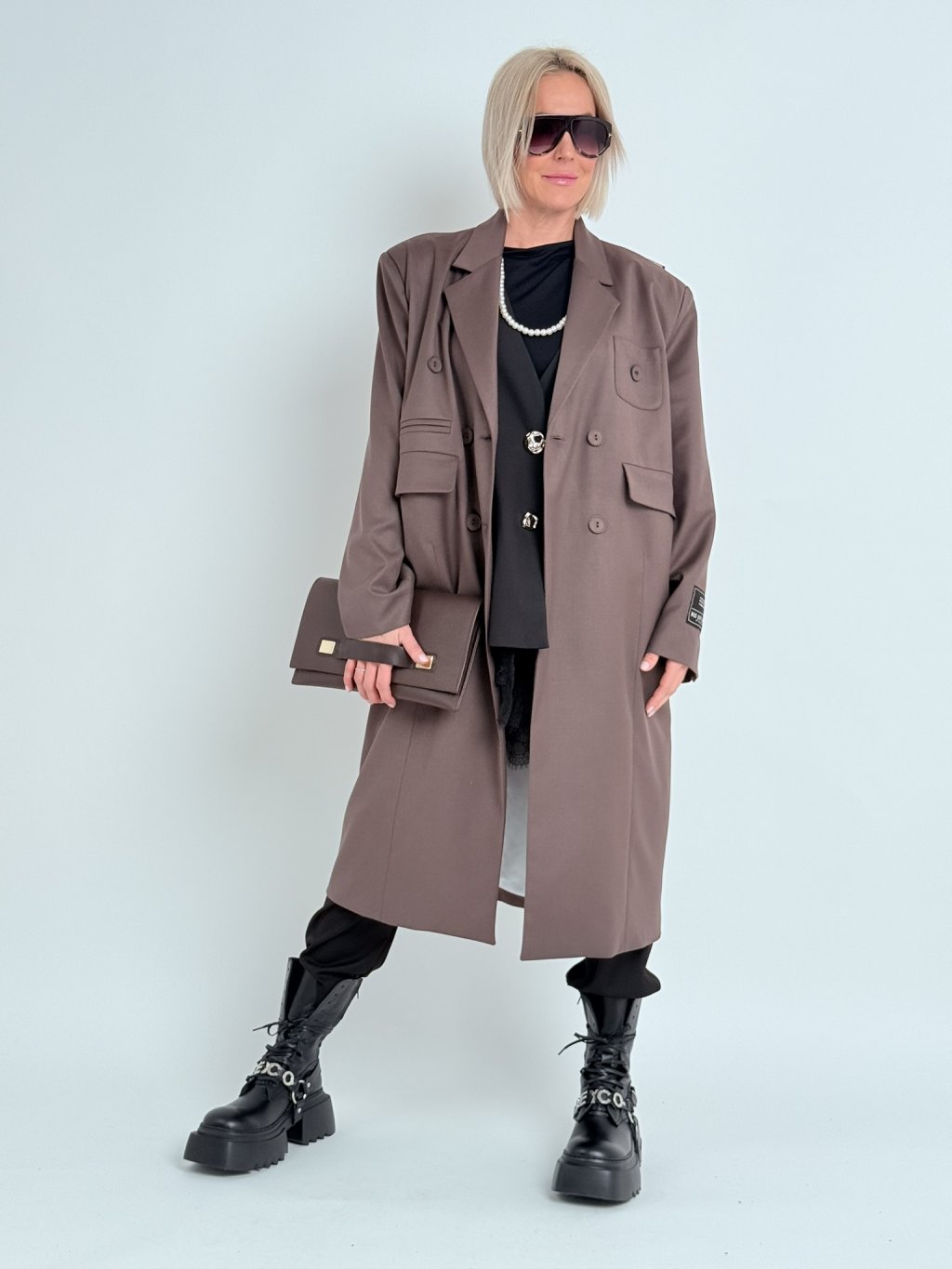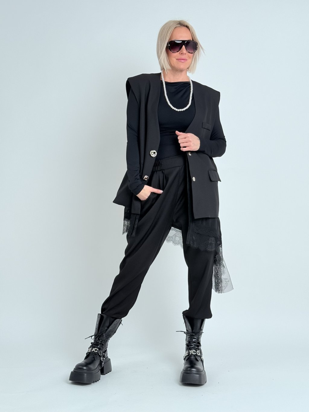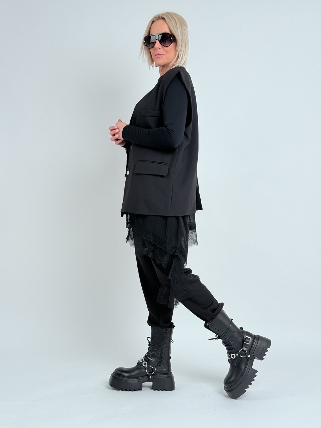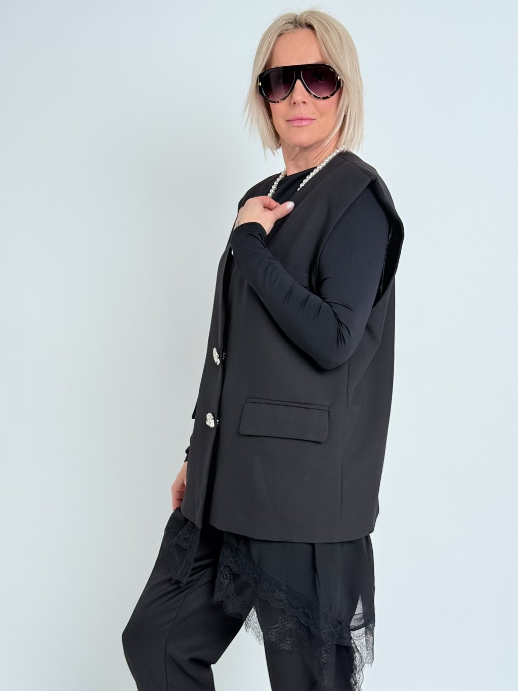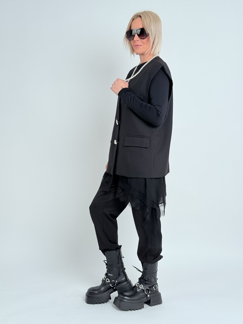 Luxusní, oversize vesta s podšívkou a vykukující saténovou spodničkou s krajkou, se zapínáním vesty na velké, stříbrné knoflíky., Součástí je i perlový náhrdelník, který lze nosit i jako pásek.