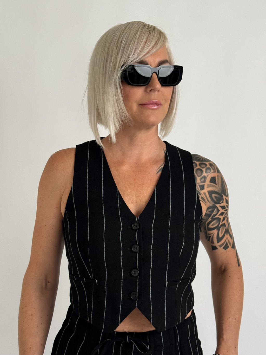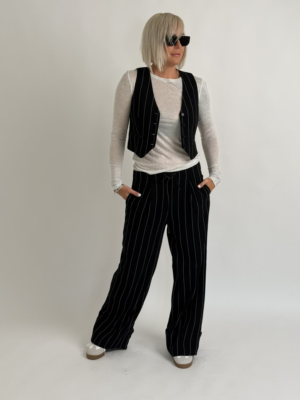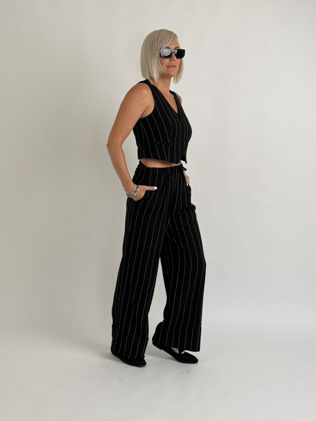 Jednoduchá, kratší vestička v provedení černo-bílý proužek, se zapínáním na knoflíky. Dokonalé k širokým kalhotám EXCLUSIVE. MĚŘTE!!!!