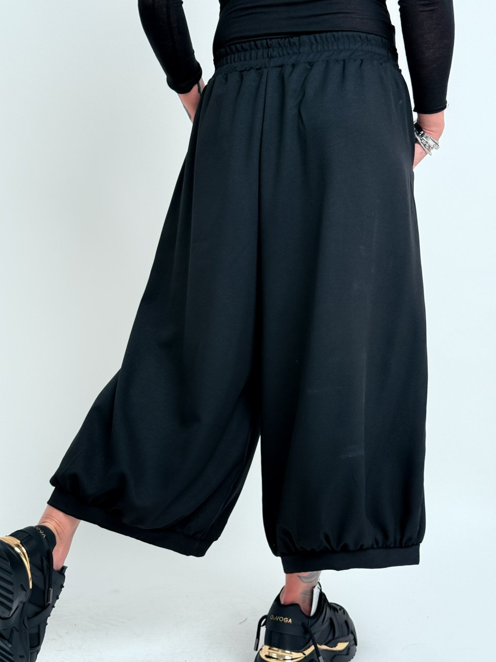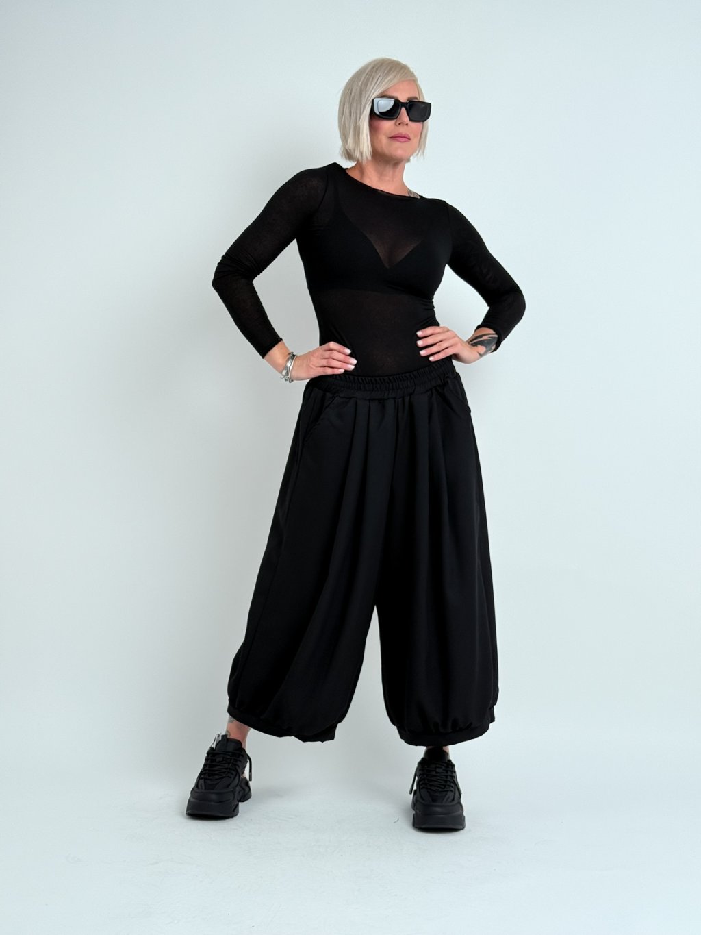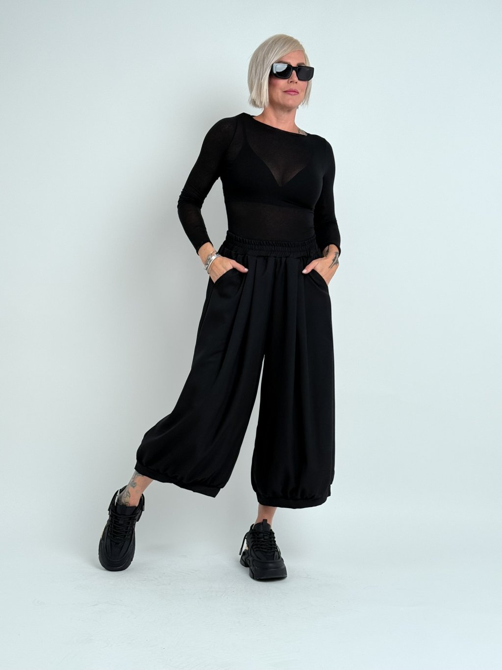 Luxusní byggy s hodně volnými nohavicemi, zakončenými manžetou, v pase do gumy a postranními kapsami.