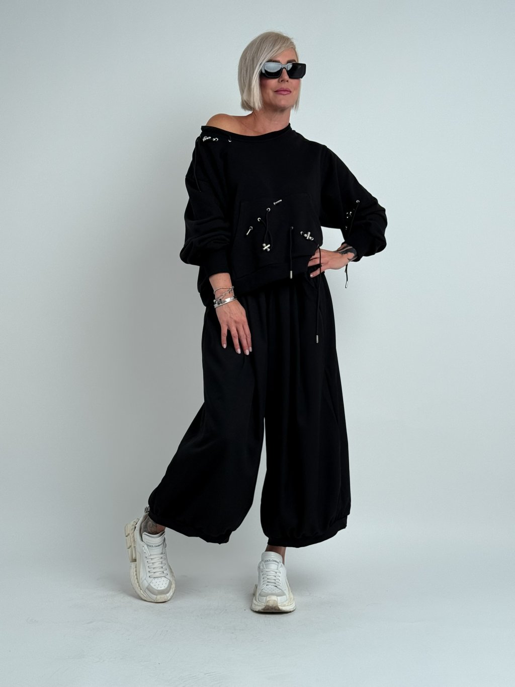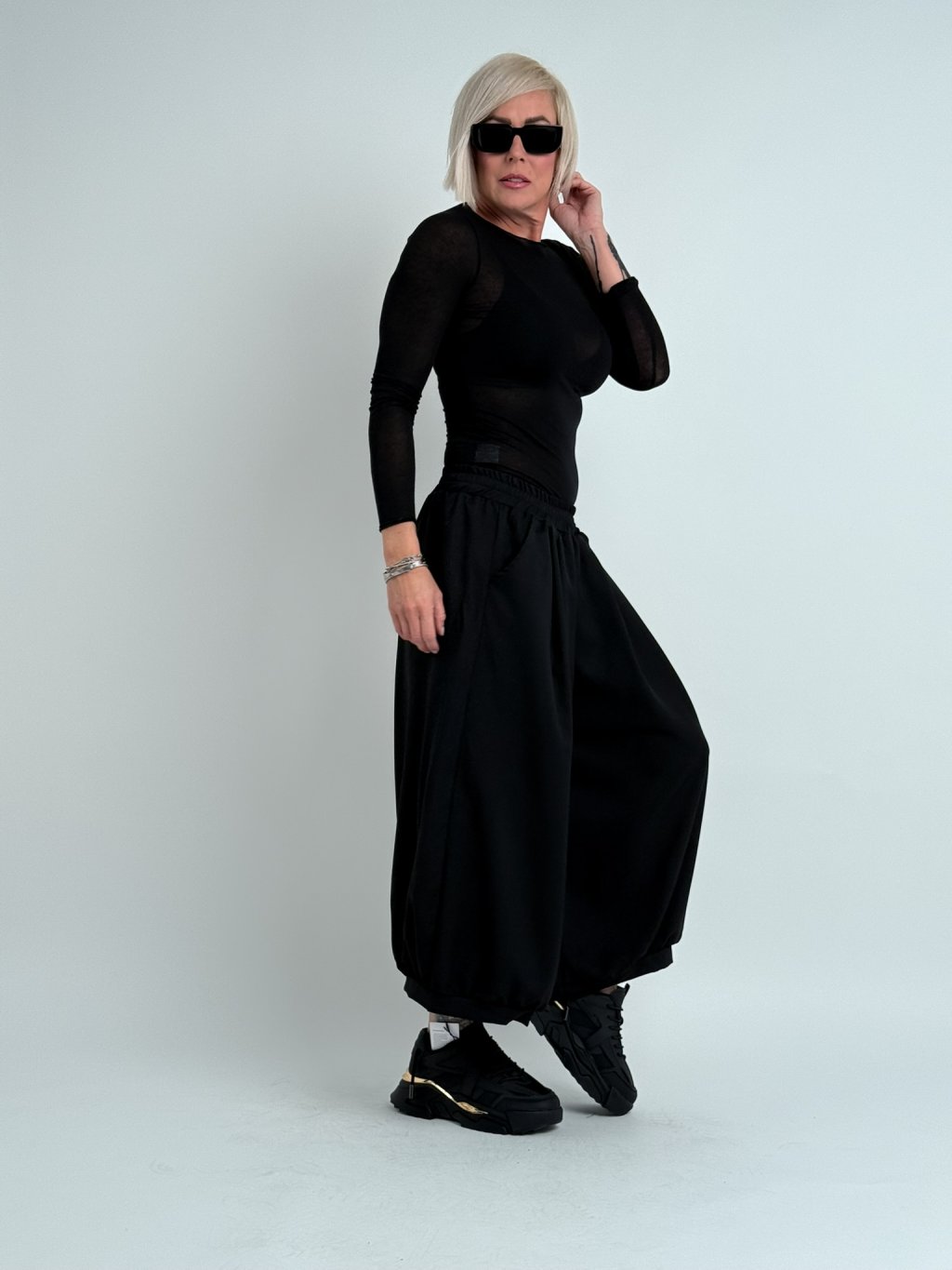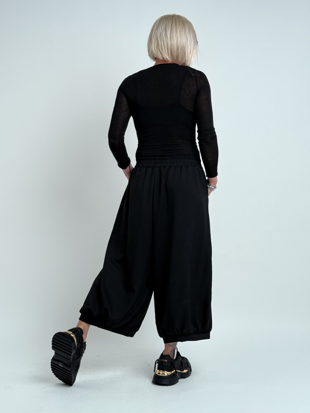 Luxusní byggy s hodně volnými nohavicemi, zakončenými manžetou, v pase do gumy a postranními kapsami.