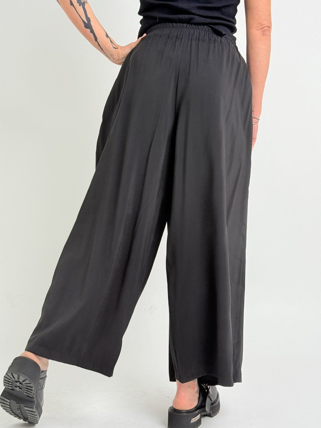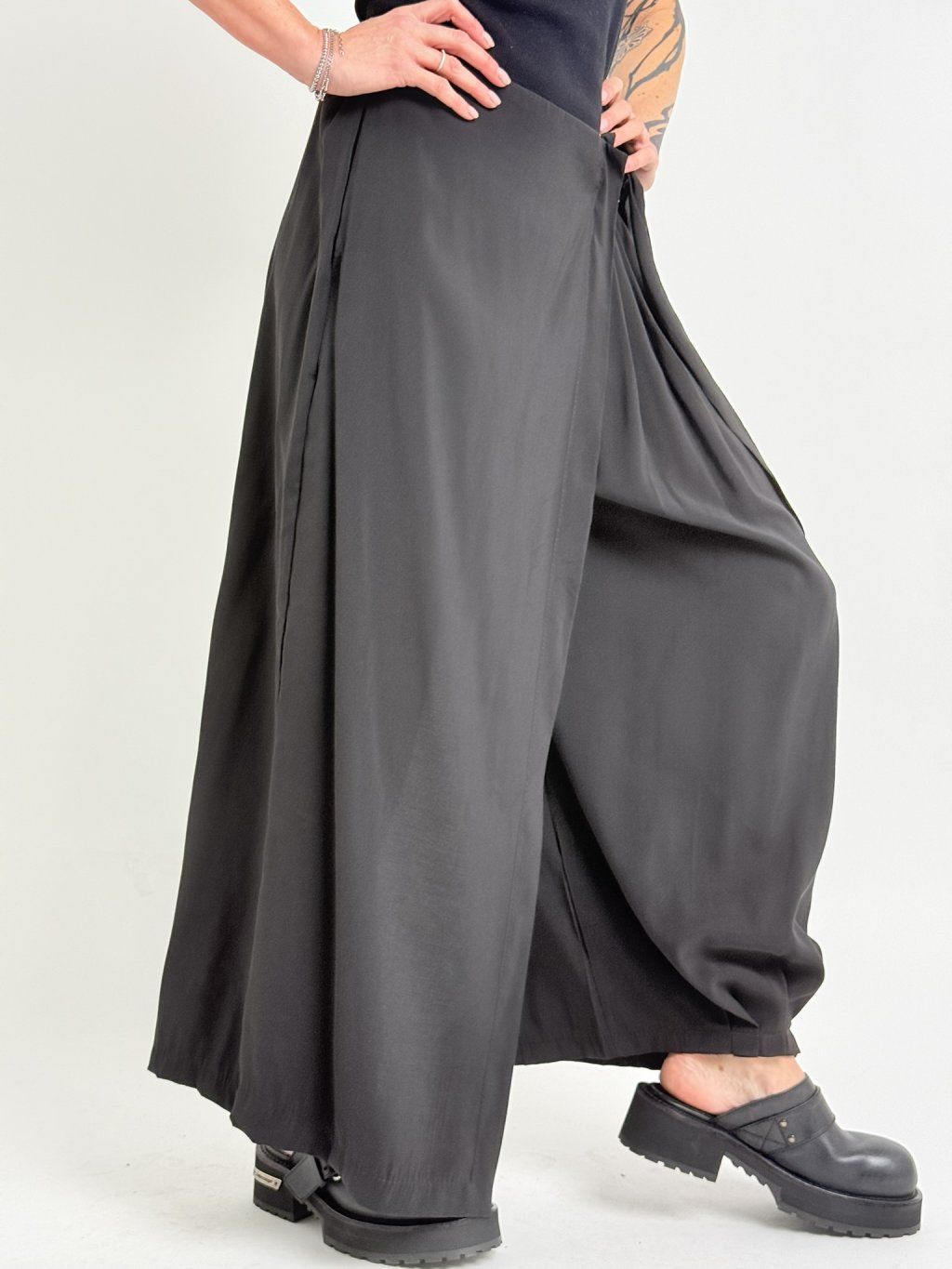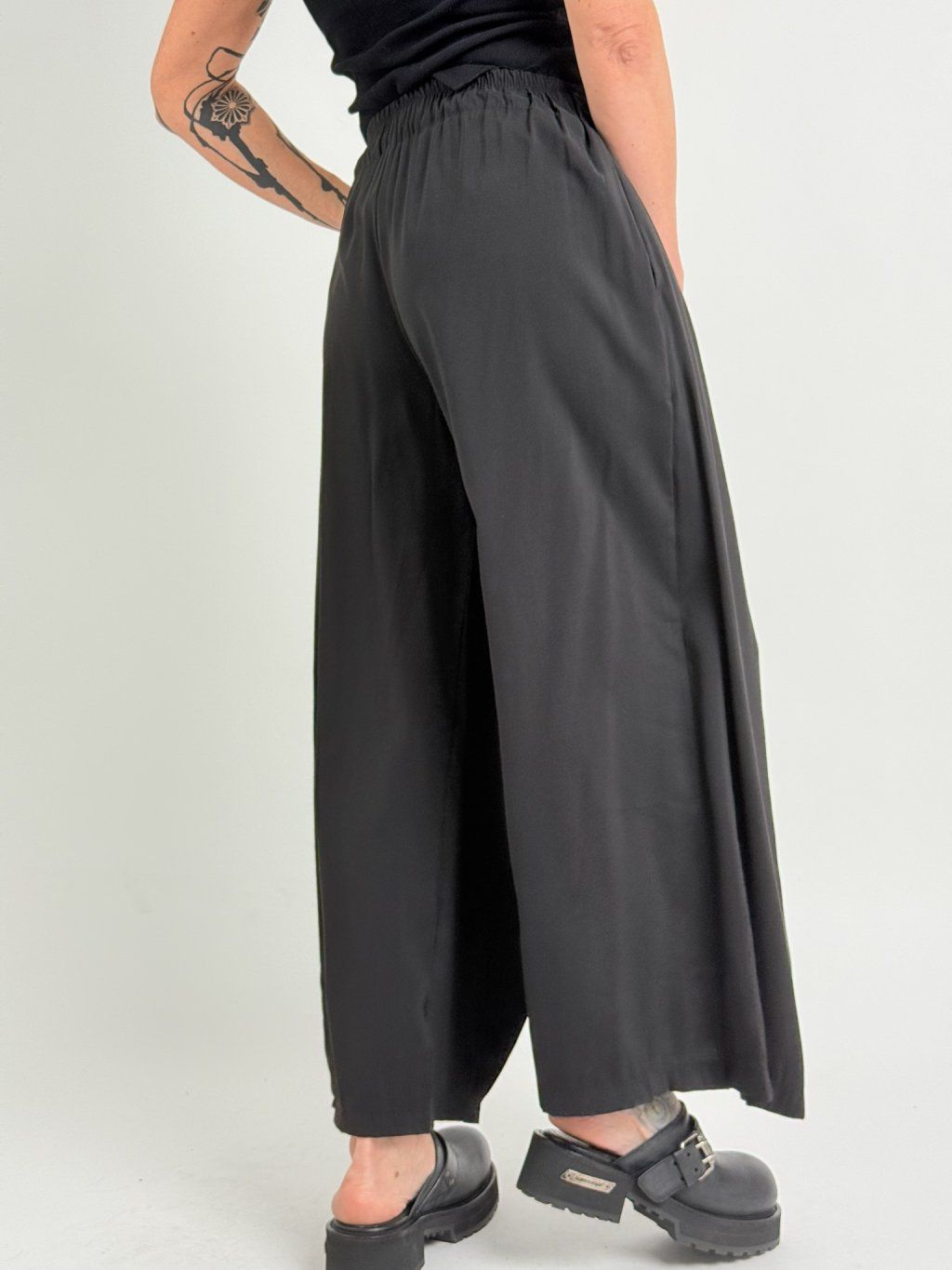 Zajímavé kalhoty se širšími nohavicemi, jedna zakončena sámky, přes druhou je překlad, který se v pase zavazuje na mašli. V zadní části pasu je guma.
