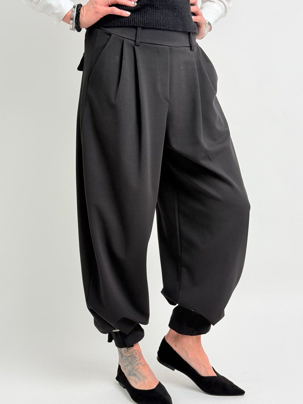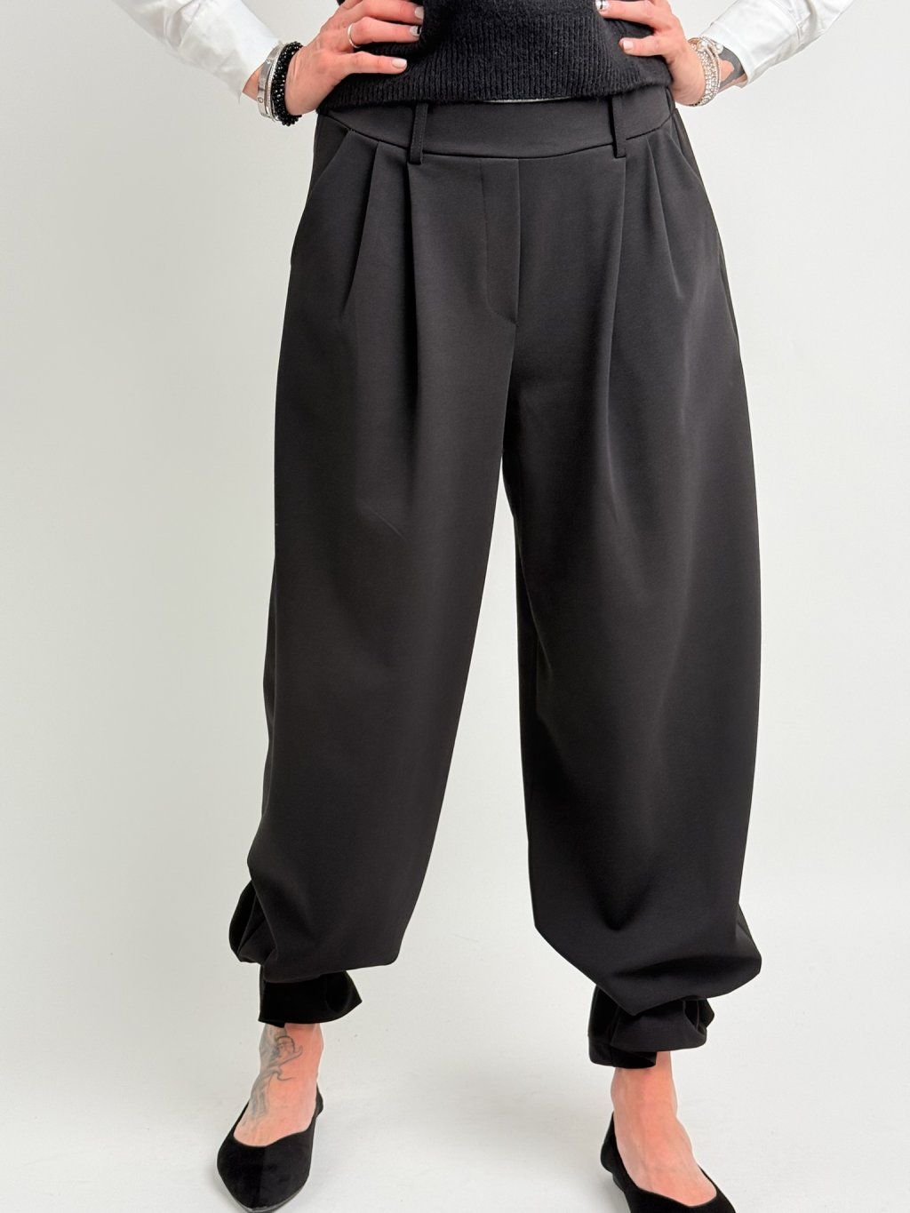 Luxusní kalhoty s gumou v pase, širšími nohavicemi v horní části, dolu se zužujícími. Vzadu patky. Super střih, lehce pružný materiál.