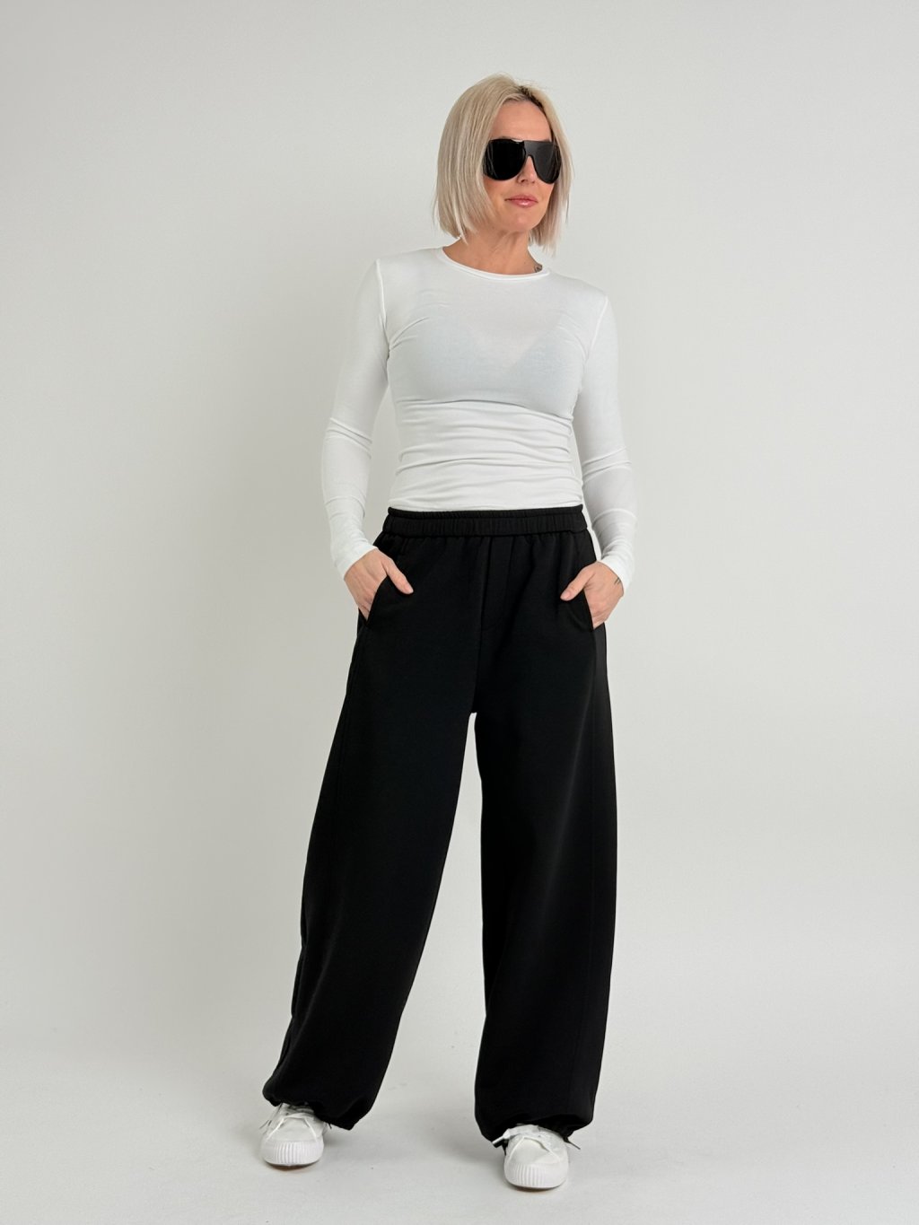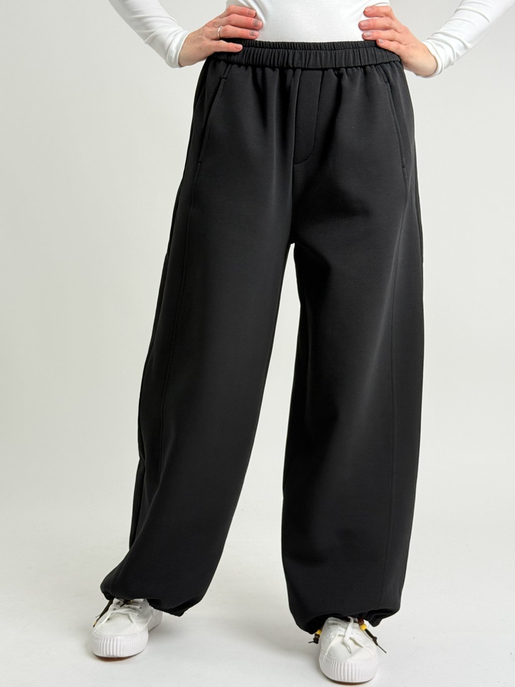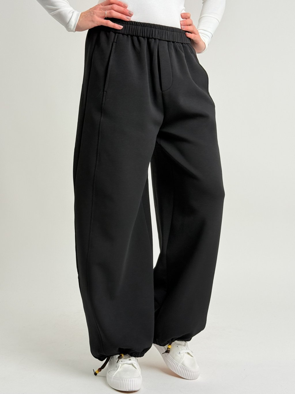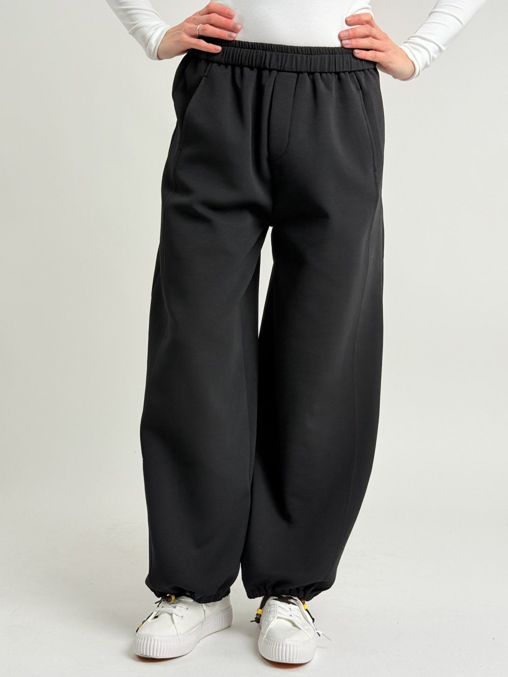 Kalhoty v balonovém střihu s gumou v pase i na konci předního dílu nohavic, naznačeným poklopcem a všitými kapsami.