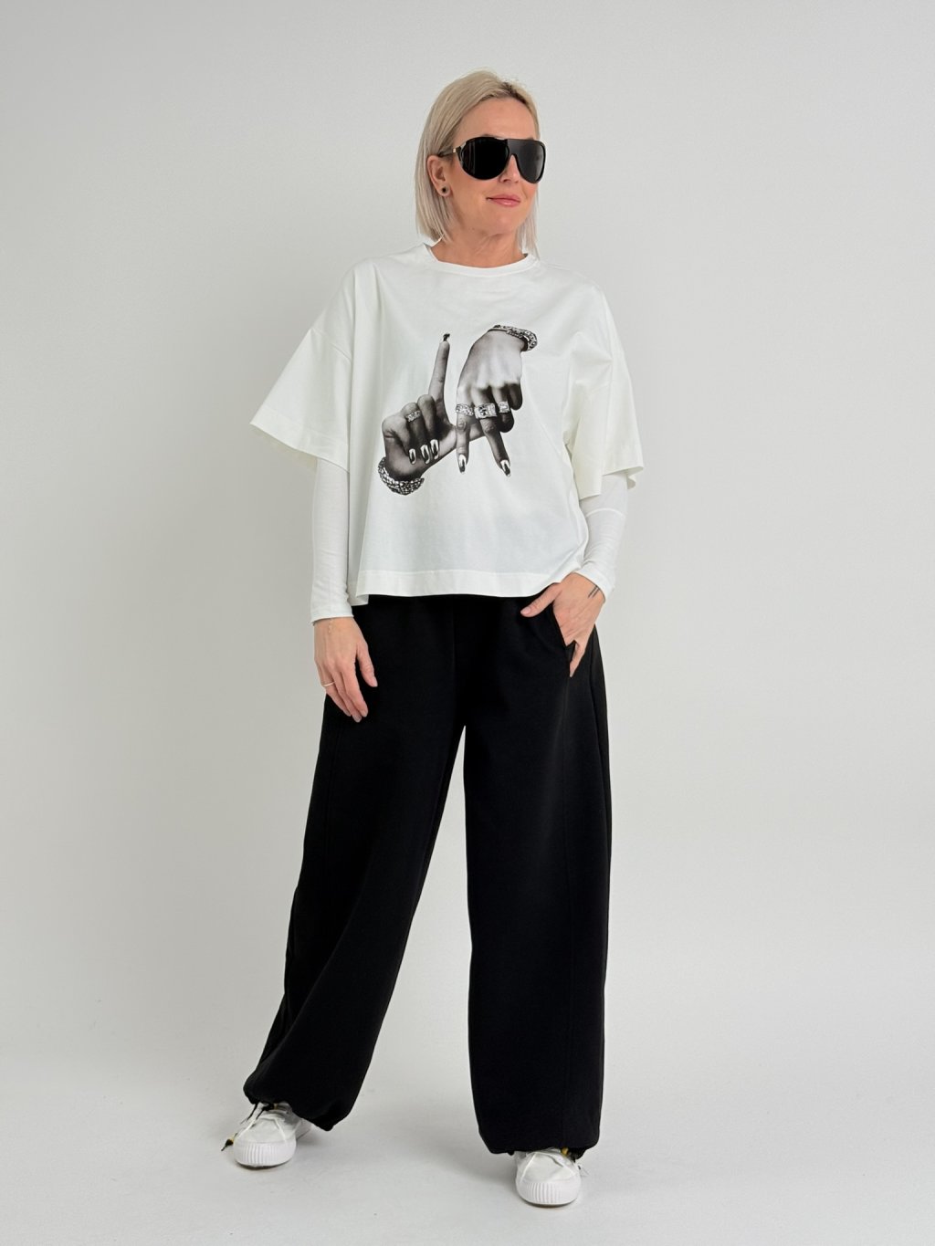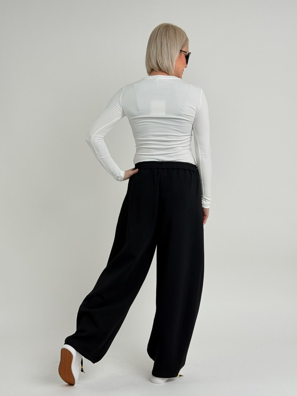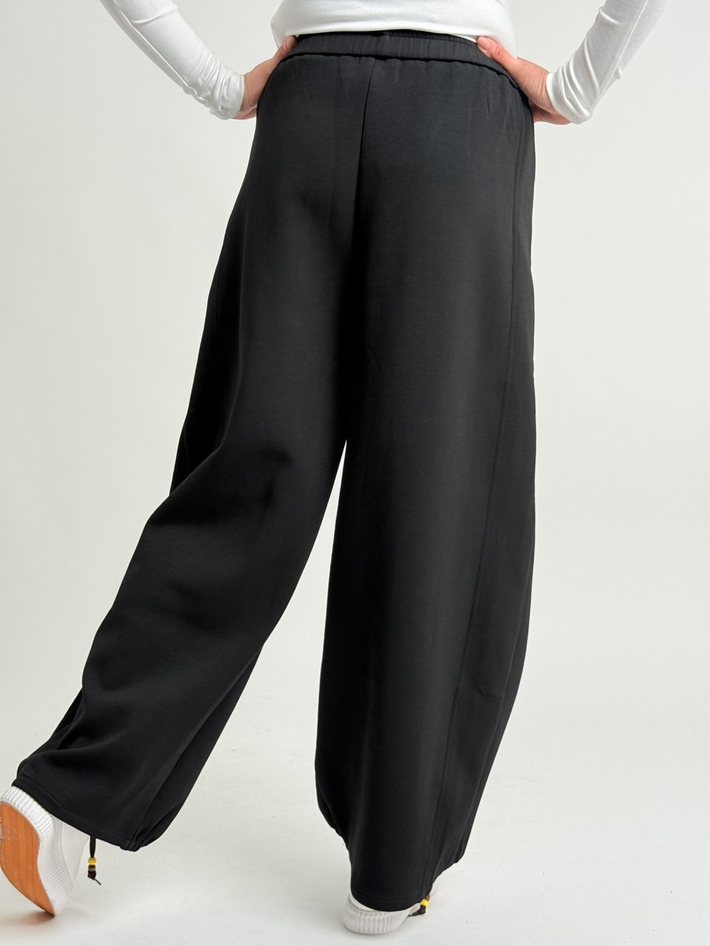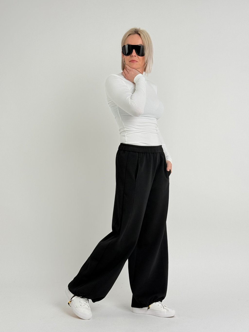 Kalhoty v balonovém střihu s gumou v pase i na konci předního dílu nohavic, naznačeným poklopcem a všitými kapsami.