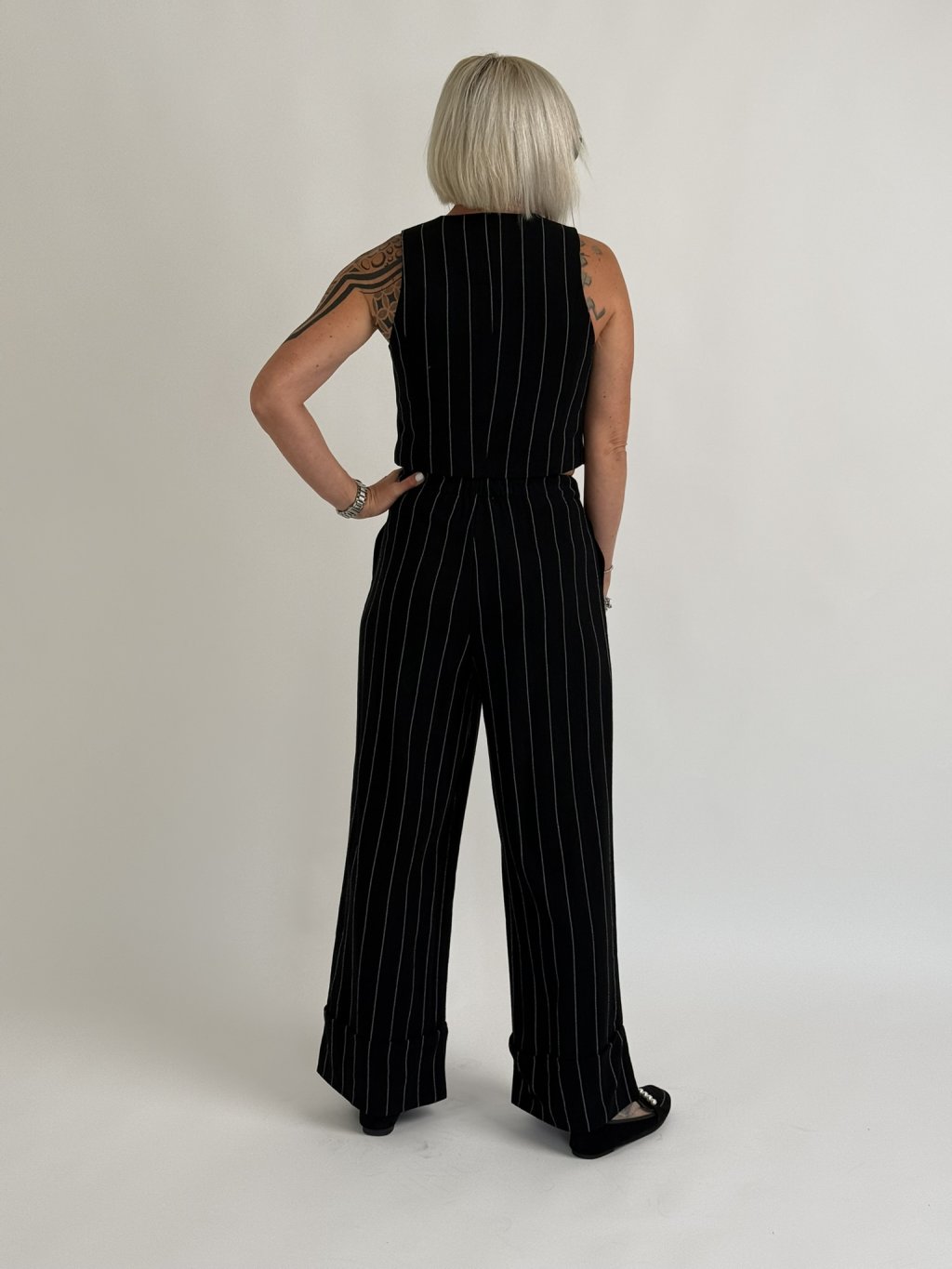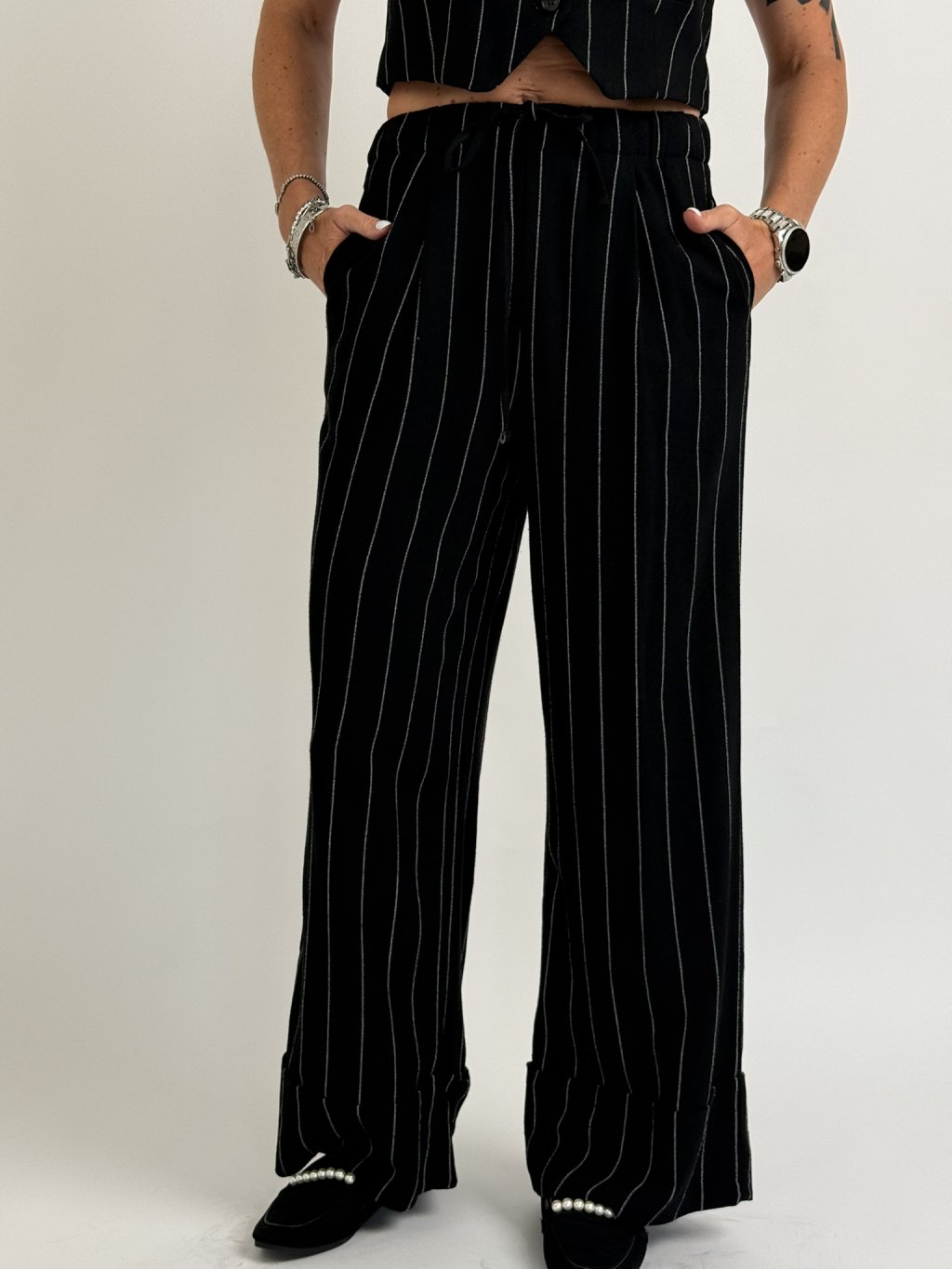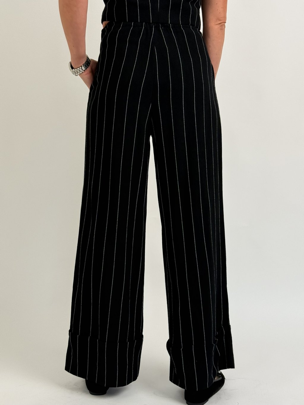 Skvěle padnoucí široké kalhoty v provedení černo-bílý proužek, zakončé manžetou, v pase do gumy. MĚŘTE!!!!