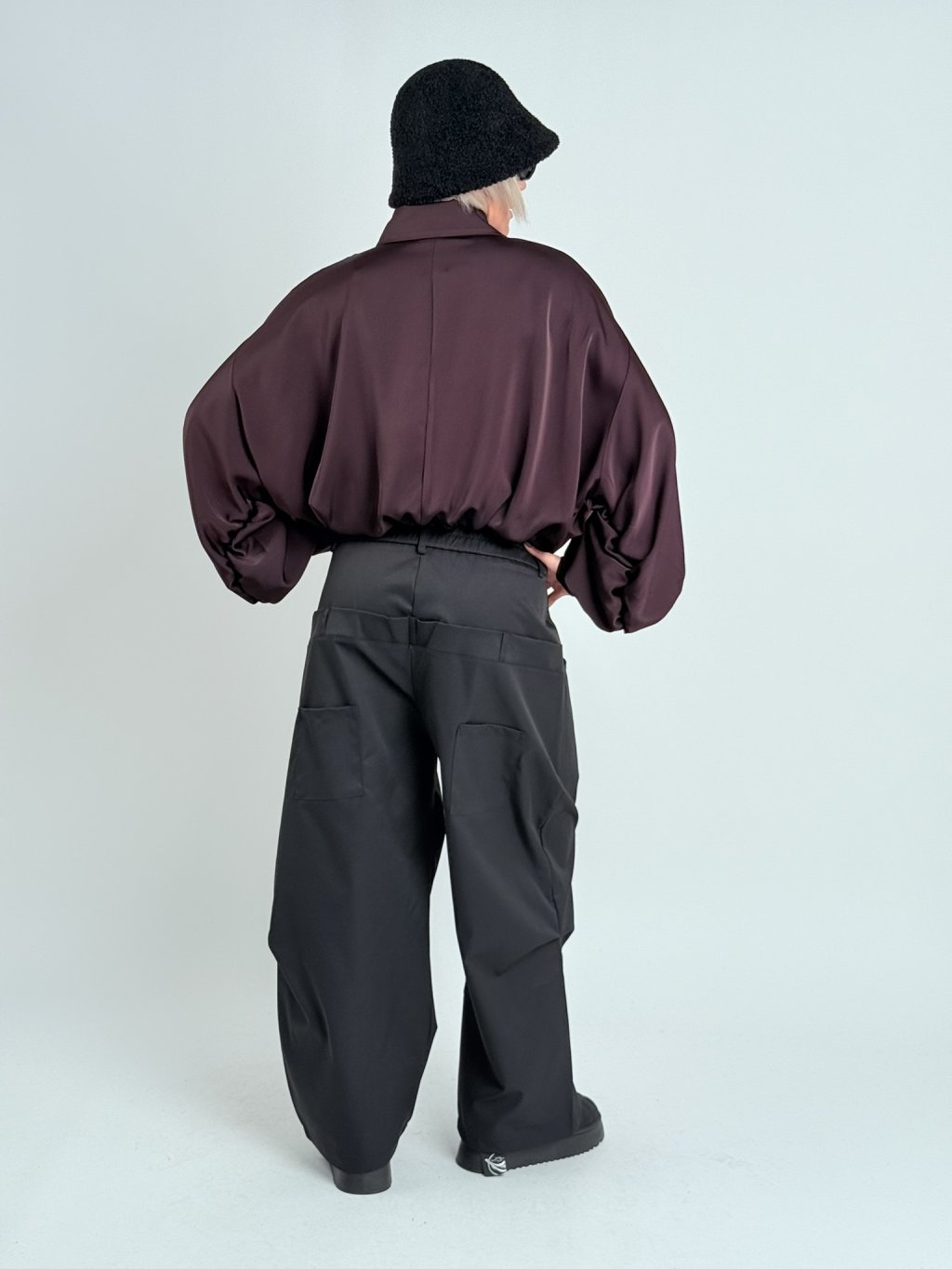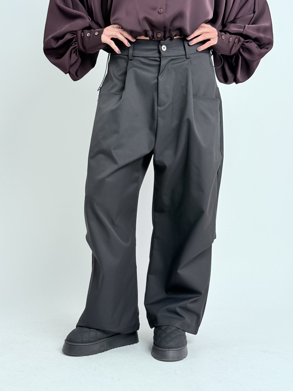 Super kalhoty v zajímavé střihu, v zadní části pasu do gumy a dvojitým pasem s oky na pásek. Vpředu s hlubokými kapsami a sámky na nohavicích.