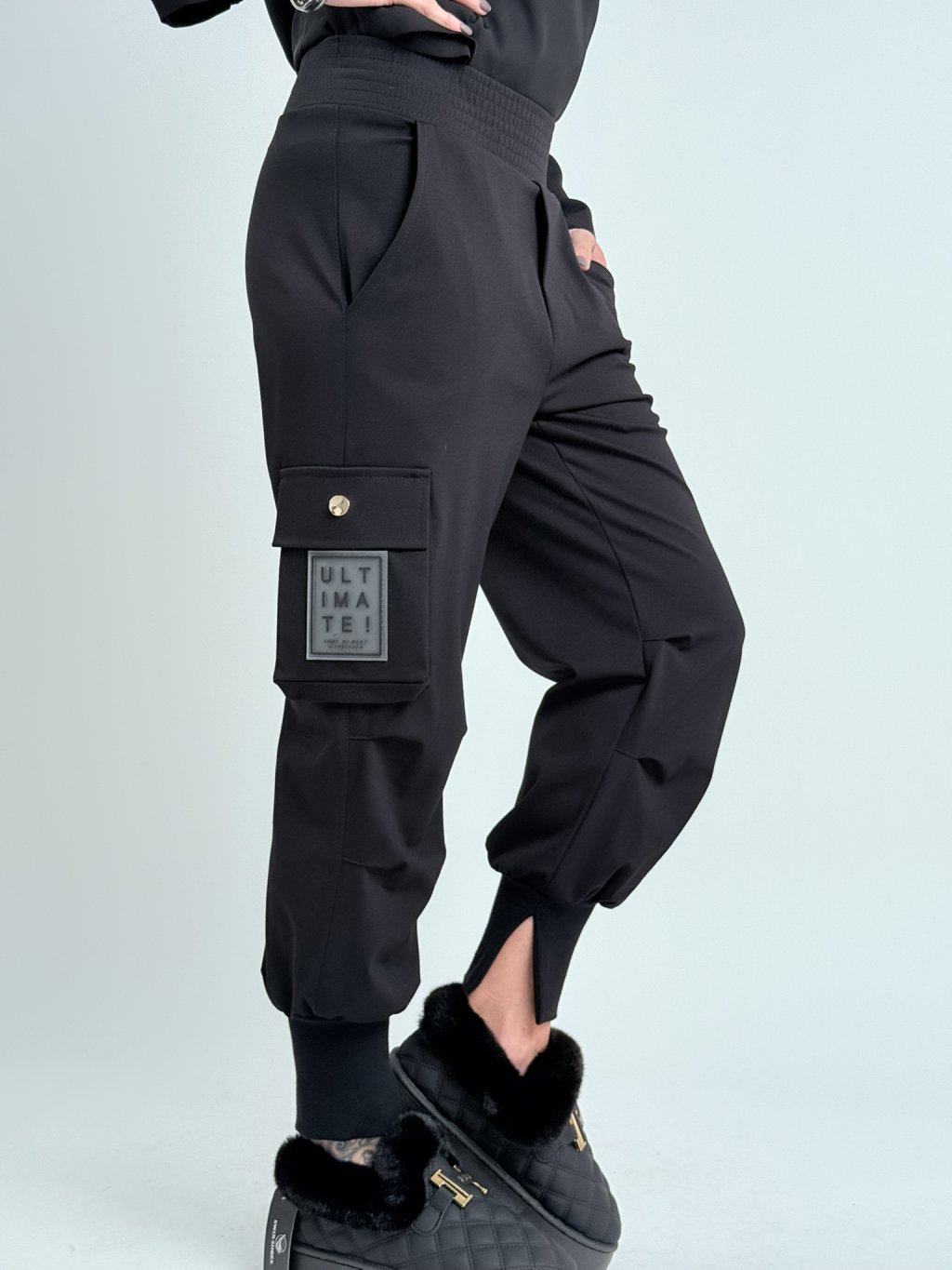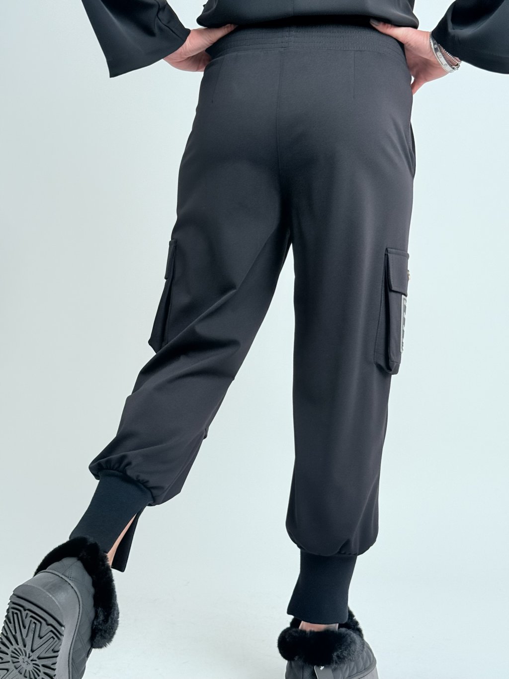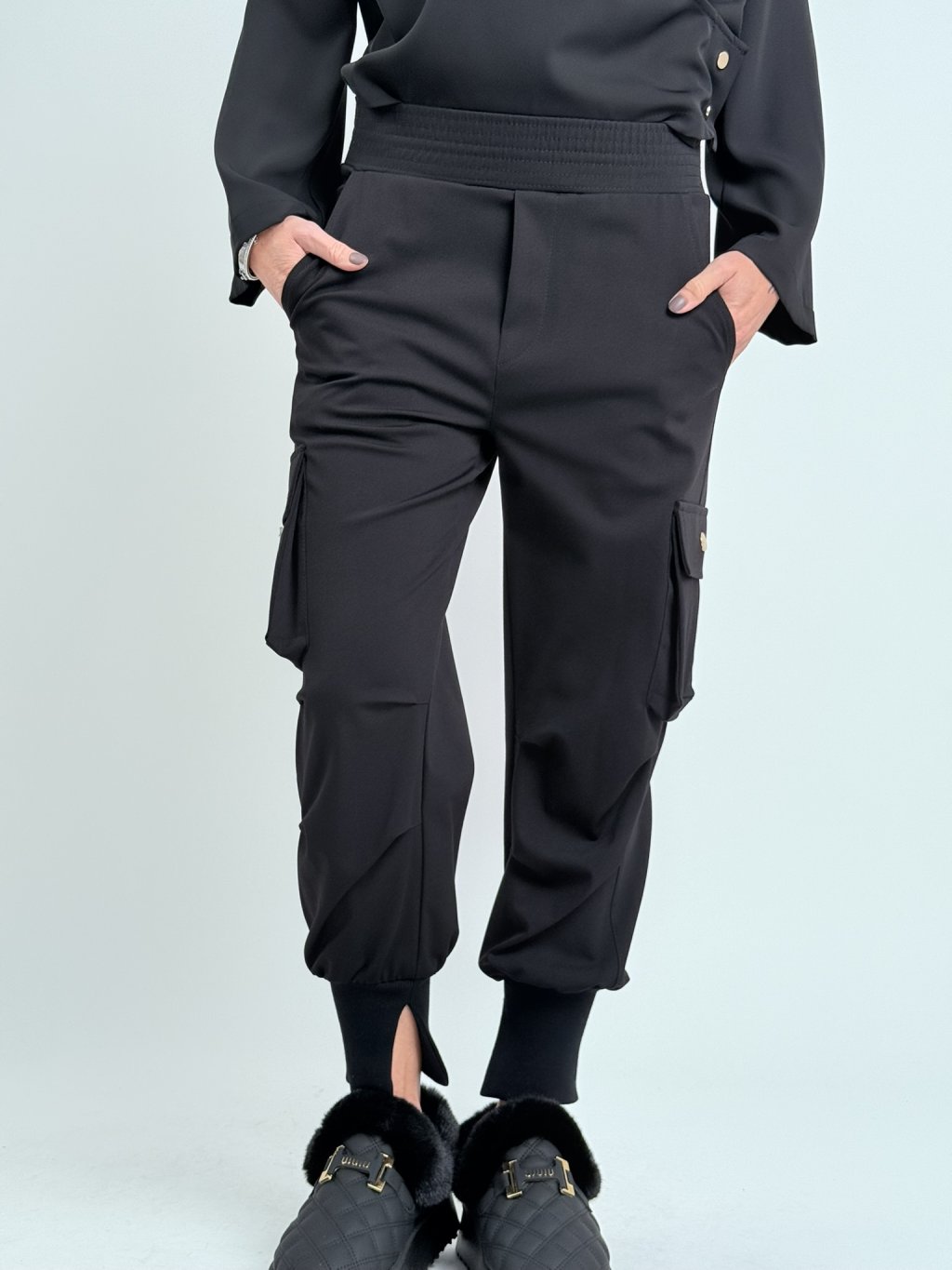 Luxusní kalhoty v pase do gumy, našitými kapsami po stranách nohavic, v dolní části do nápletu.