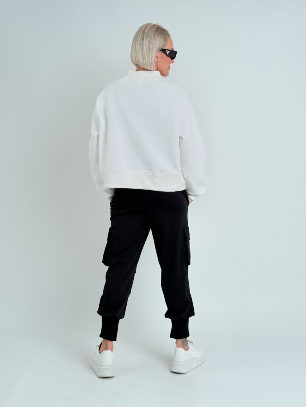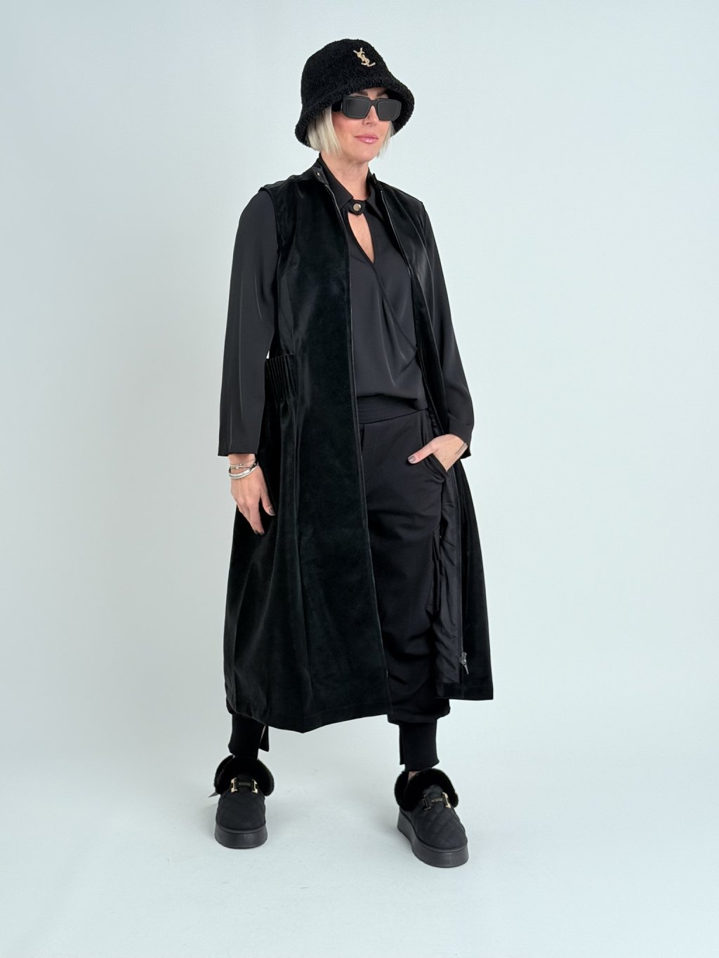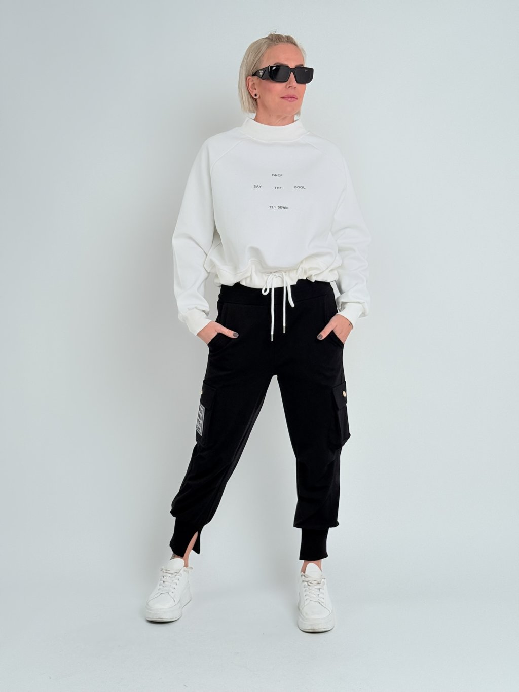 Luxusní kalhoty v pase do gumy, našitými kapsami po stranách nohavic, v dolní části do nápletu.