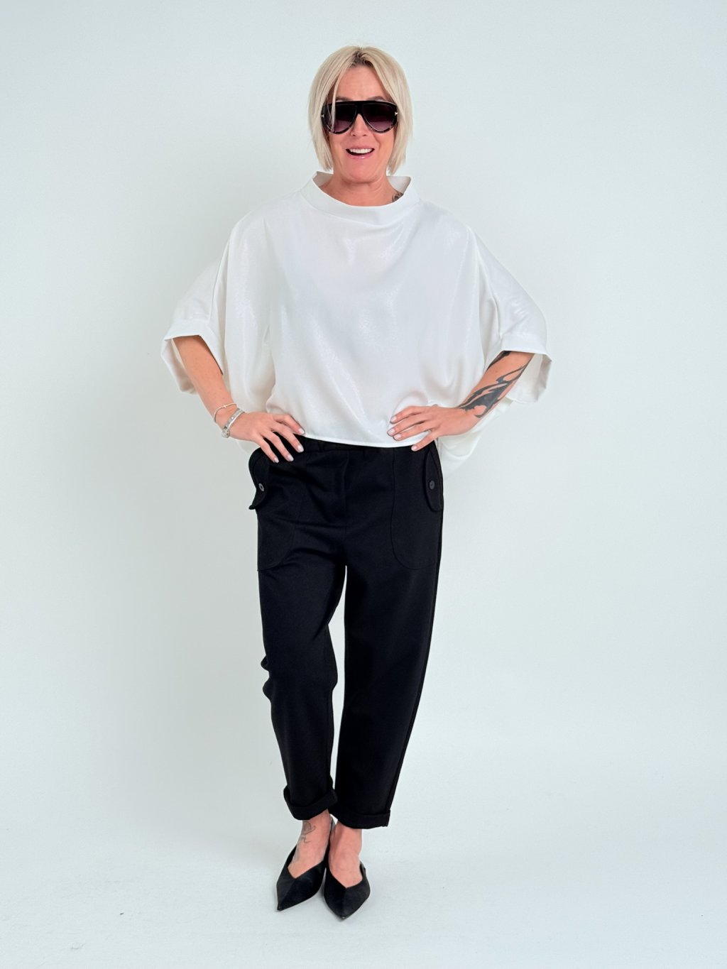 Super kalhoty se sníženým sedem, ozdobnými patkami na předním dílu, v pase se širokou gumou, postranními kapsami. Skvělé s trikem, topem, košilí i sakem.