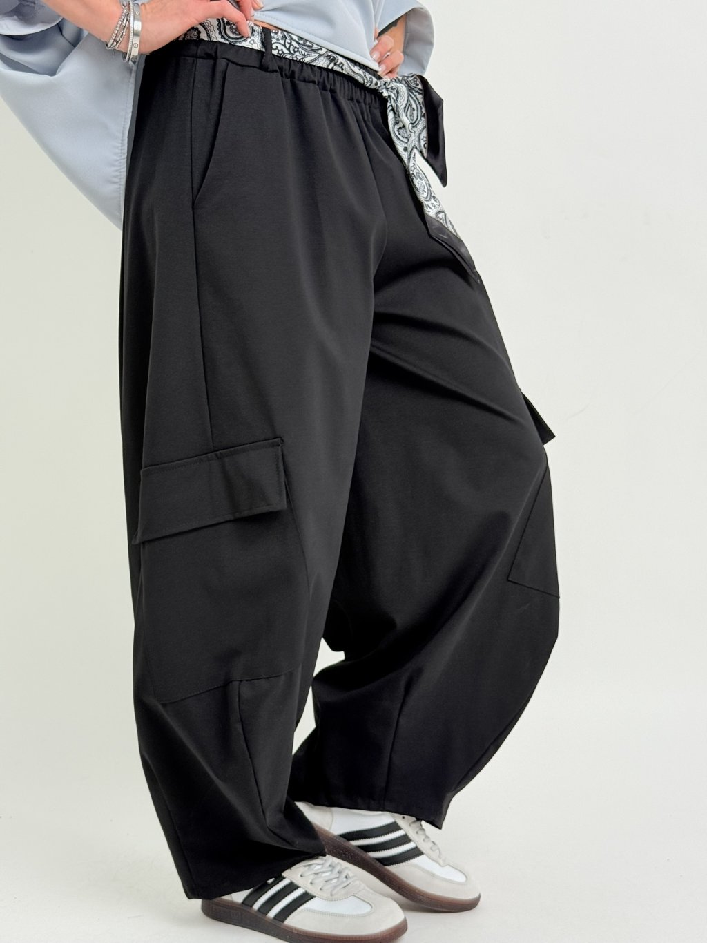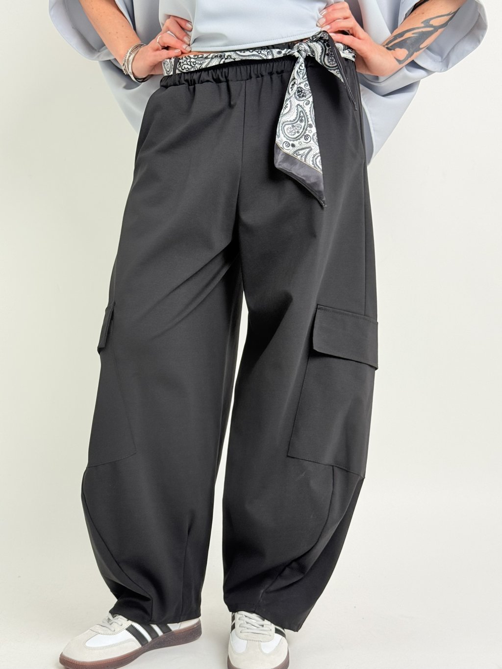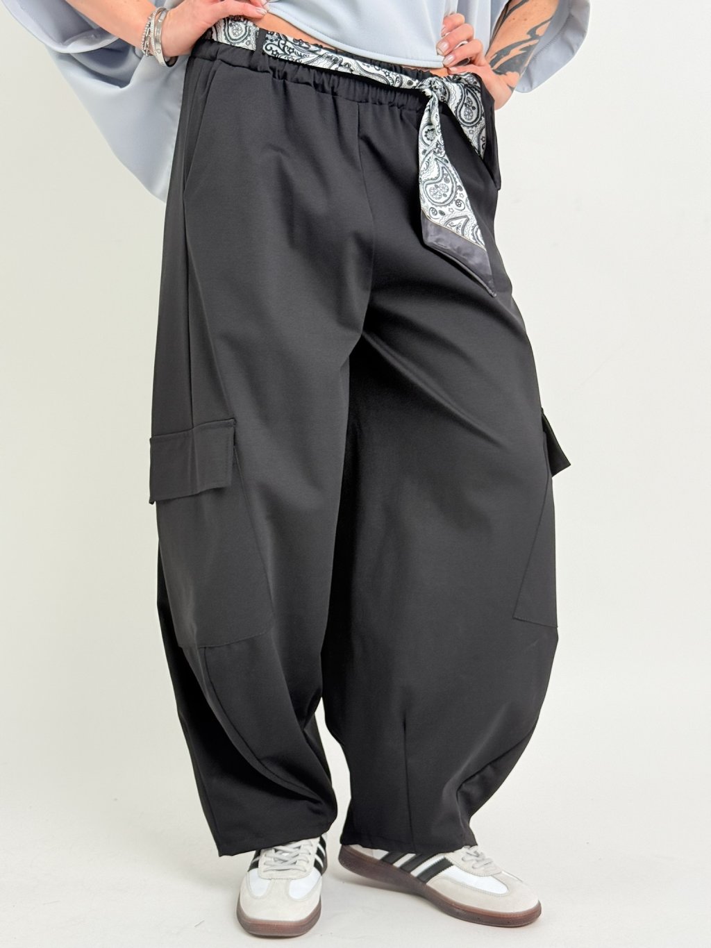 Kalhoty v balonovém střihu s našitými kapsami na nohavicích, s postranními kapsami, gumou a saténovým šátkem v pase.