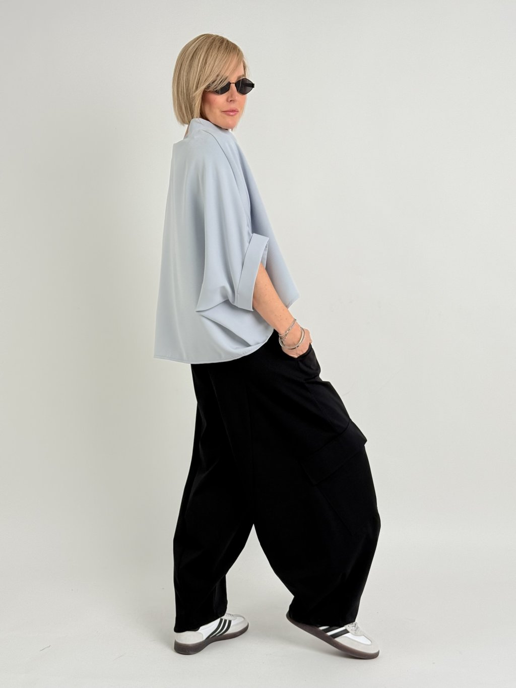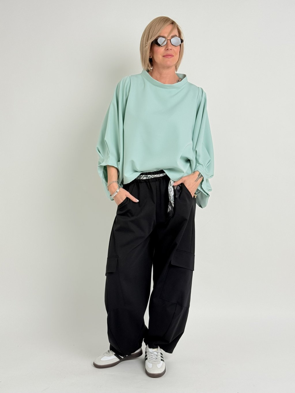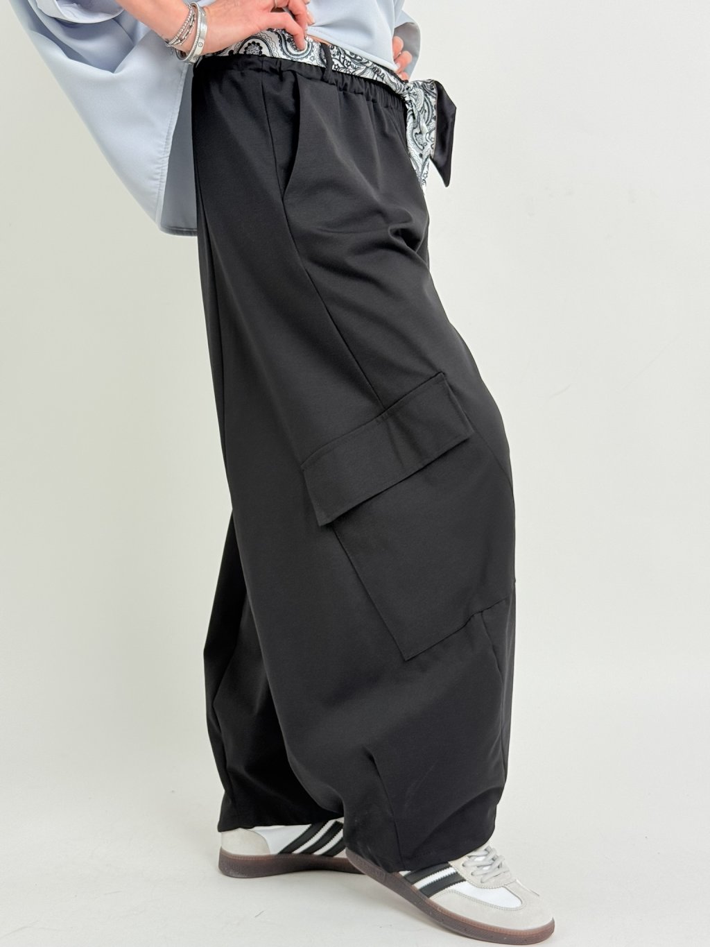 Kalhoty v balonovém střihu s našitými kapsami na nohavicích, s postranními kapsami, gumou a saténovým šátkem v pase.