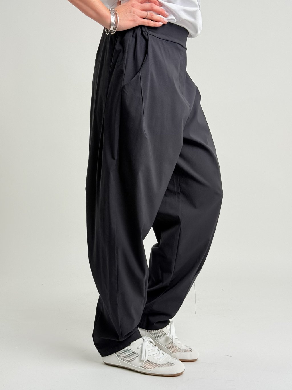 Luxusní kalhoty s gumou v pase, širšími nohavicemi v horní části, dolu se zužujícími. Super střih, hodně pružný materiál.