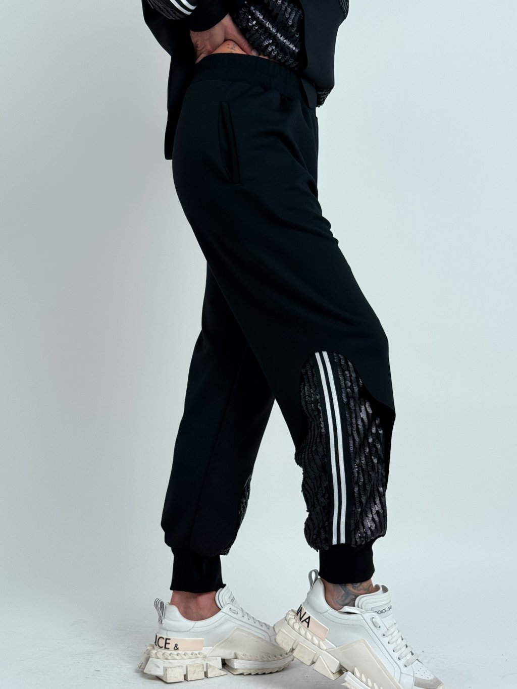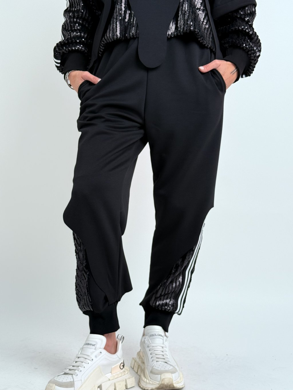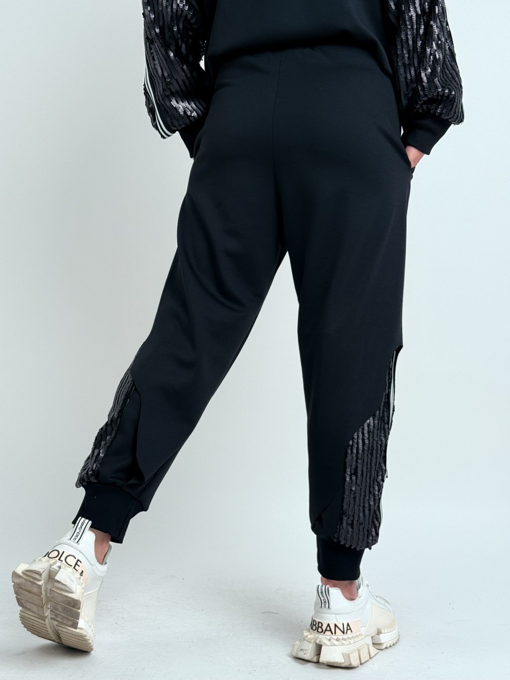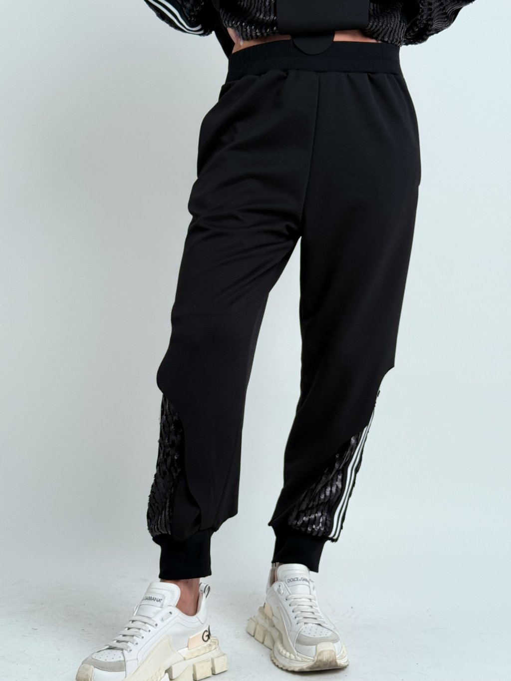 Luxusní kalhoty z dvojité látky v kombinaci s flitry, v pase do gumy a s postranními kapsami.