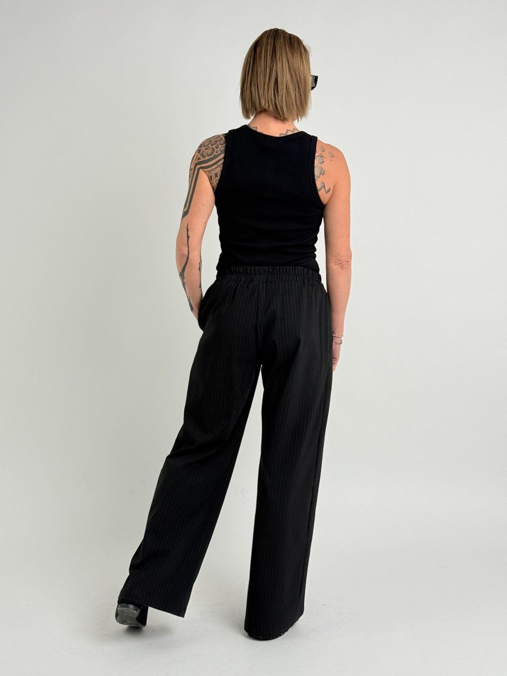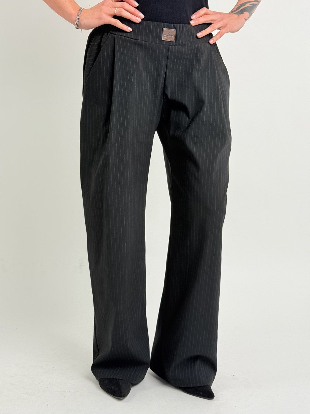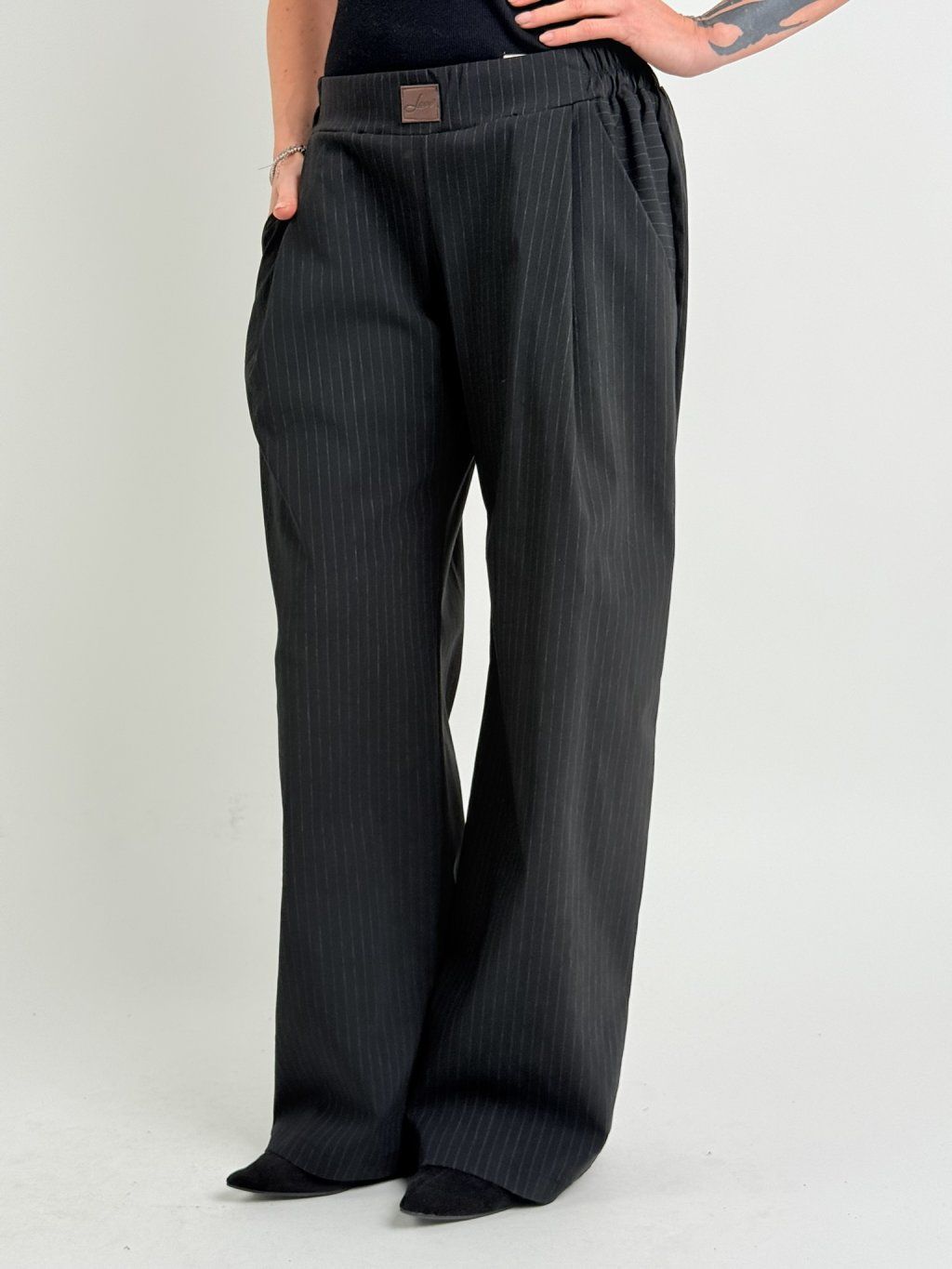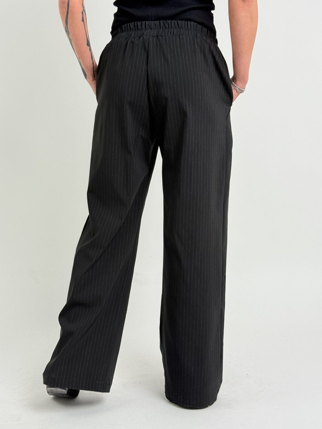 Široké kalhoty v černé barvě s jemným proužkem, v zadní části pasu do gumy, vpředu s kapsami a sámky.