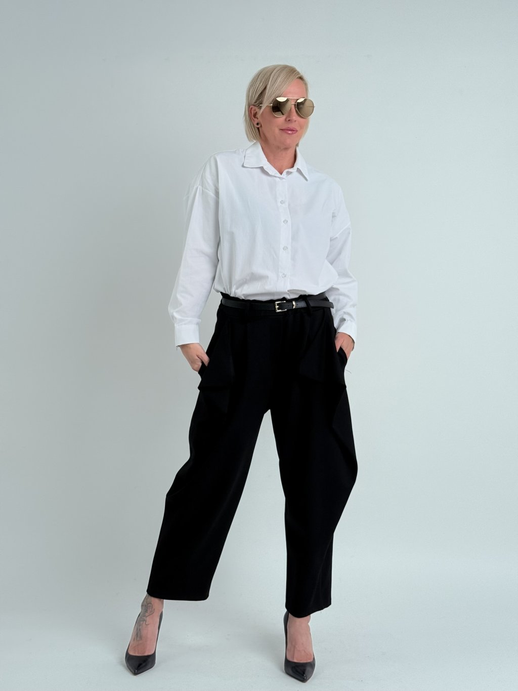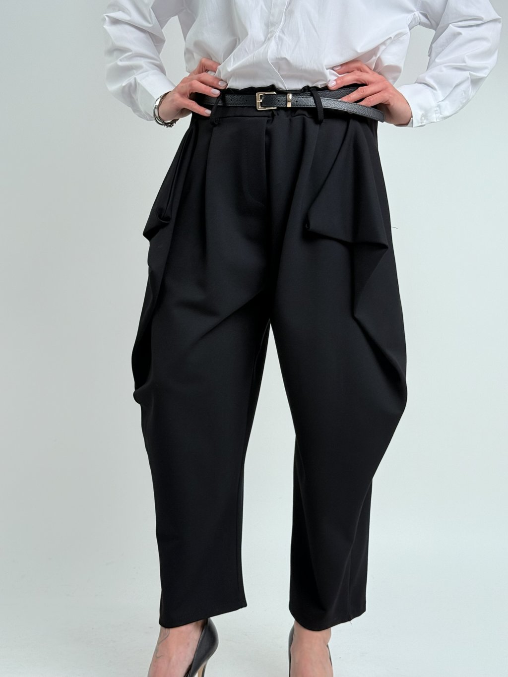 Luxusní kalhoty s gumou a páskem v pase a zajímavě řešeným, variabilním předním dílem.