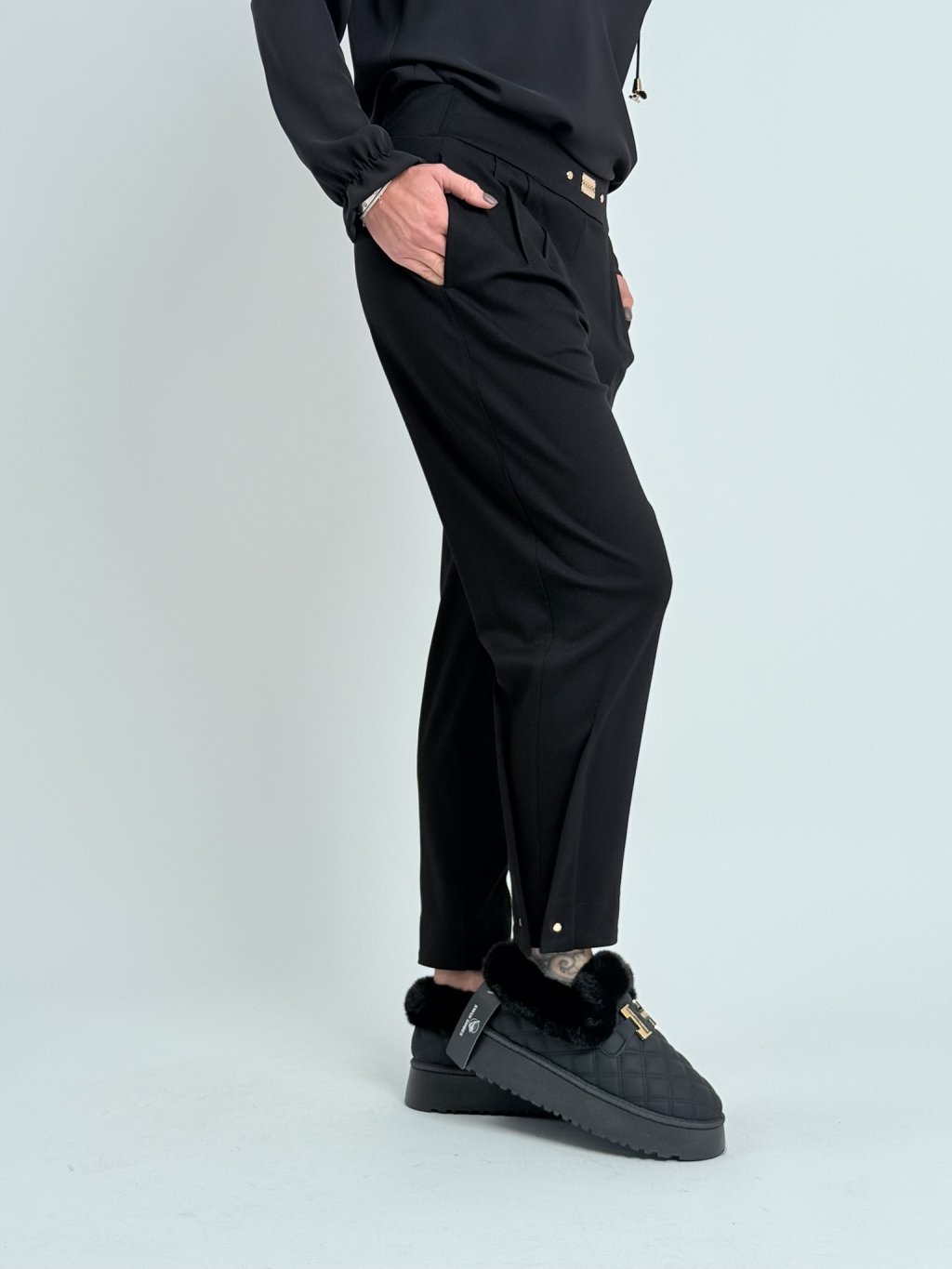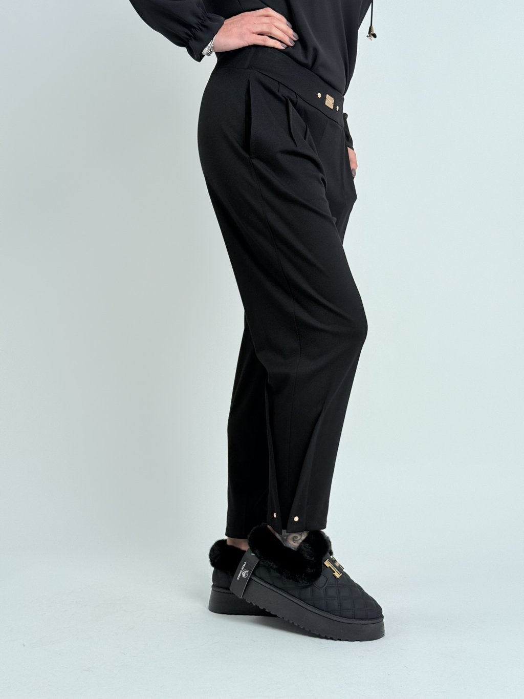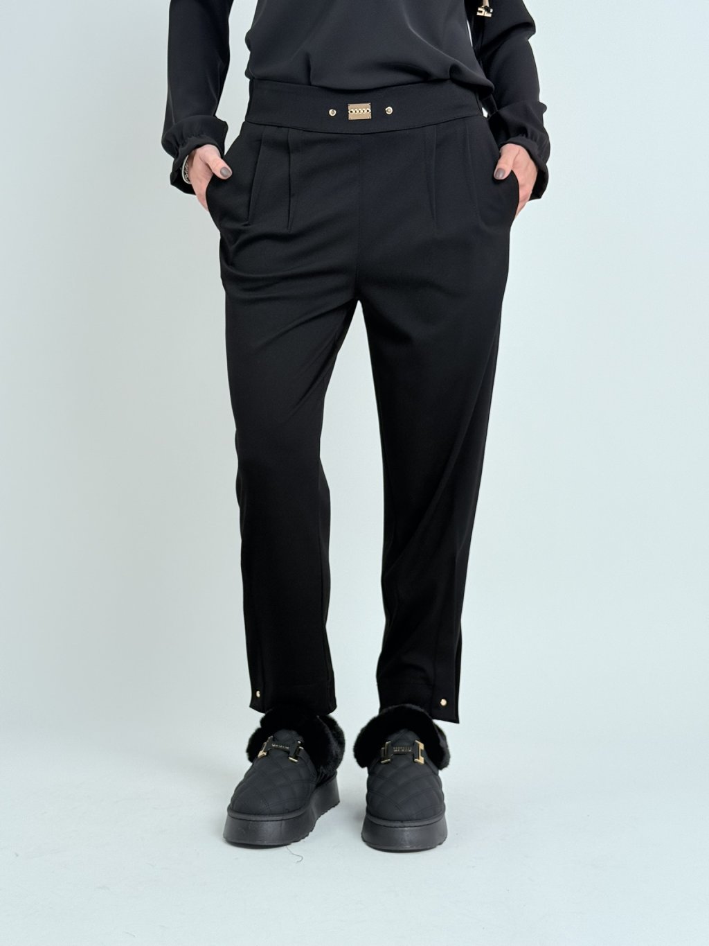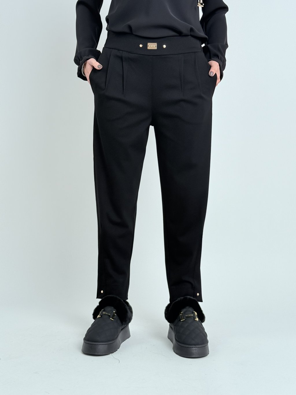 Luxusní kalhoty v pase do gumy, postranními všitými kapsami a užšími nohavicemi se sámky a zlatou aplikací.