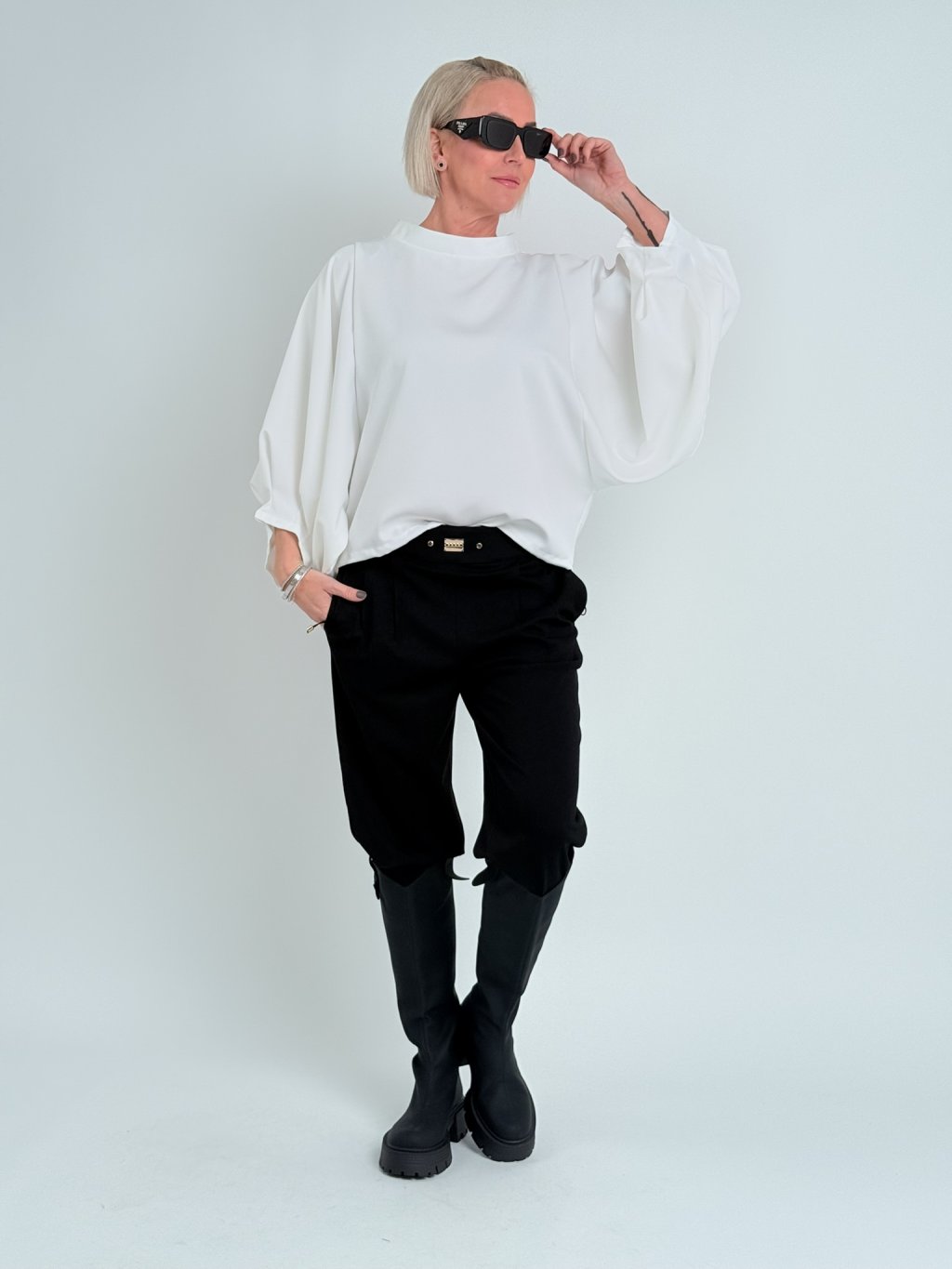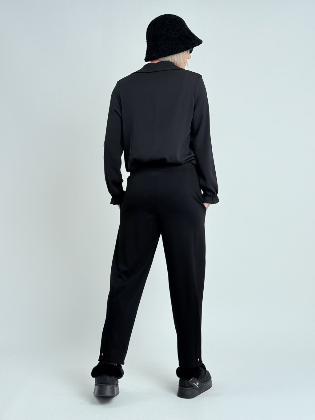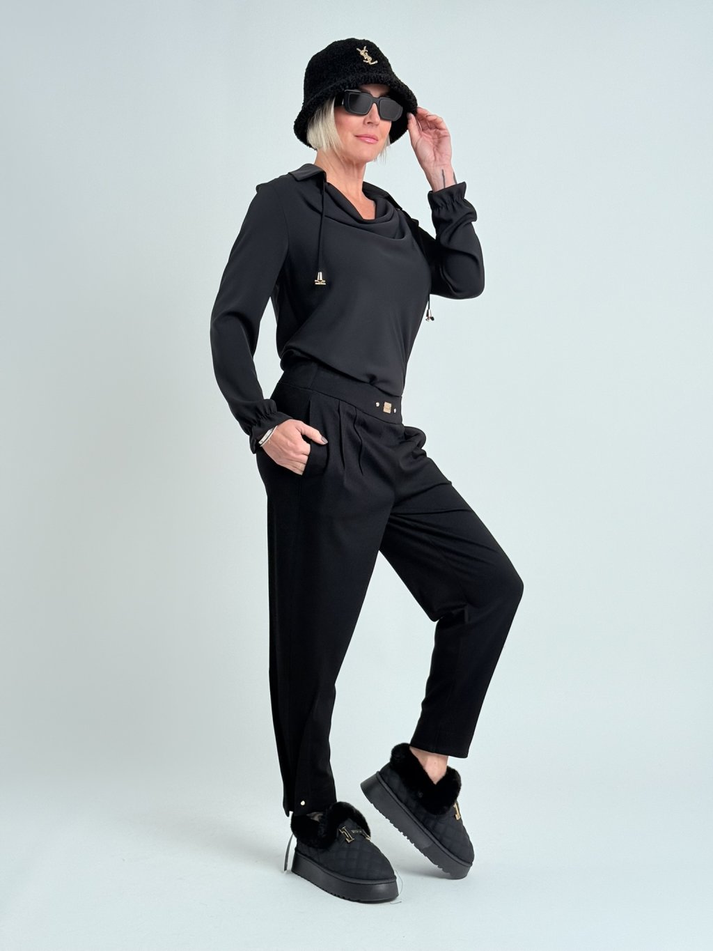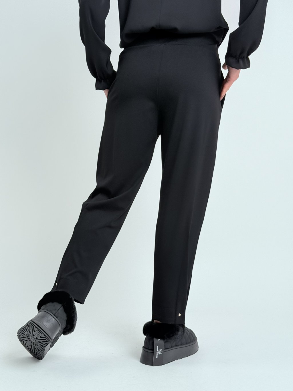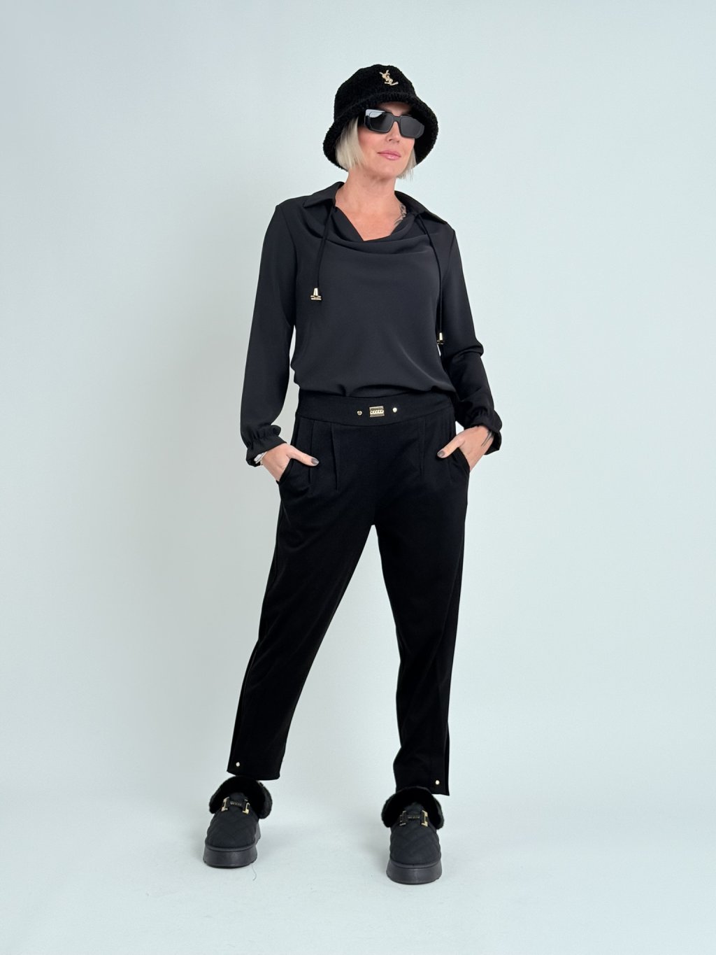 Luxusní kalhoty v pase do gumy, postranními všitými kapsami a užšími nohavicemi se sámky a zlatou aplikací.