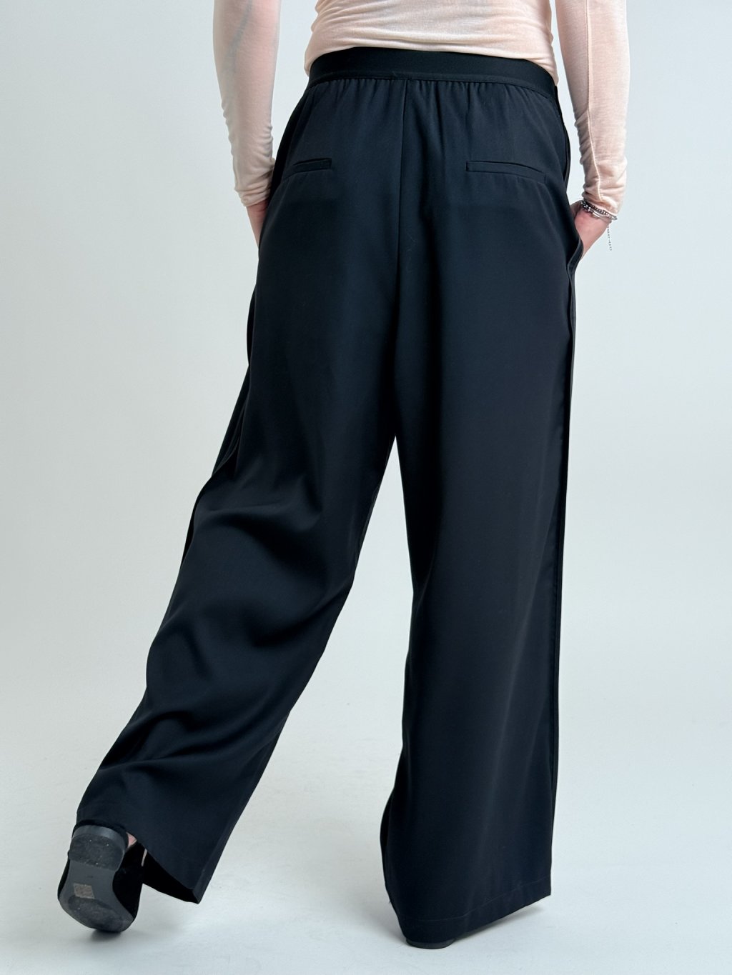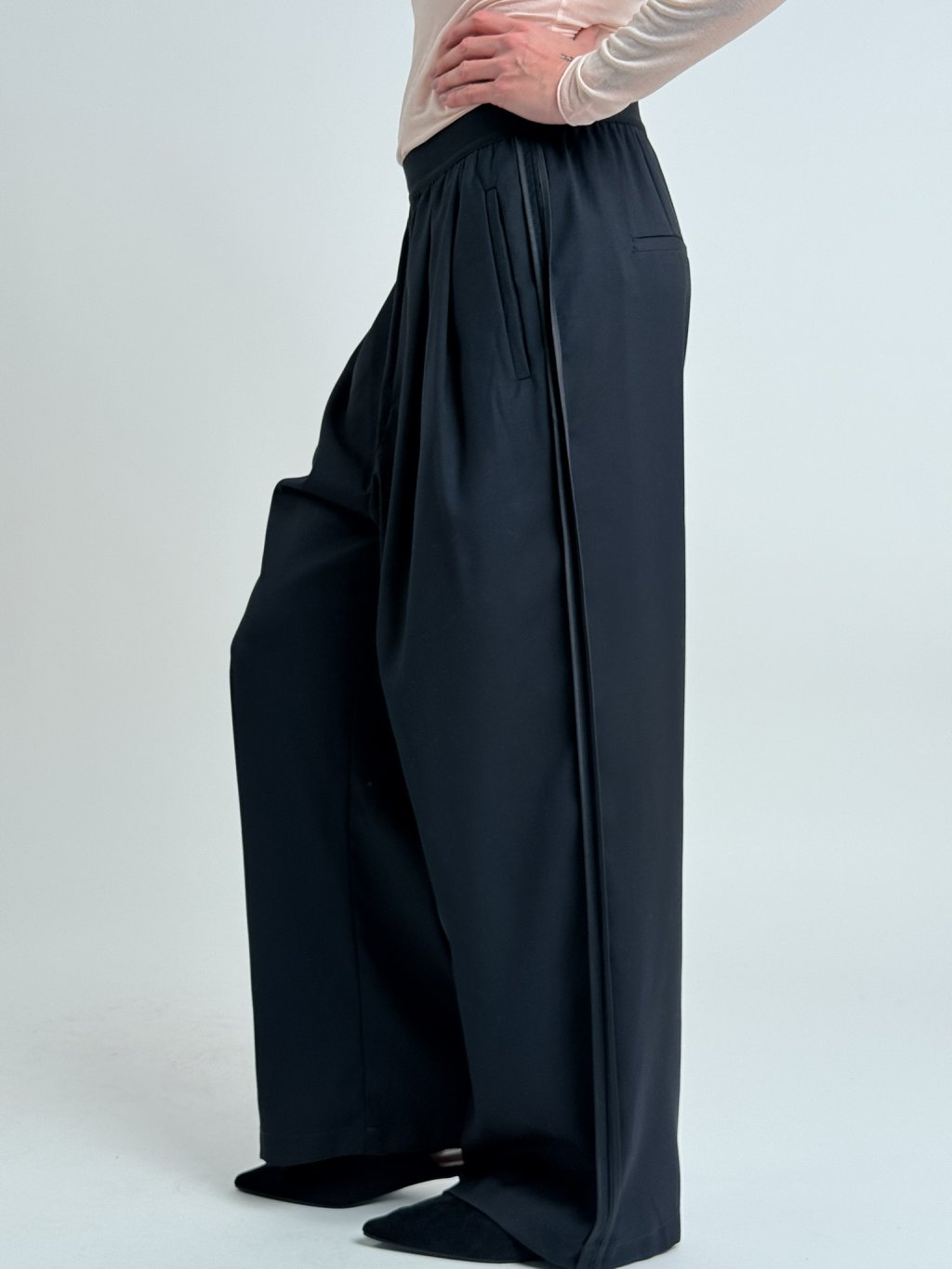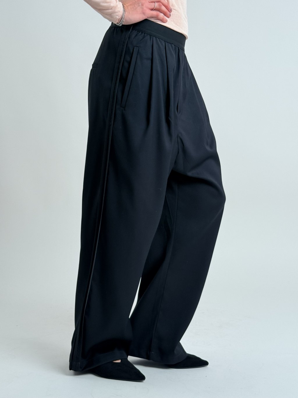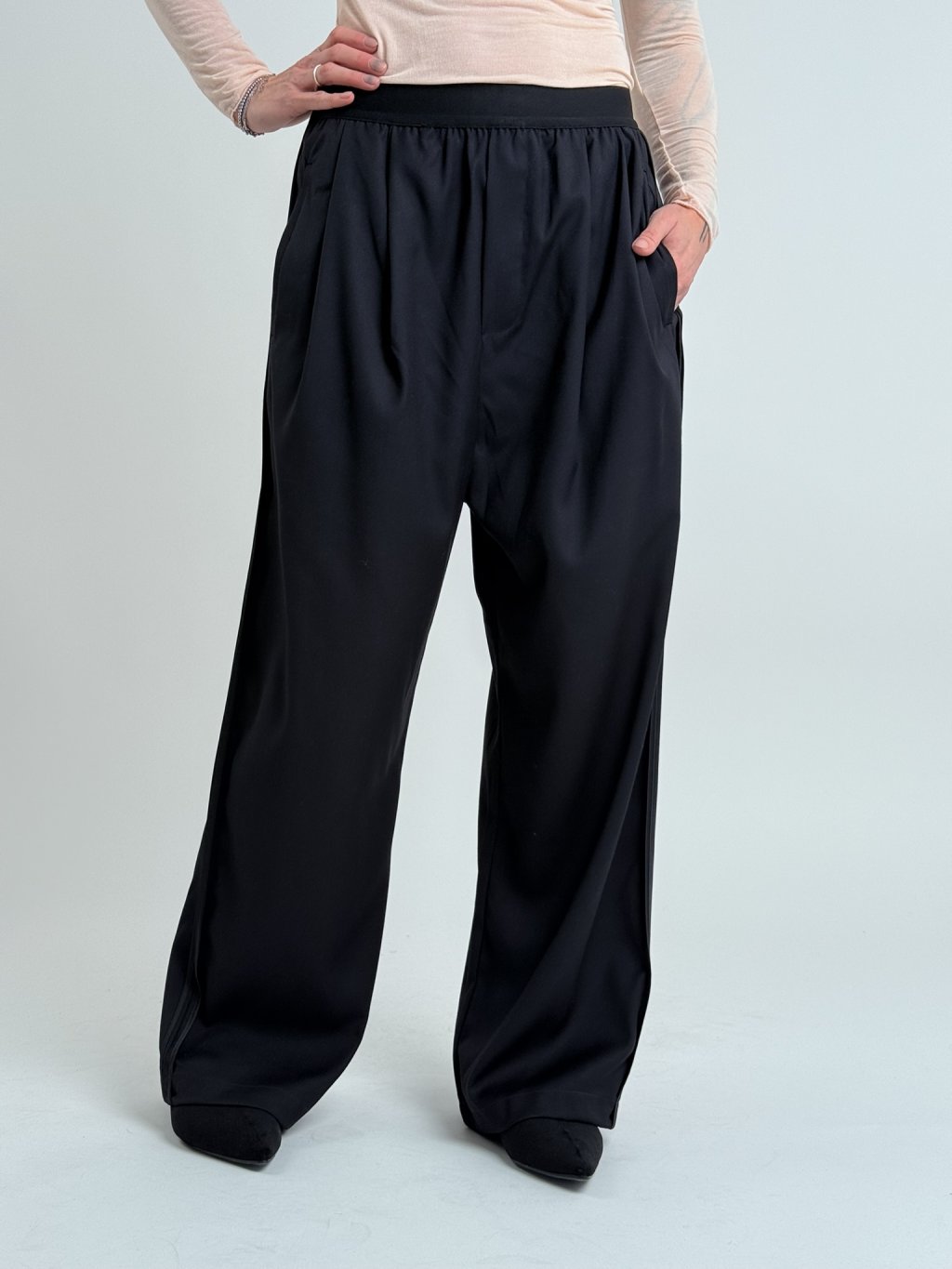 Dokonalé, širší kalhoty, v pase s gumou, po stranách s lampasy v barvě a postranními kapsami.