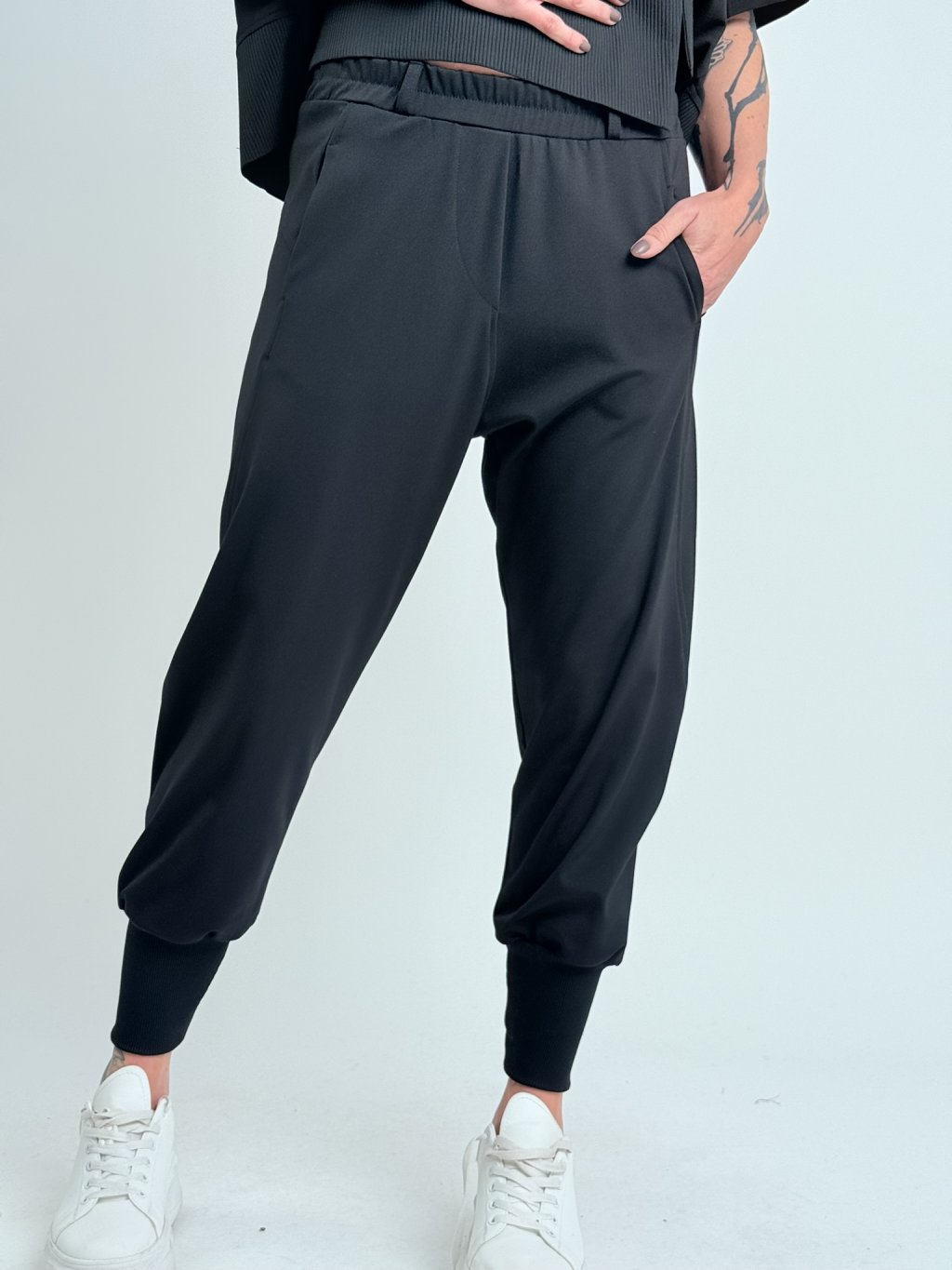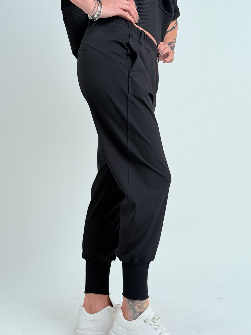 Luxusní oblíbené kalhoty s vysokými náplety na nohavicích. V pase na gumu, postranními všitými kapsami.