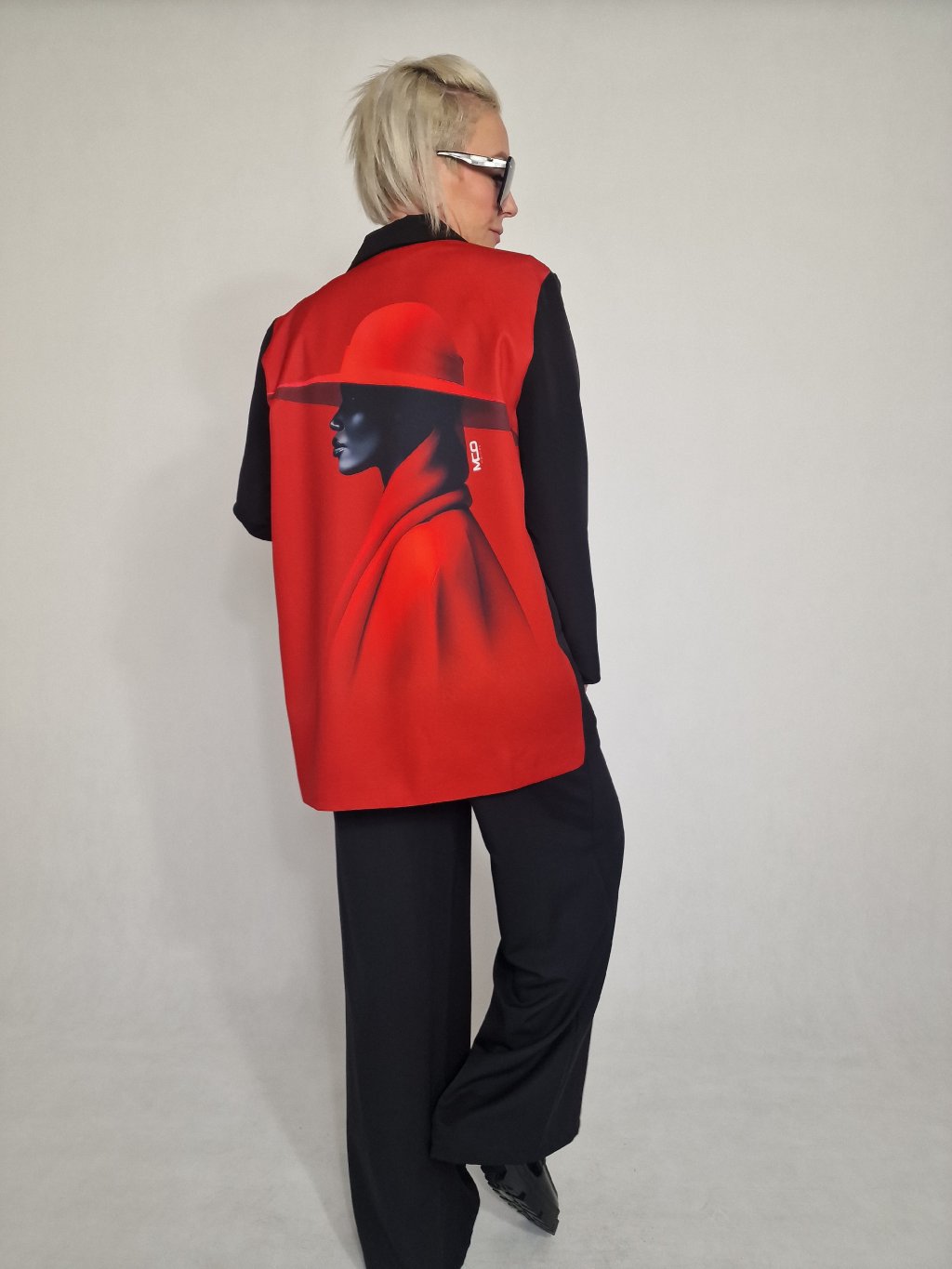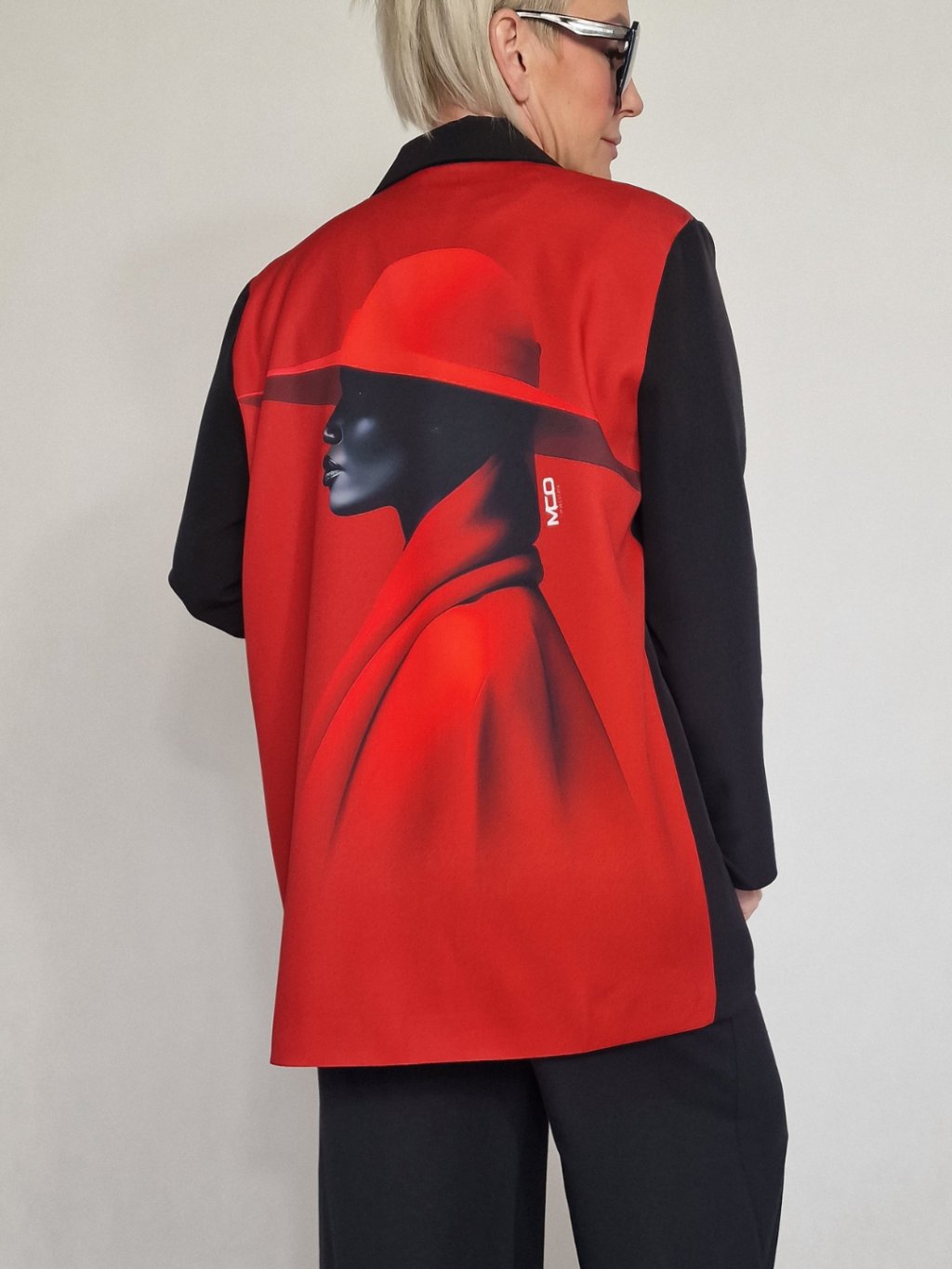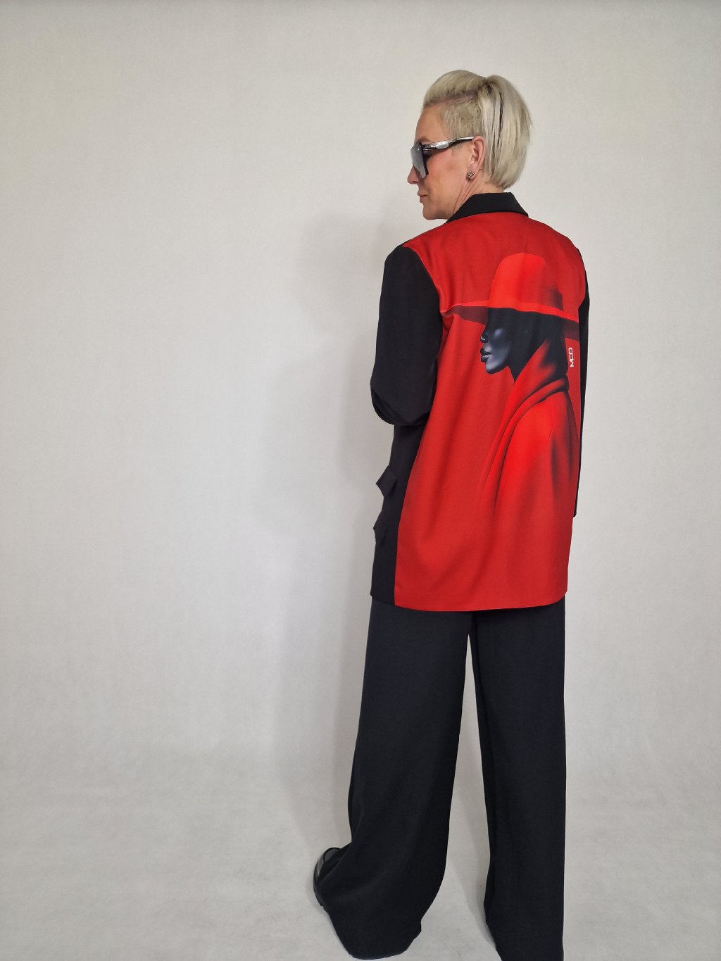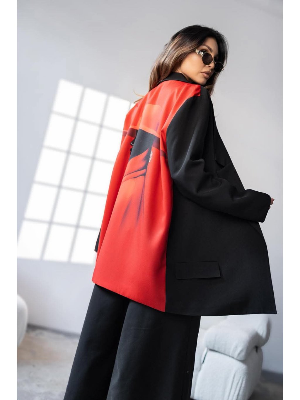 Elegantní, oversize sako s podšívkou, bez zapínání a s barevným obrázkem na zádech.