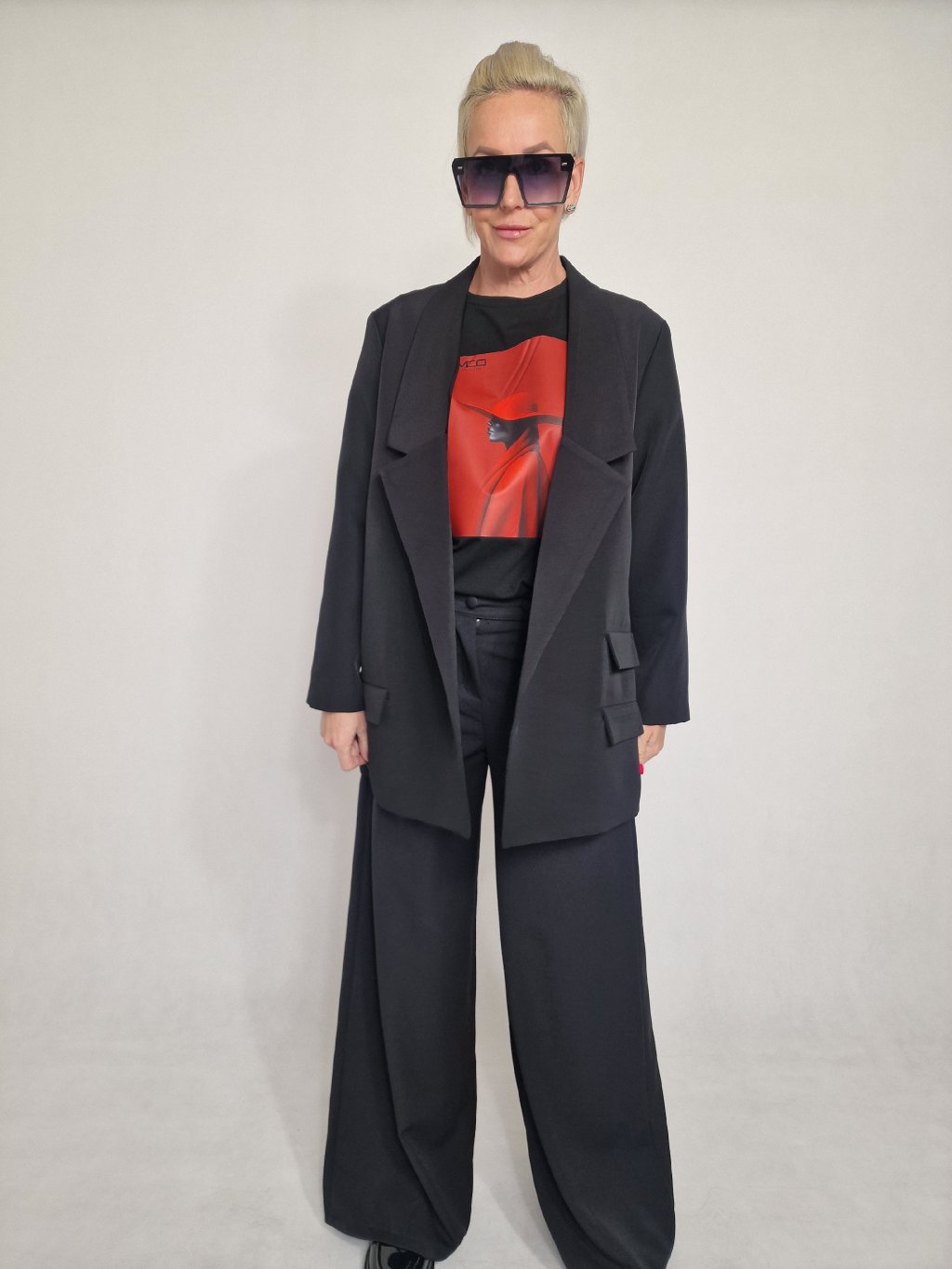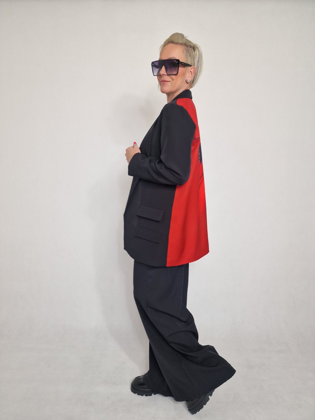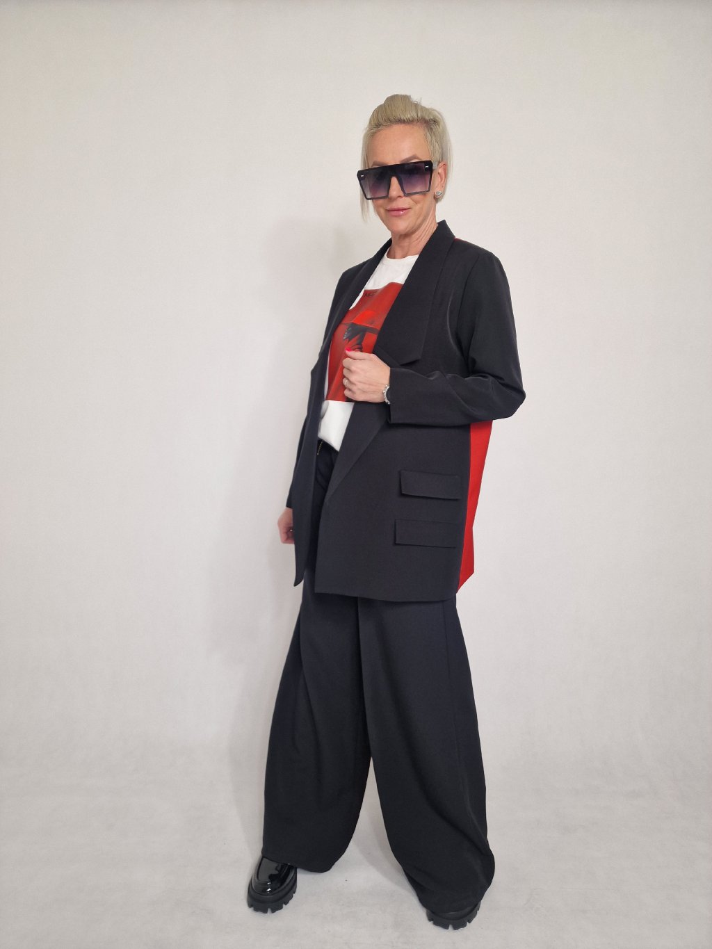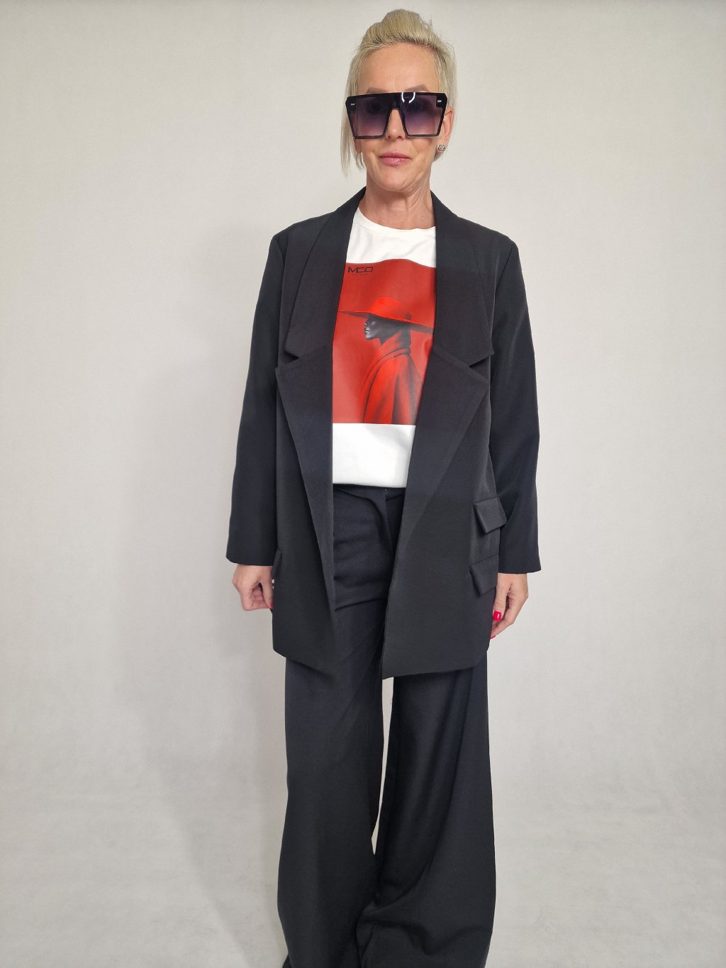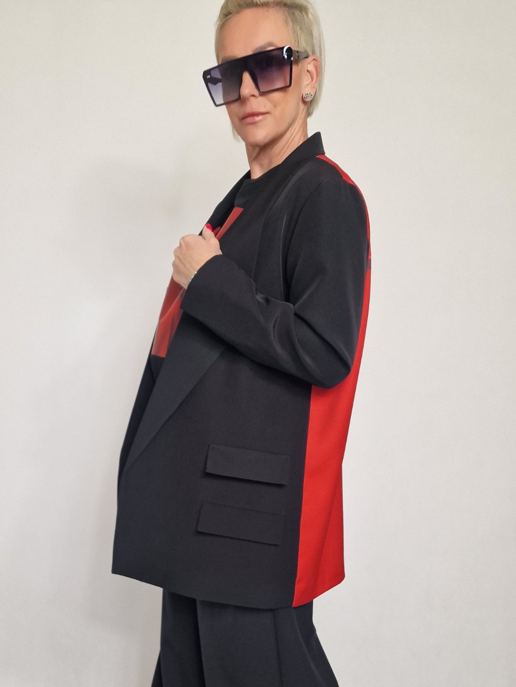 Elegantní, oversize sako s podšívkou, bez zapínání a s barevným obrázkem na zádech.