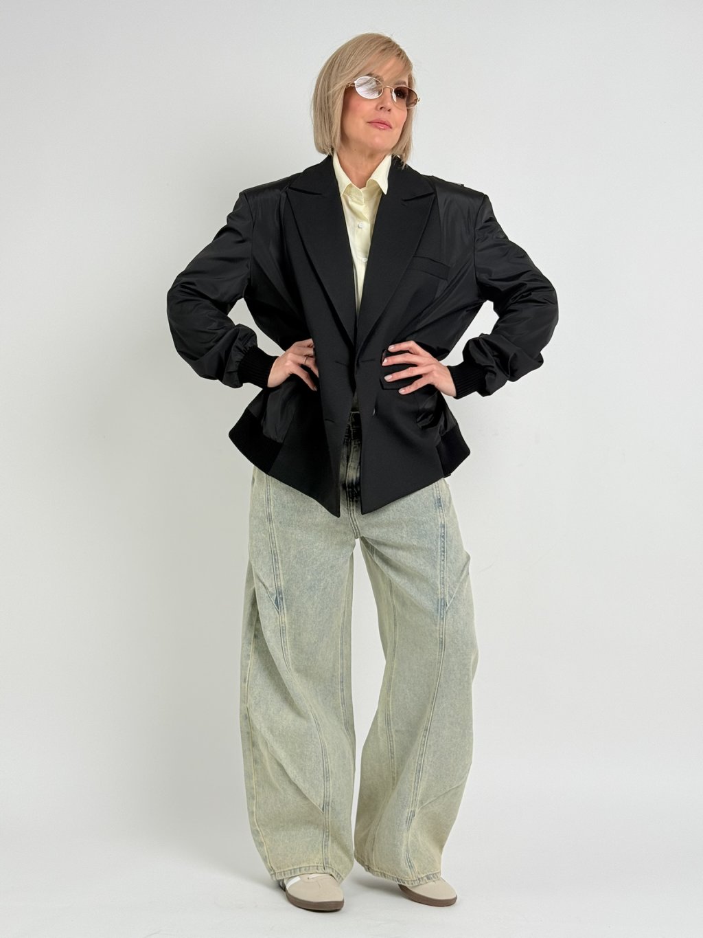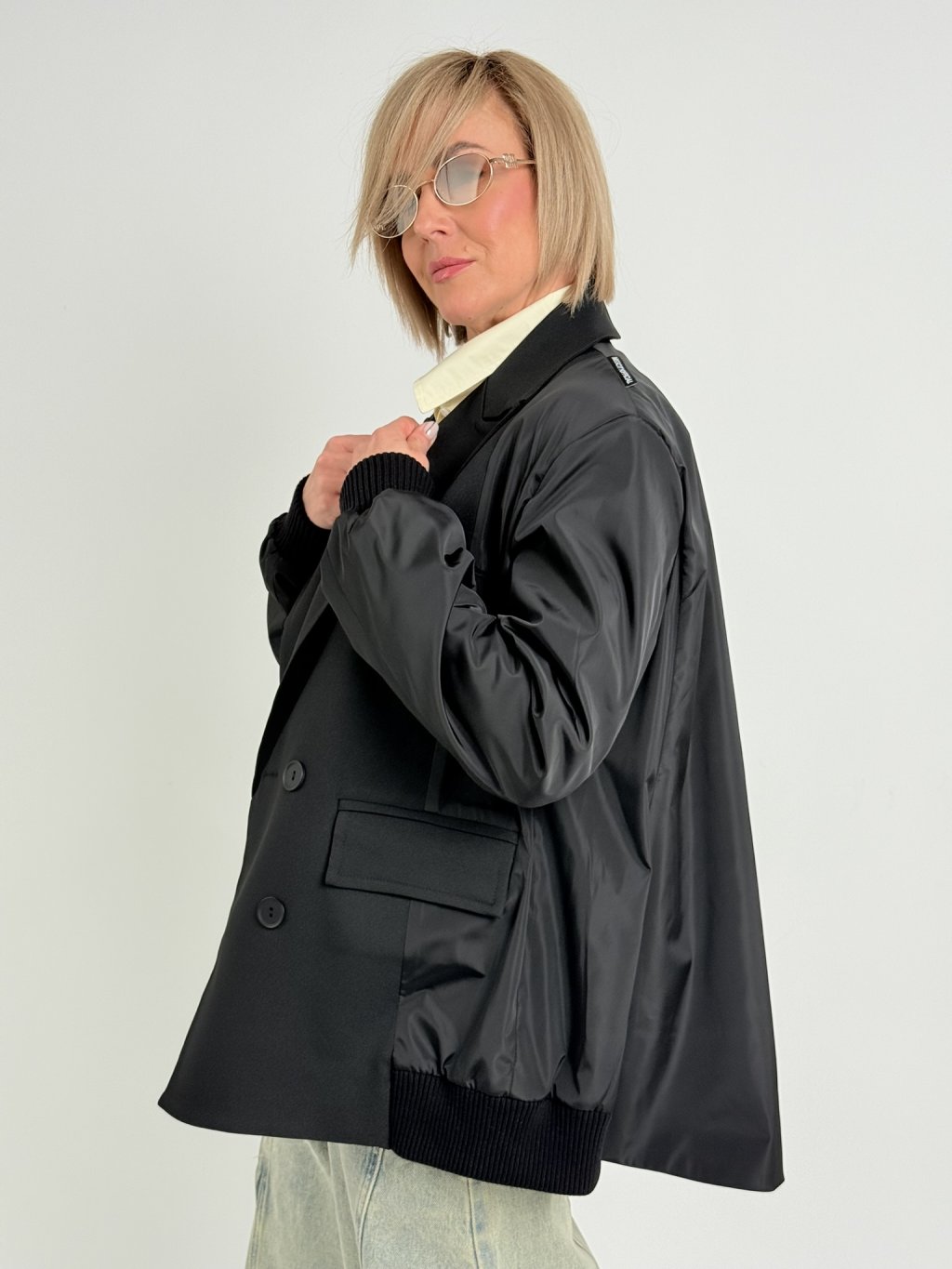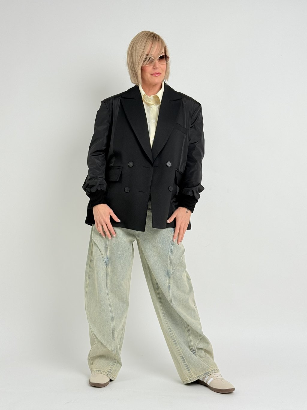 Luxusní, oversize sako s podšívkou, v kombinaci se šusťákem, náplety na rukávech a po stranách na dolním okraji saka.