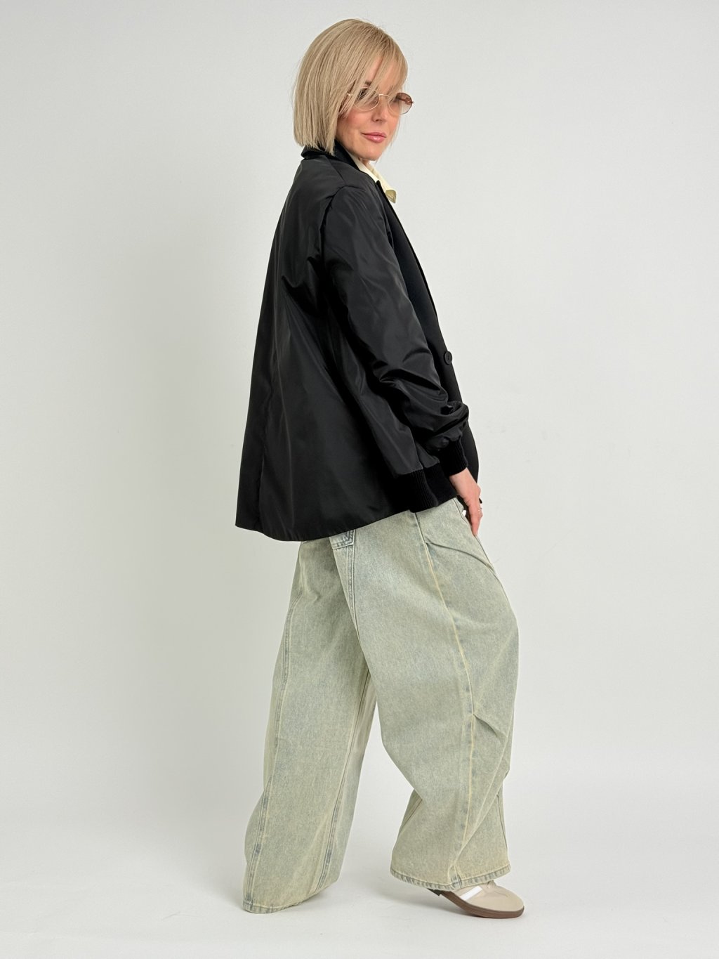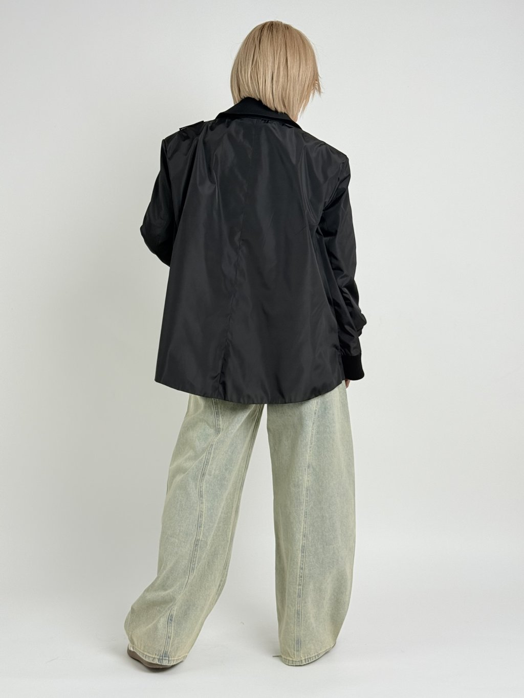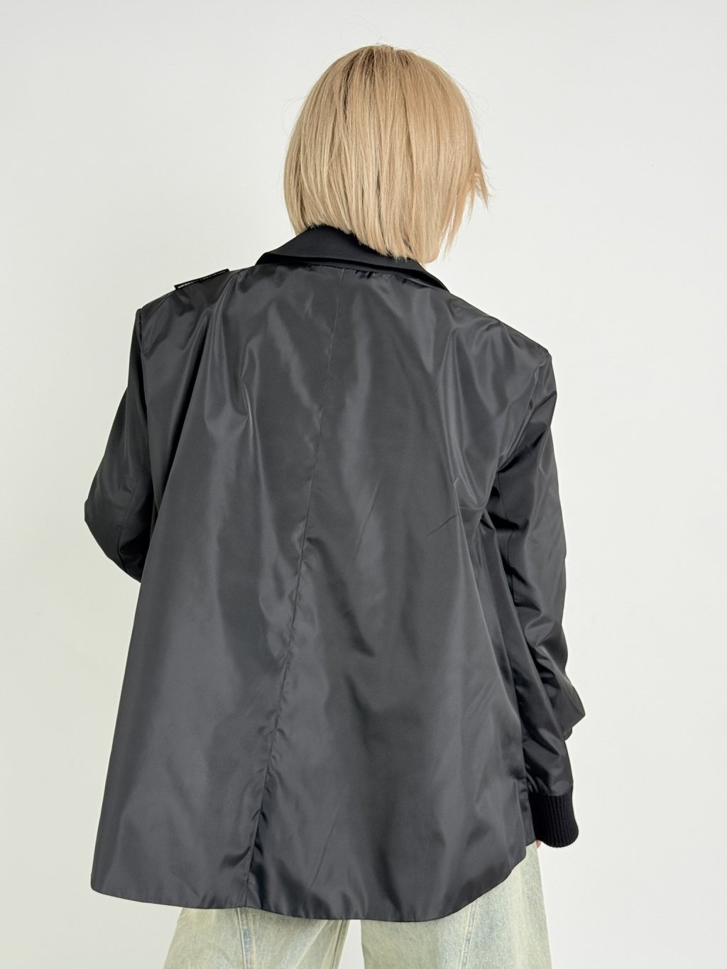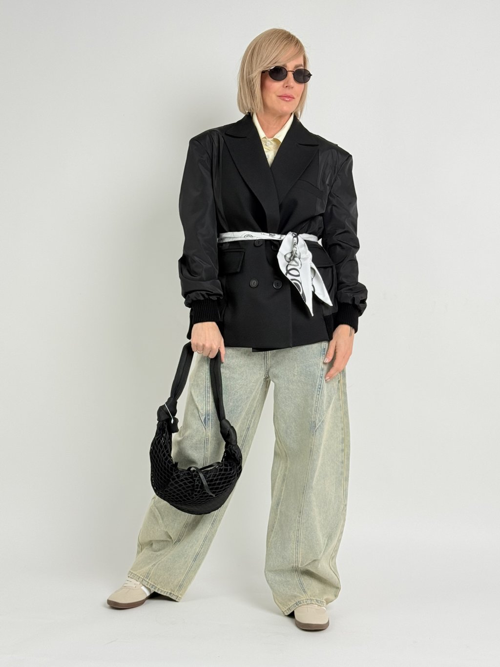 Luxusní, oversize sako s podšívkou, v kombinaci se šusťákem, náplety na rukávech a po stranách na dolním okraji saka.