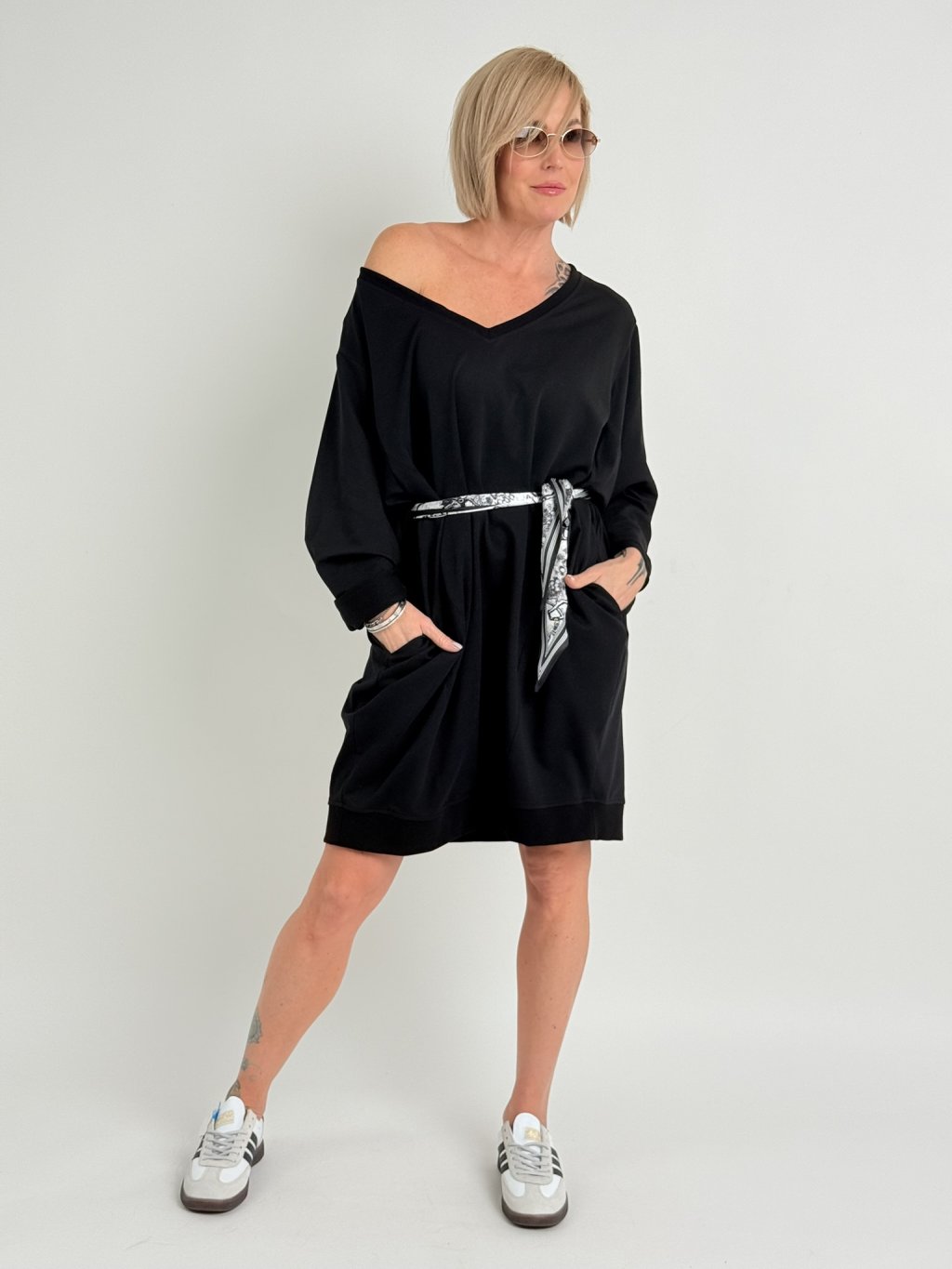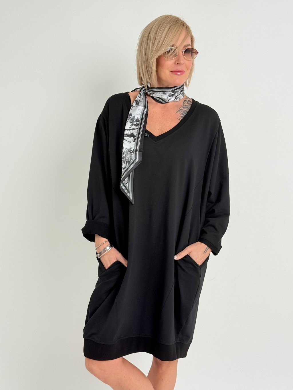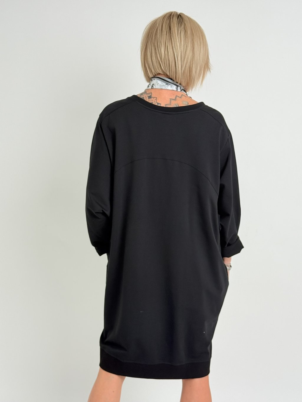 Černé šaty z bavlněného úpletu s netopýřími rukávy, výstřihem do V a postranními kapsami.