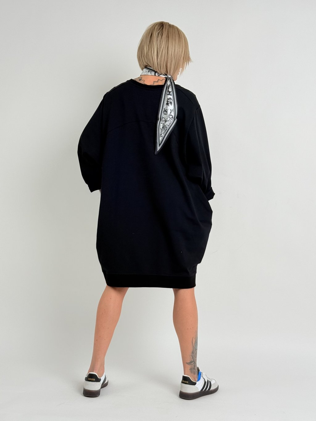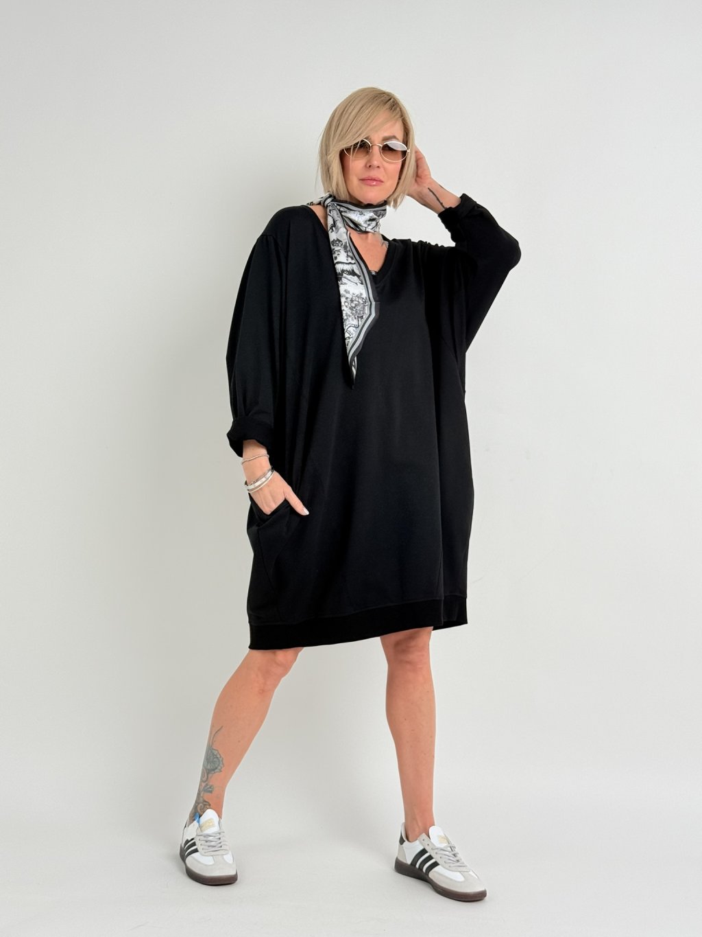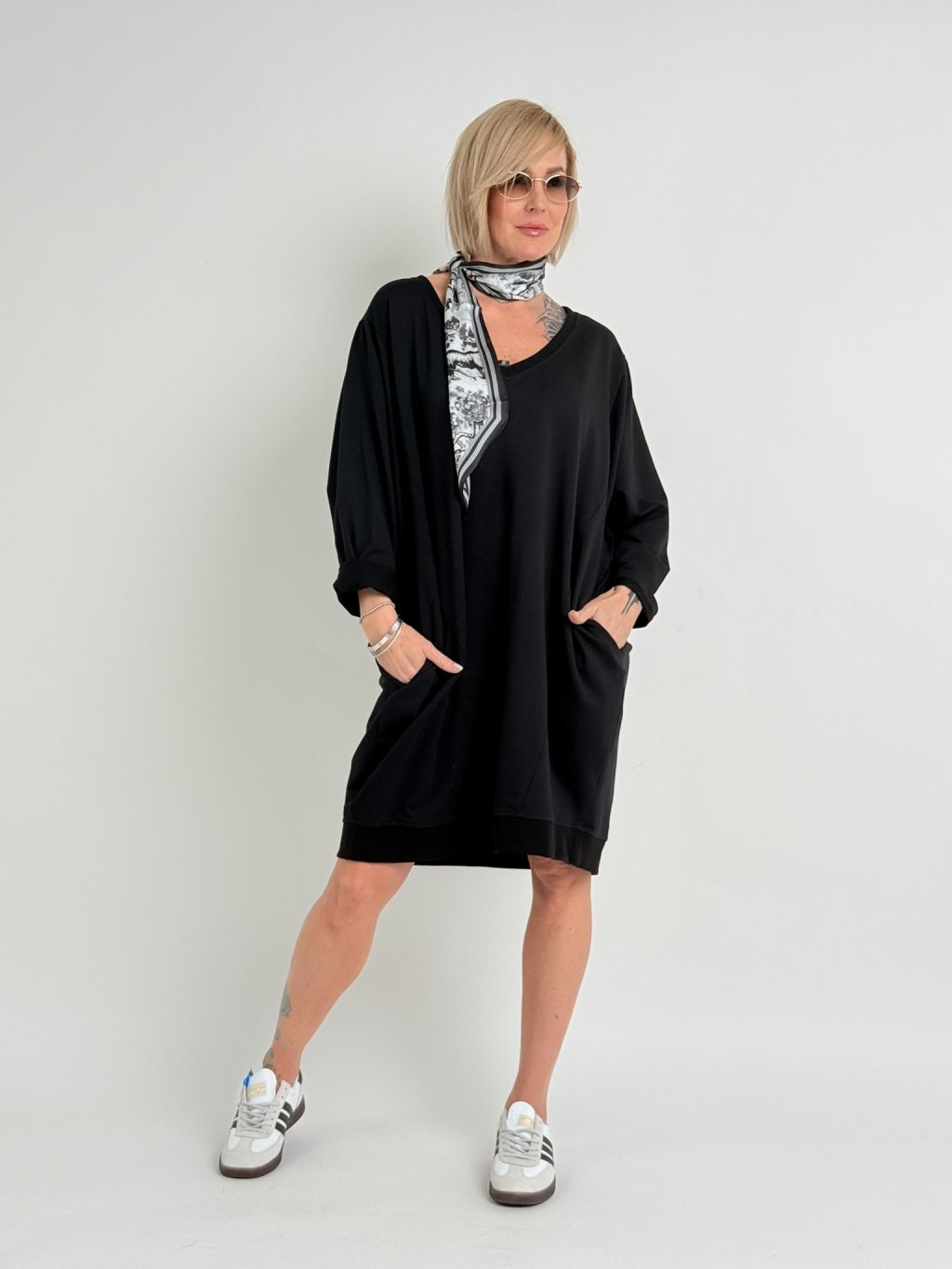 Černé šaty z bavlněného úpletu s netopýřími rukávy, výstřihem do V a postranními kapsami.