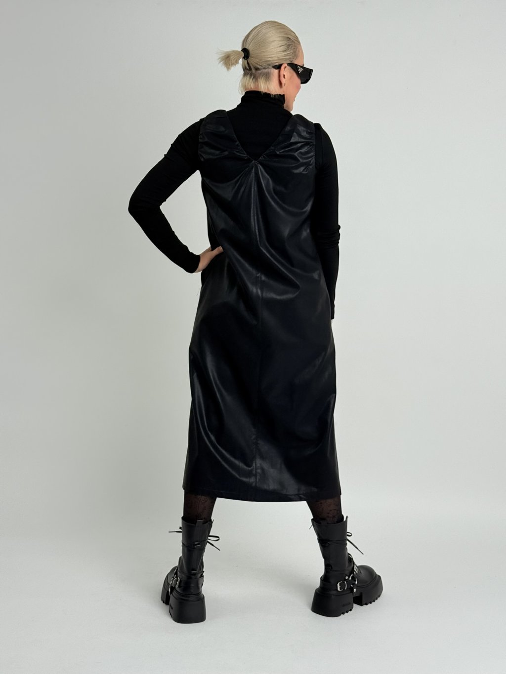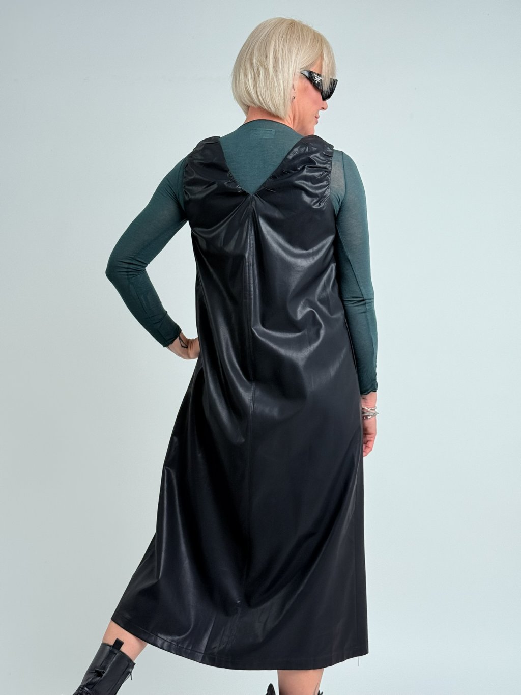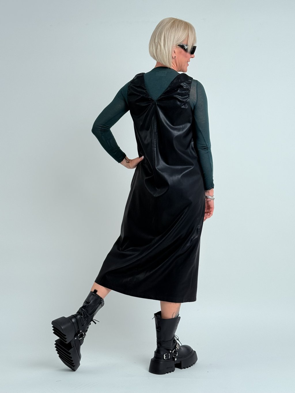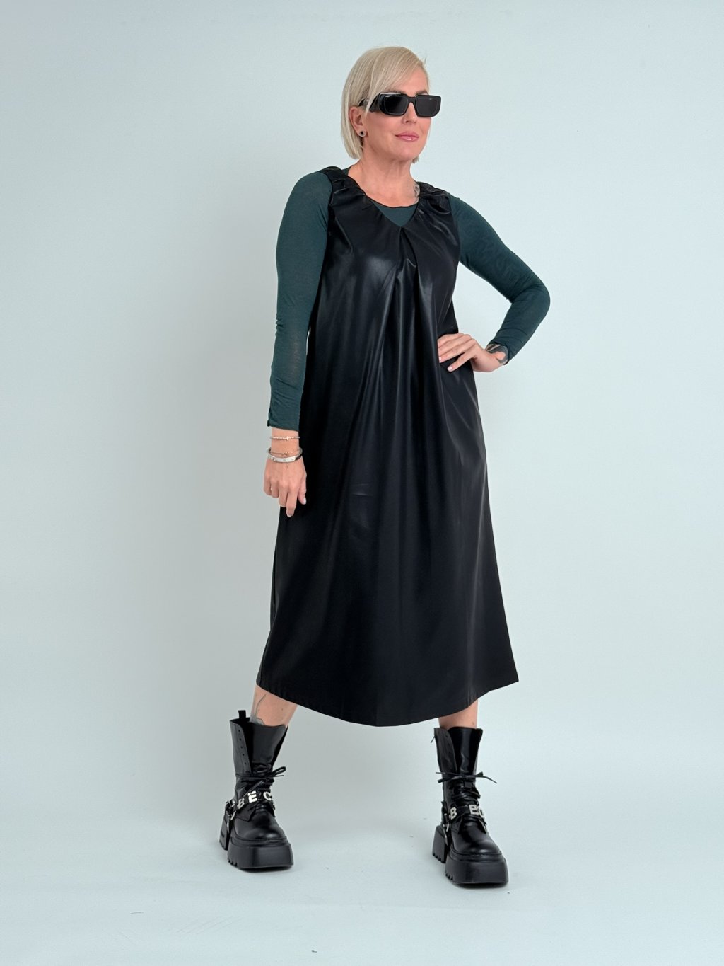 Jednoduché šaty v koženkovém vzhledu, s výstřihem do V, s postranním zipem, pro pohodlnější oblékání. Super s páskem i bez.