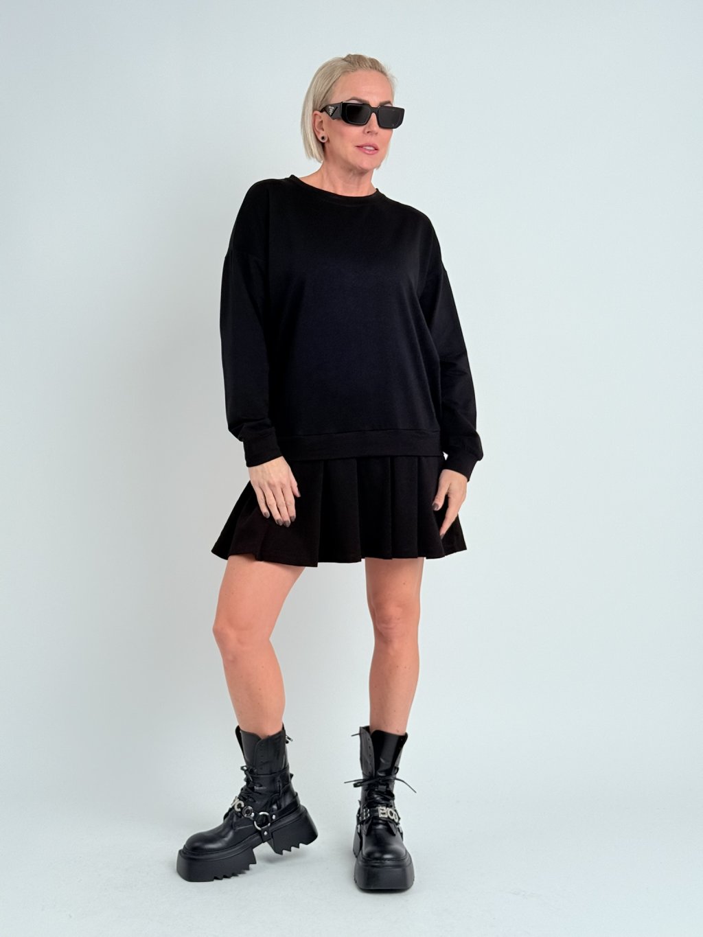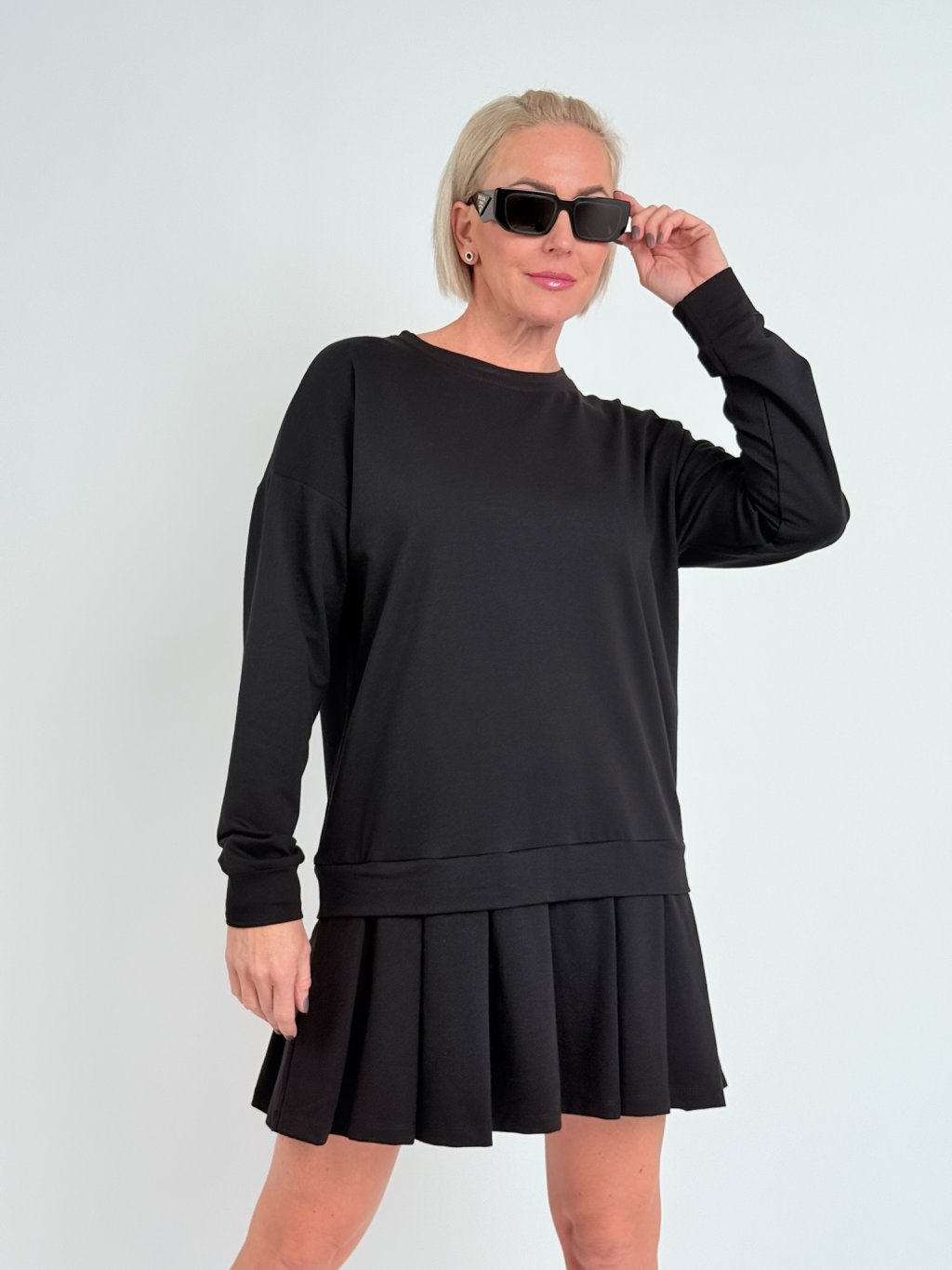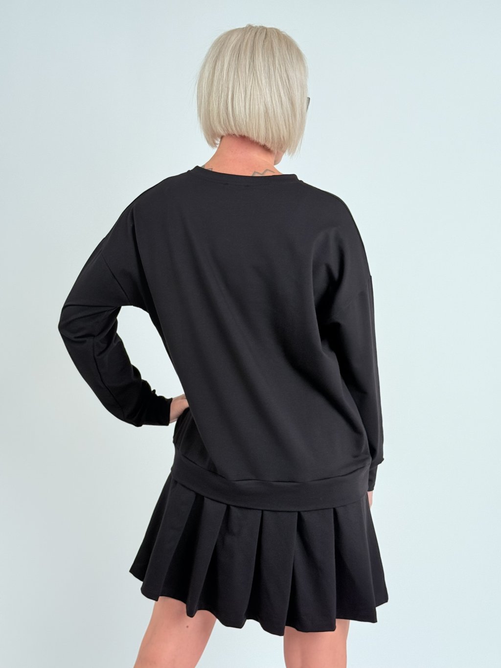 Příjemné, bavlněné, oversize, lehce pružné šaty se skládanou sukní a dlouhým rukávem.