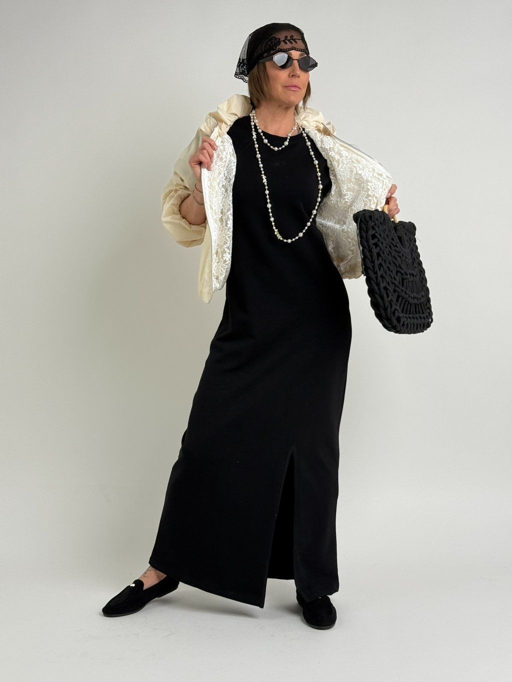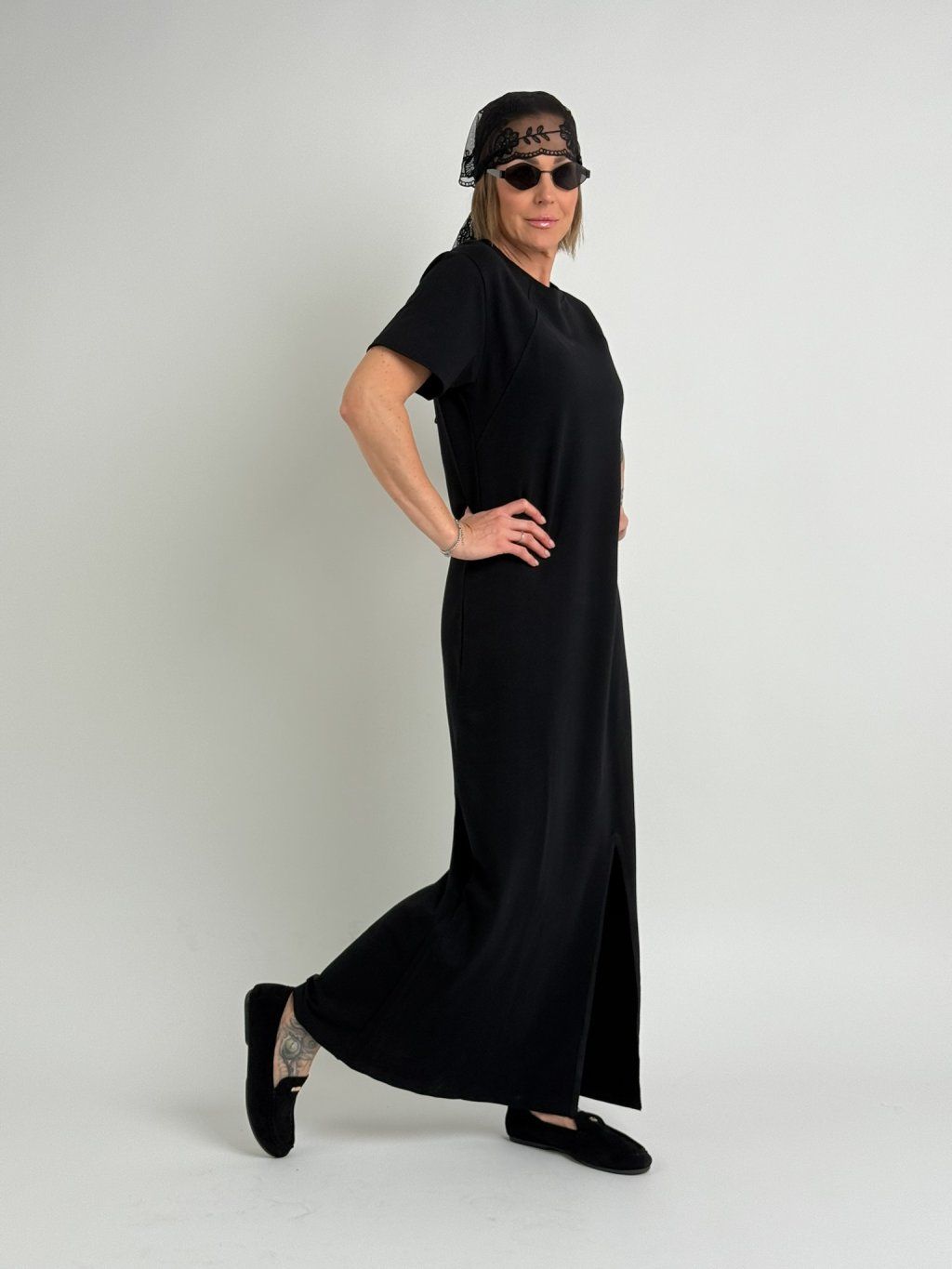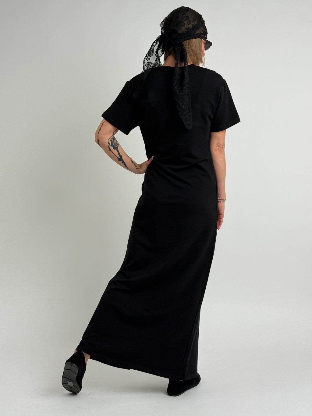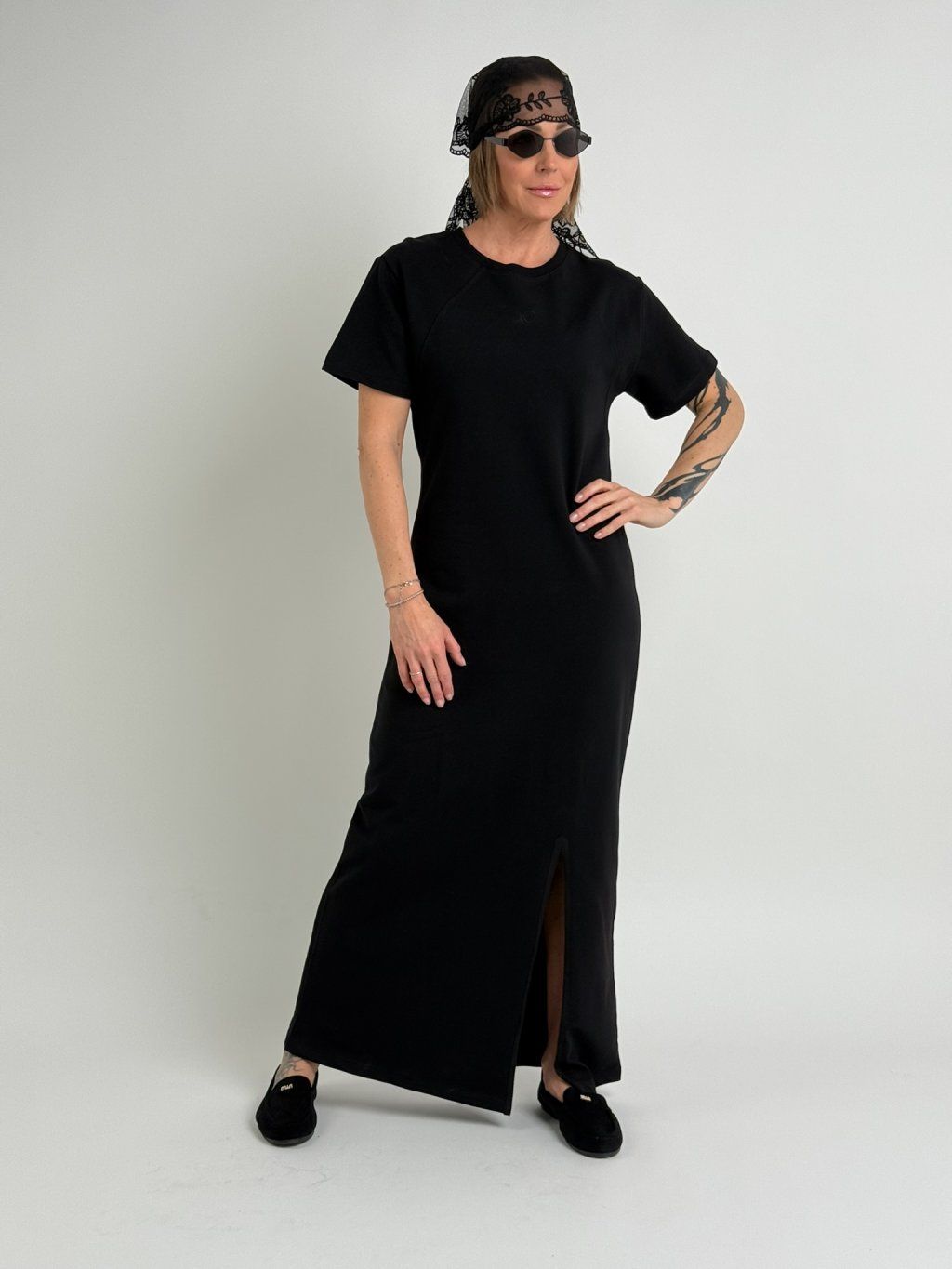 Jednoduché, bavlněné, dlouhé šaty s rozparkem, krátkým rukávem a drobnou výšivkou pod výstřihem.