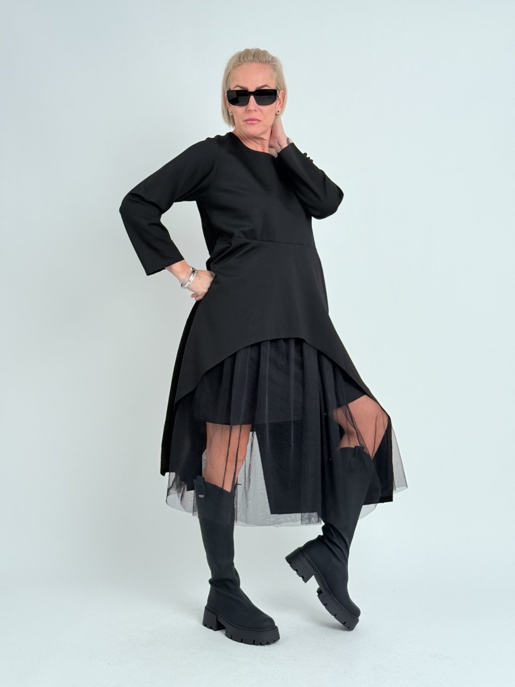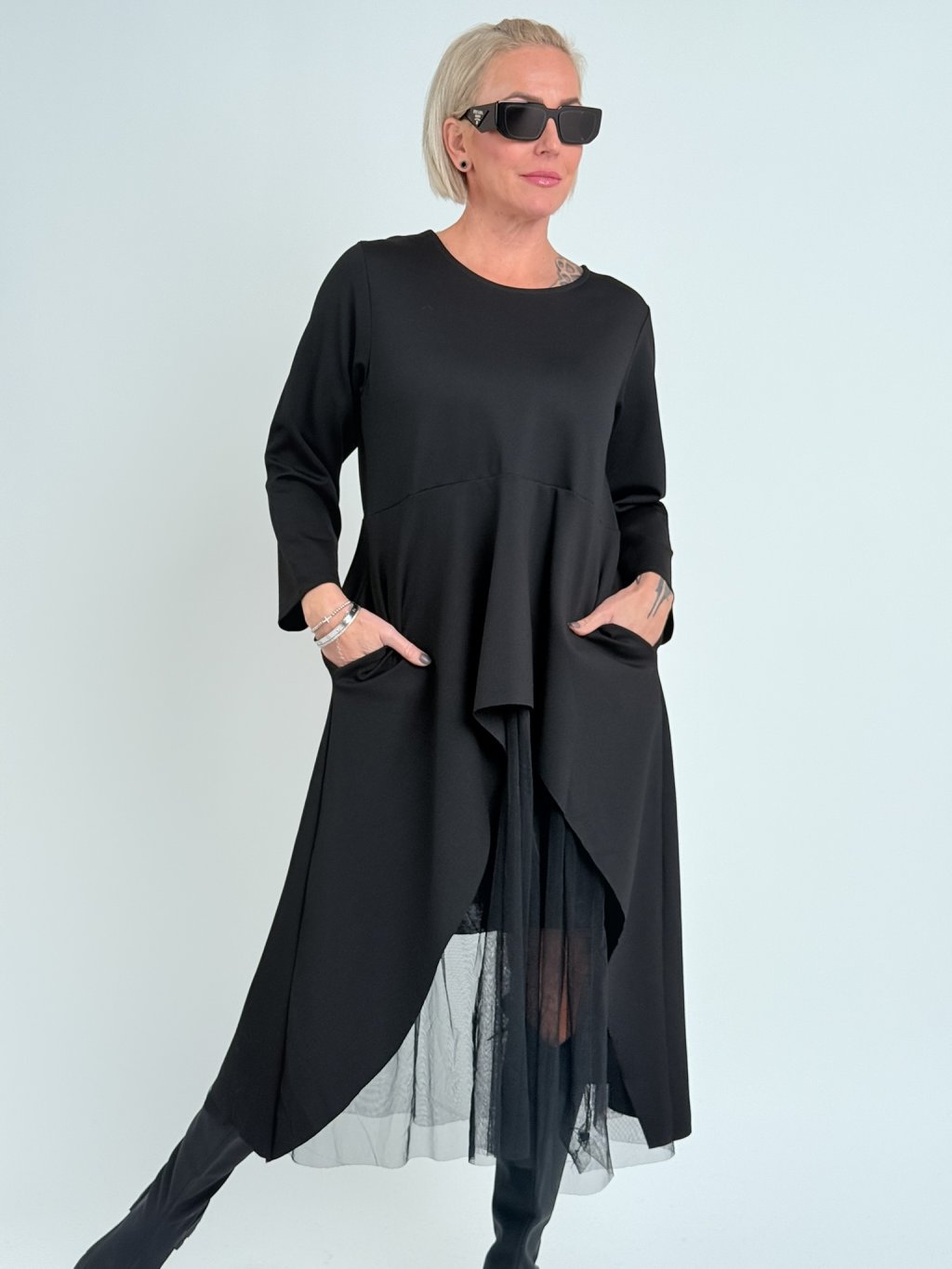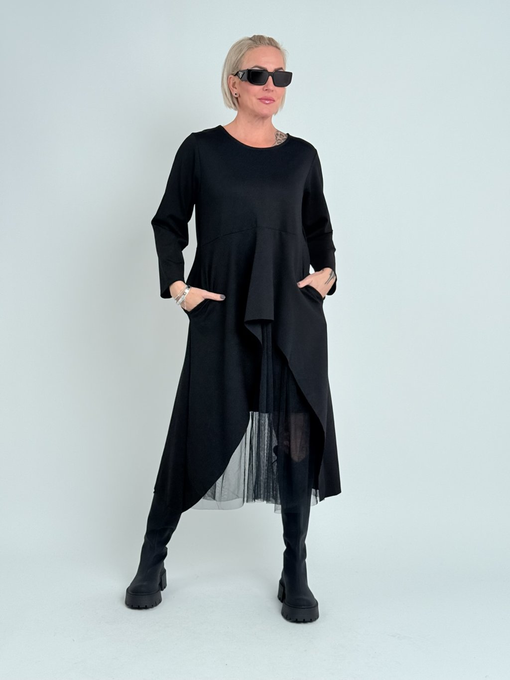 Zajímavě řešené šaty z bavlněného upletu , kombinované s tylem, s dlouhým rukávem a postranními kapsami.