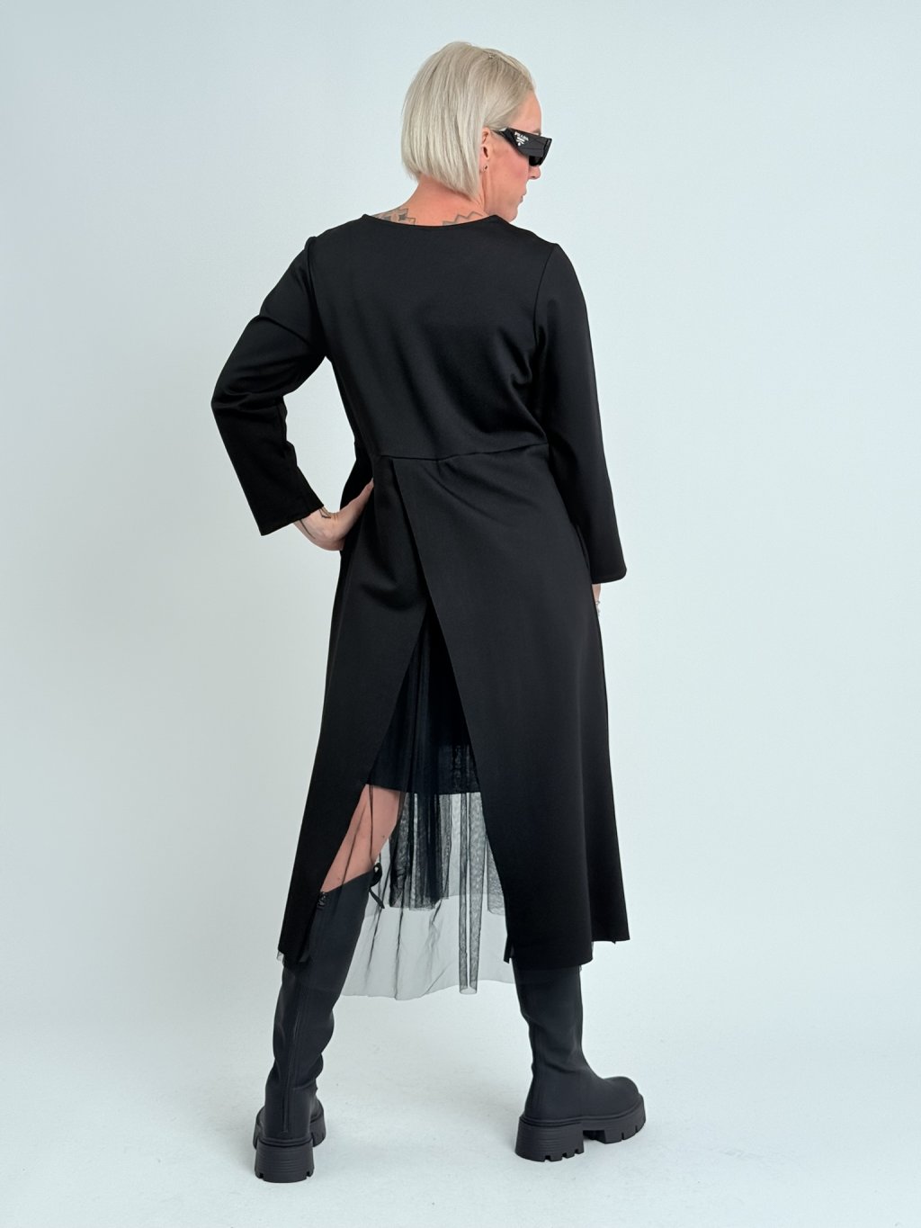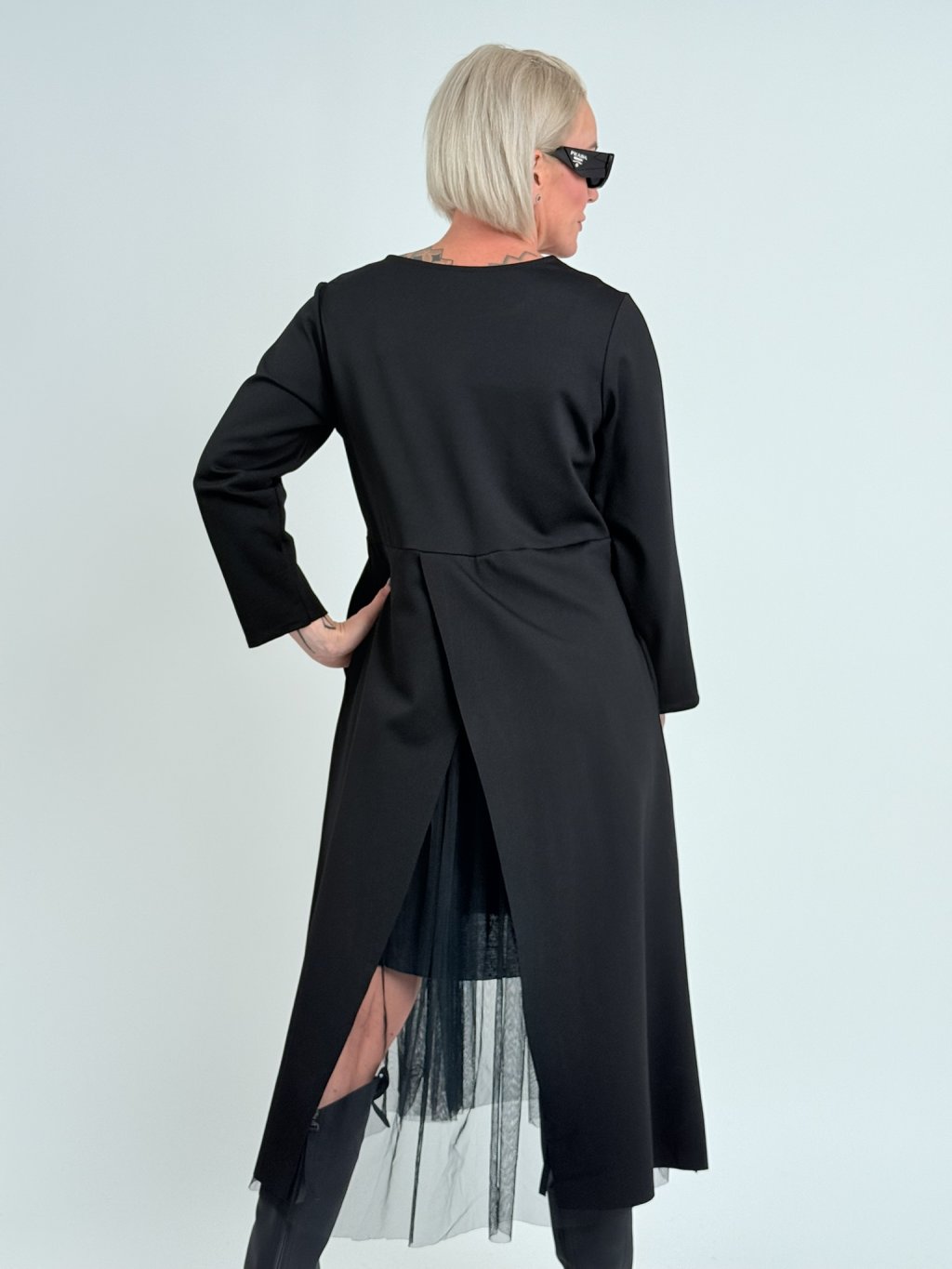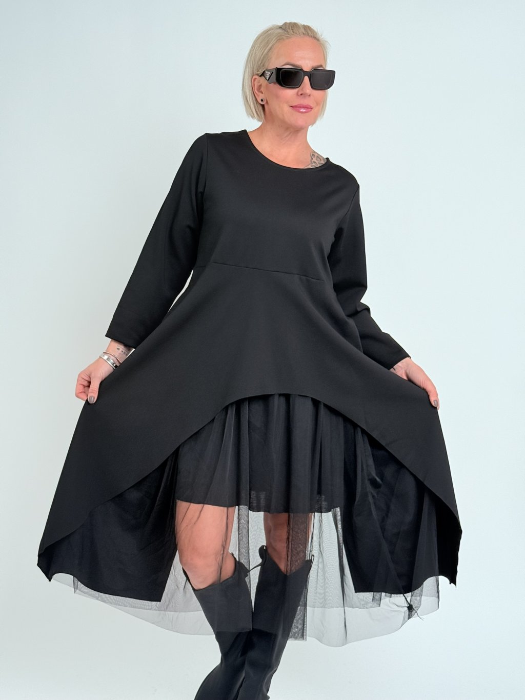 Zajímavě řešené šaty z bavlněného upletu , kombinované s tylem, s dlouhým rukávem a postranními kapsami.