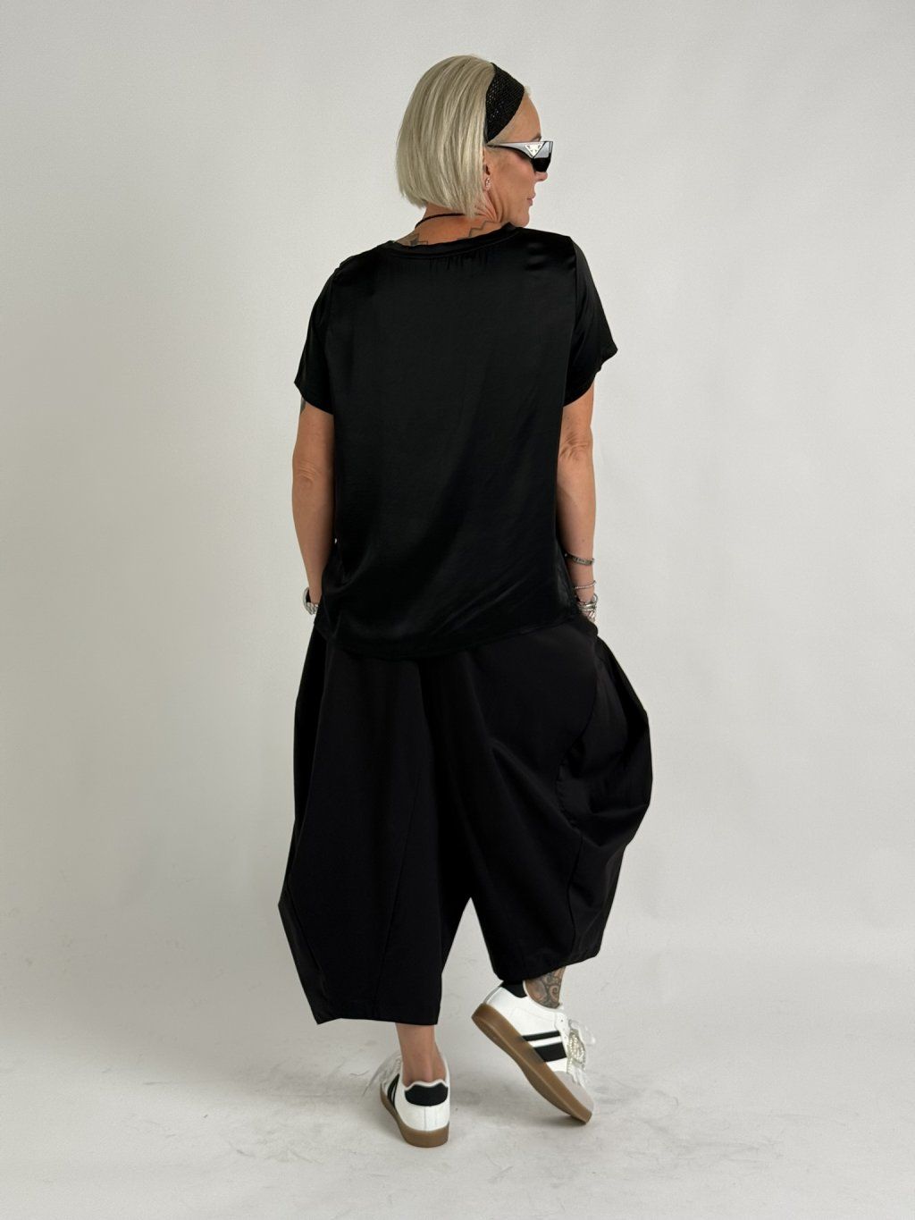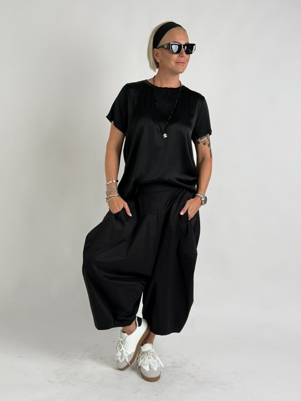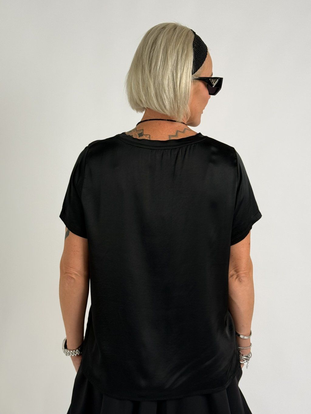 Jednoduchá, saténová, pružná halenka s krátkým rukávem a kulatým výstřihem. Super ke kalhotám, sukní i džínům.