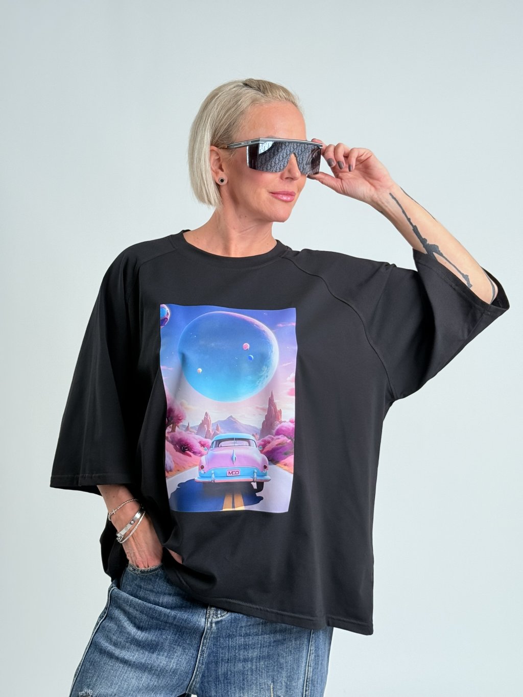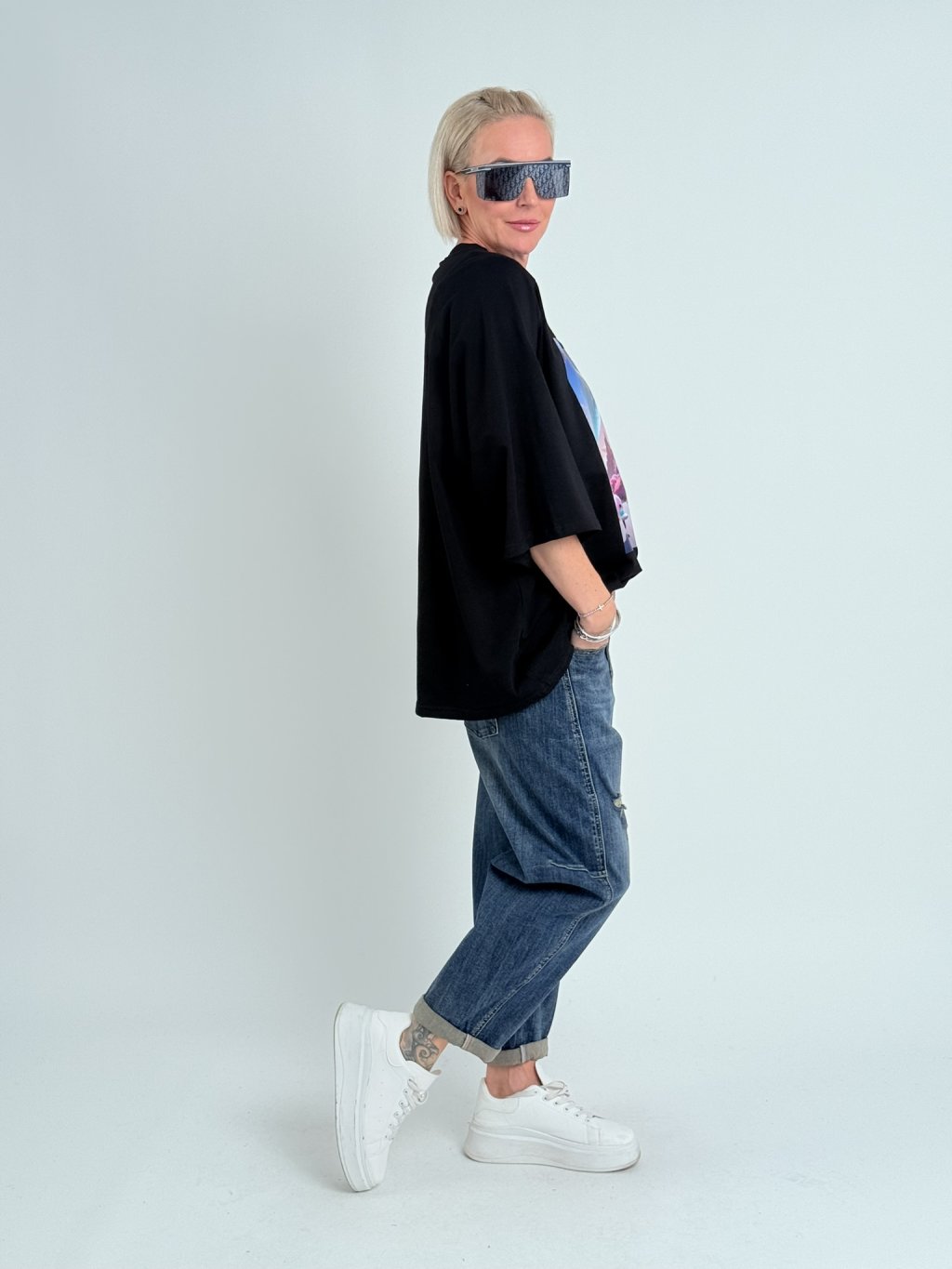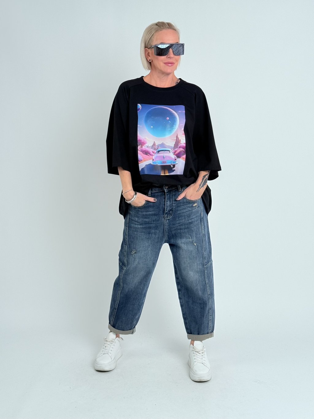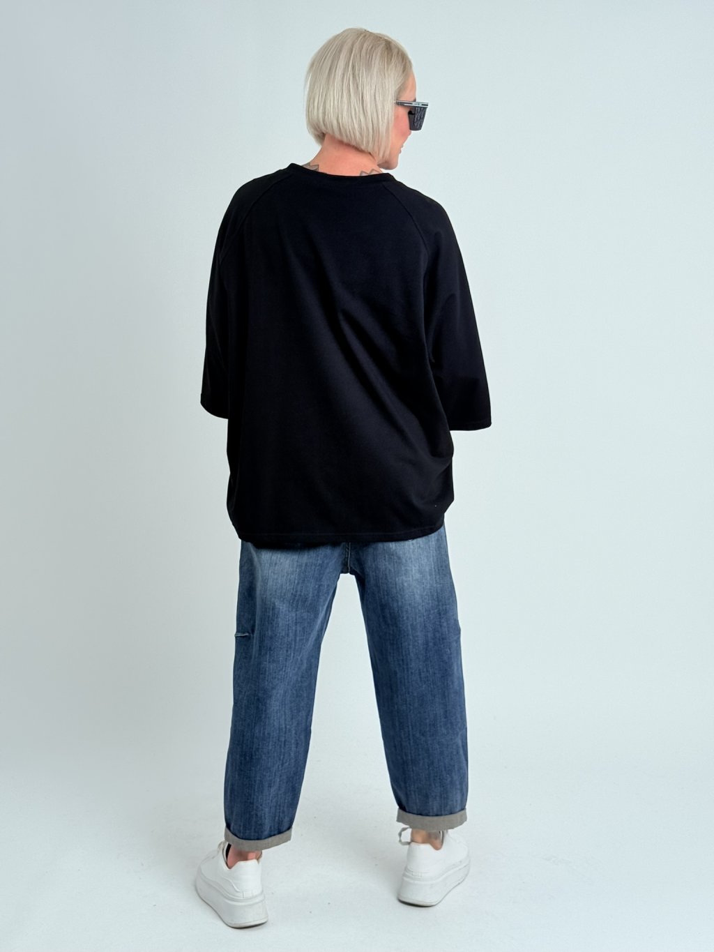 Super oversize, delší triko s kulatým výstřihem, rukávem k lokti a potiskem na předním dílu.