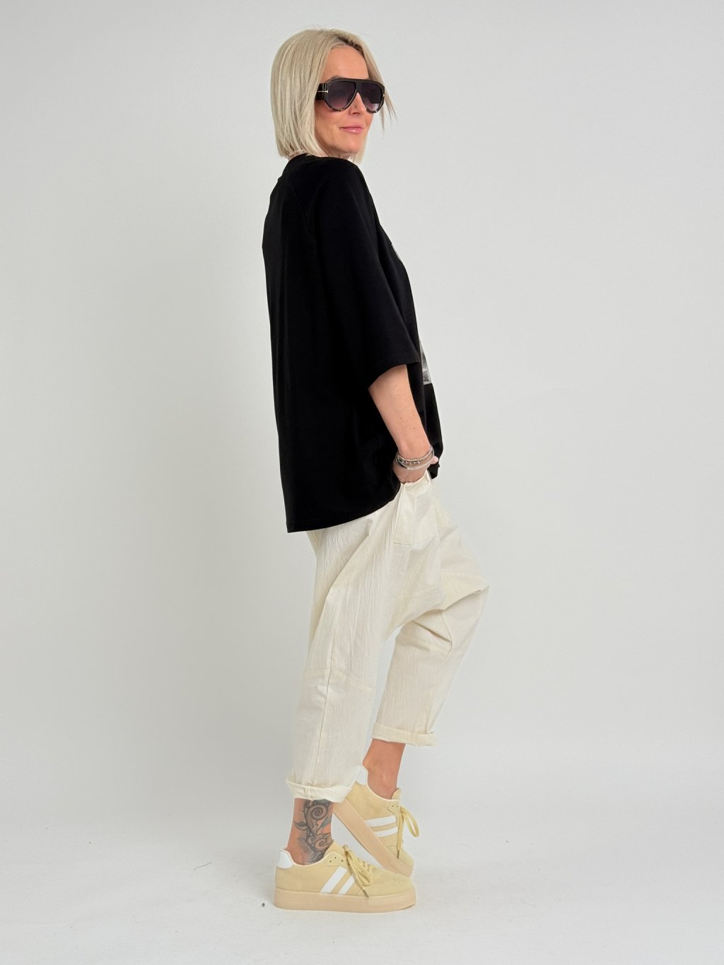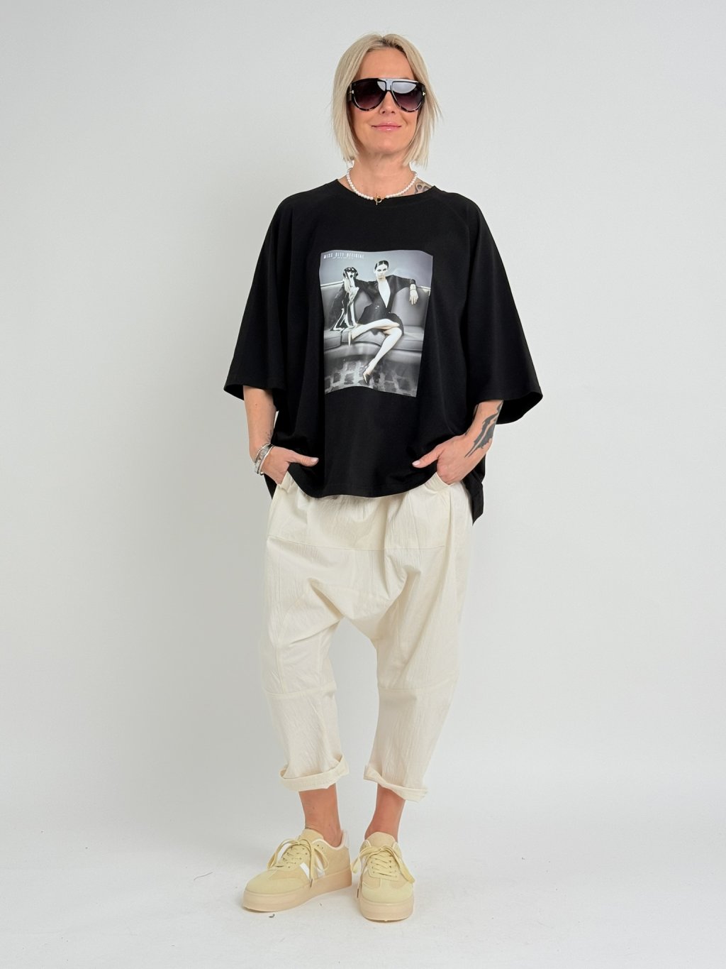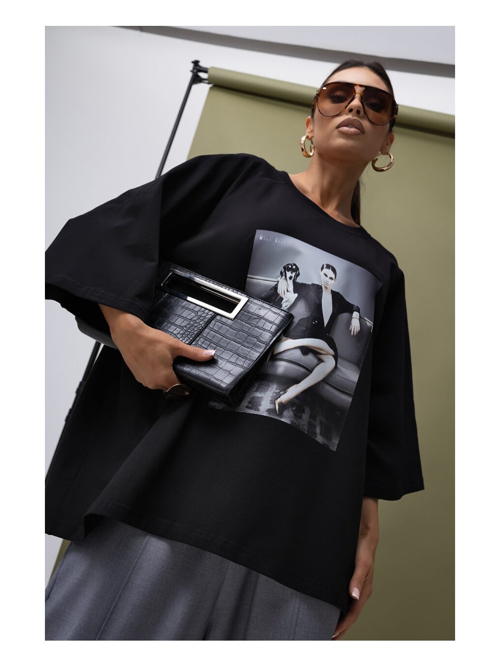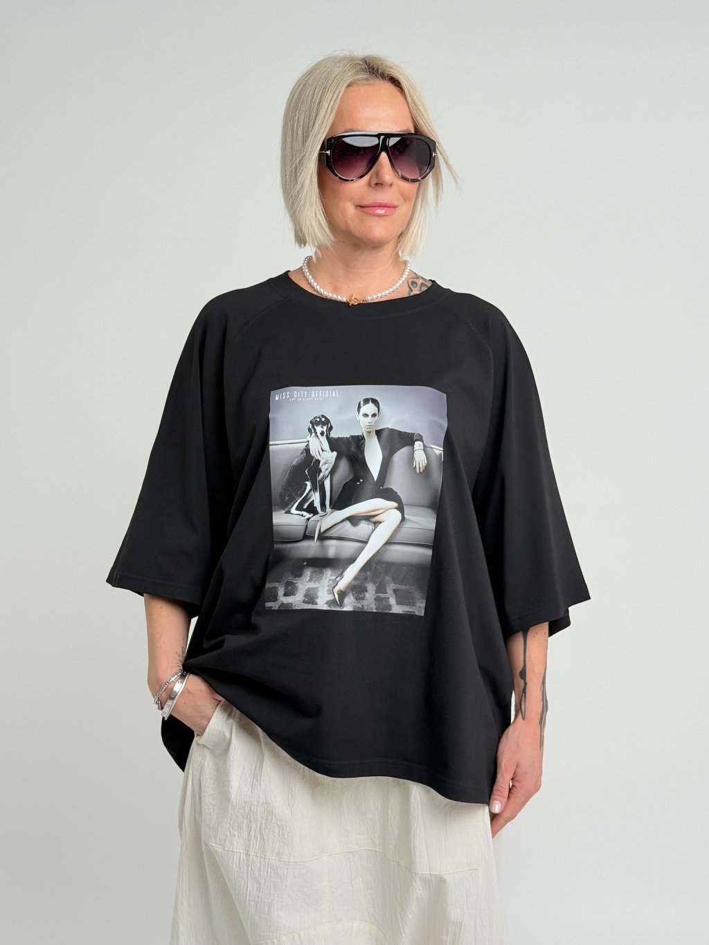 Super, oversize, delší triko s kulatým výstřihem, rukávem k lokti obrázkem na předním dílu.