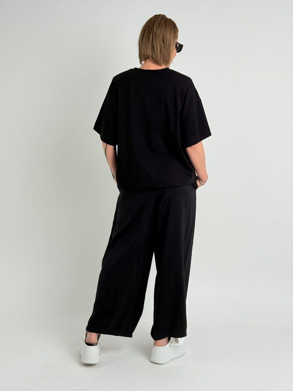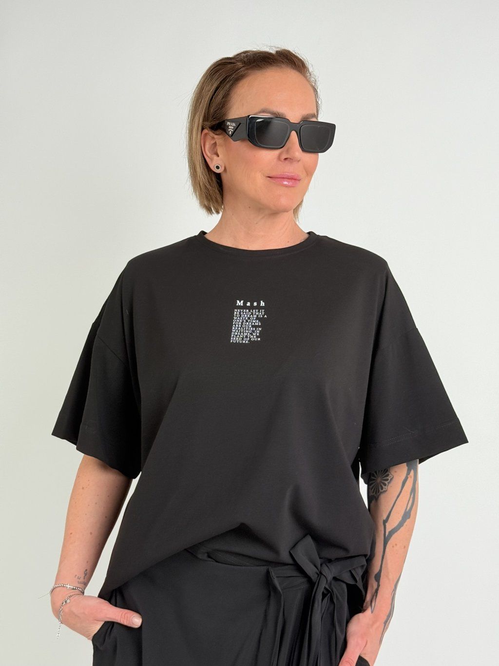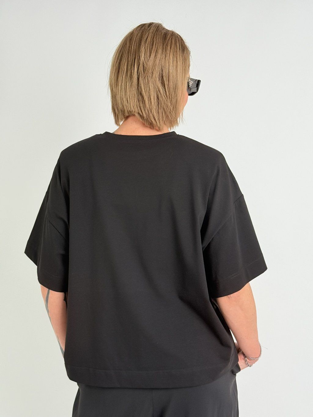 Oversize triko s kulatým výstřihem, rukávem k lokti, vycpávkami a drobným nápisem na předním dílu.